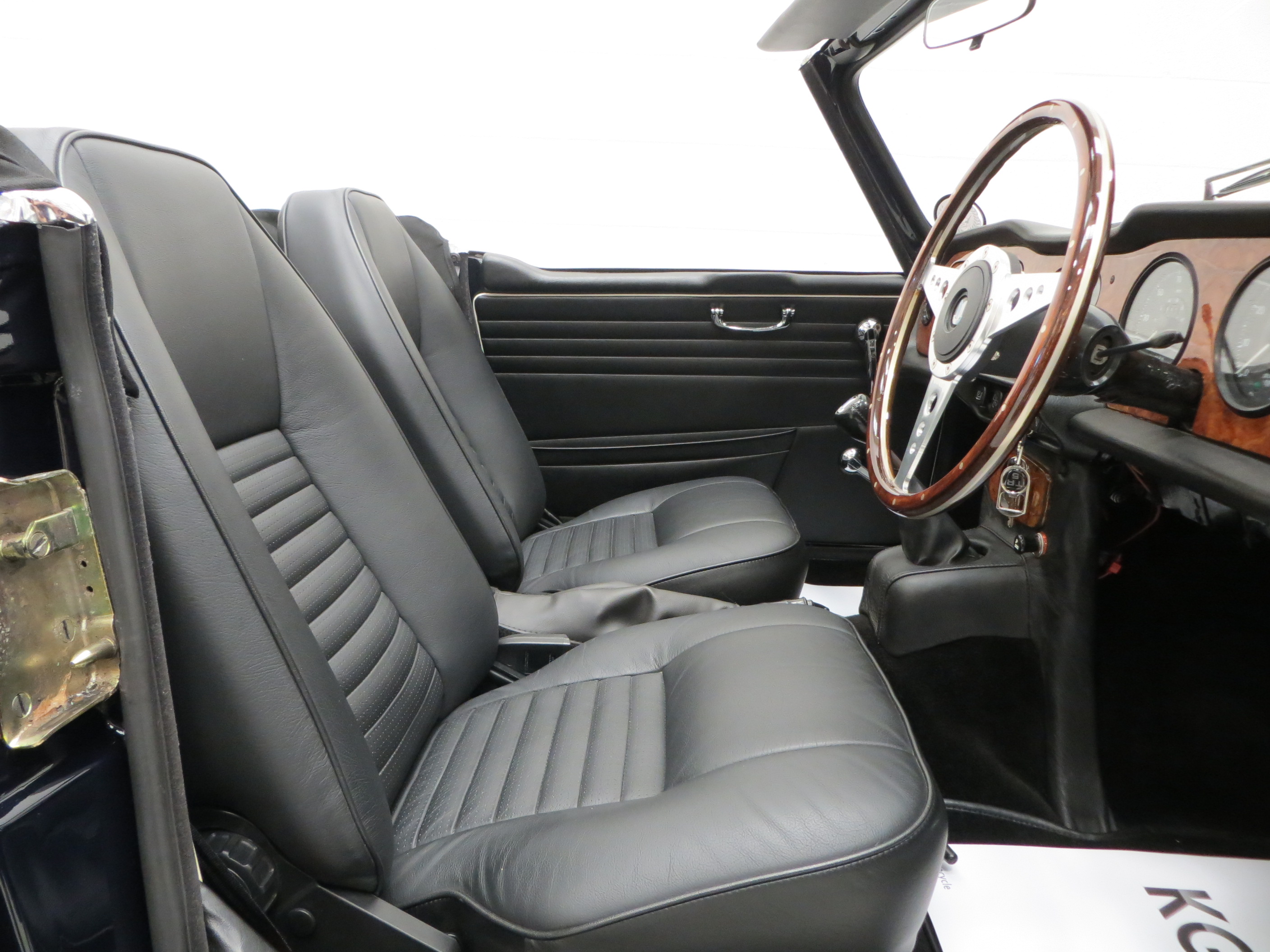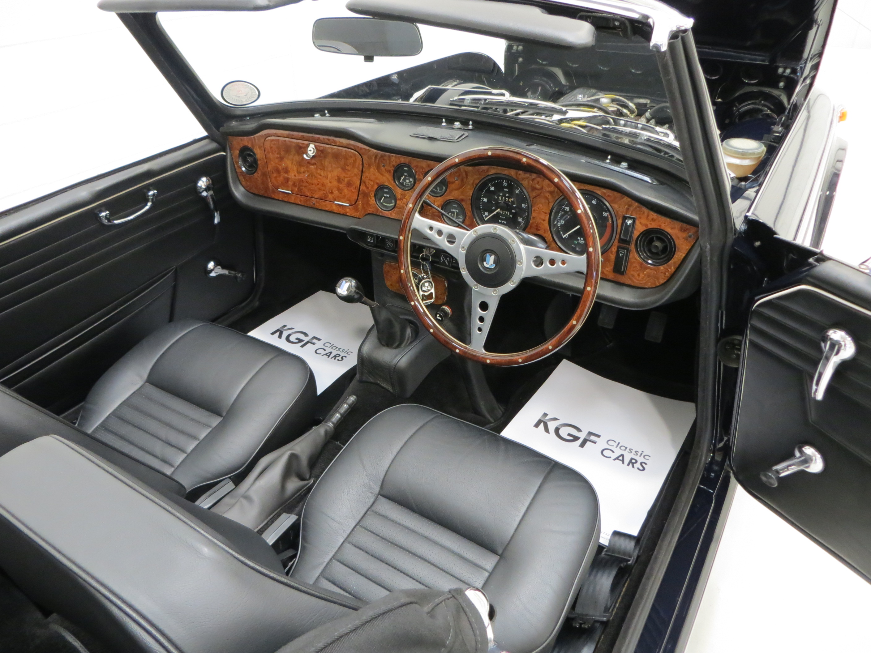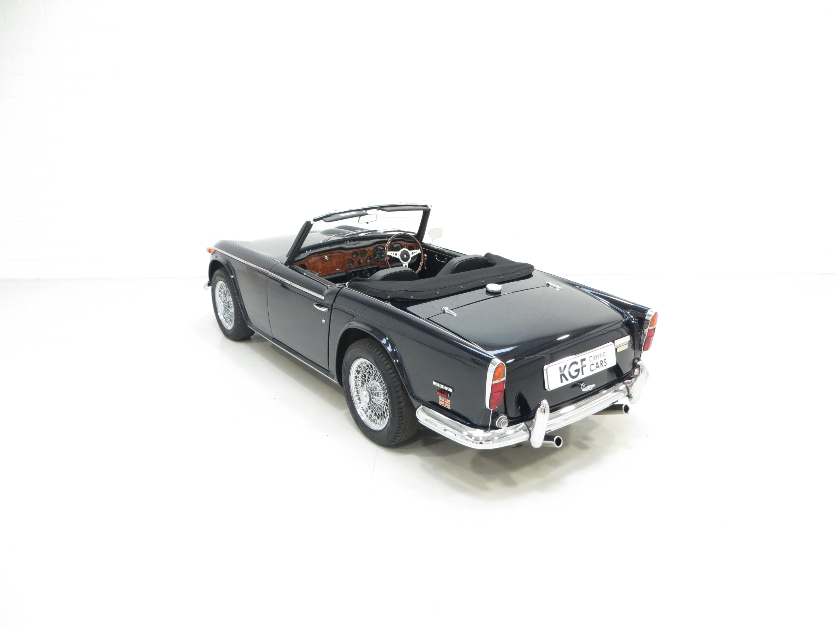 The lavishly padded cockpit remains finished in factory correct Black, (Code 11), and will please those wanting an immaculate TR cabin with all controls and gauges fully functioning. The clear and complete instrumentation is housed in a non-reflecting walnut facia undamaged and uniformly stained throughout. Rich carpeting with thick felt underlay combined with two deep shaped seats will allow comfortable long distance touring. A beautiful period wooden steering wheel has been added, electronic clock and 12v power outlet for convenience. Splendid.
