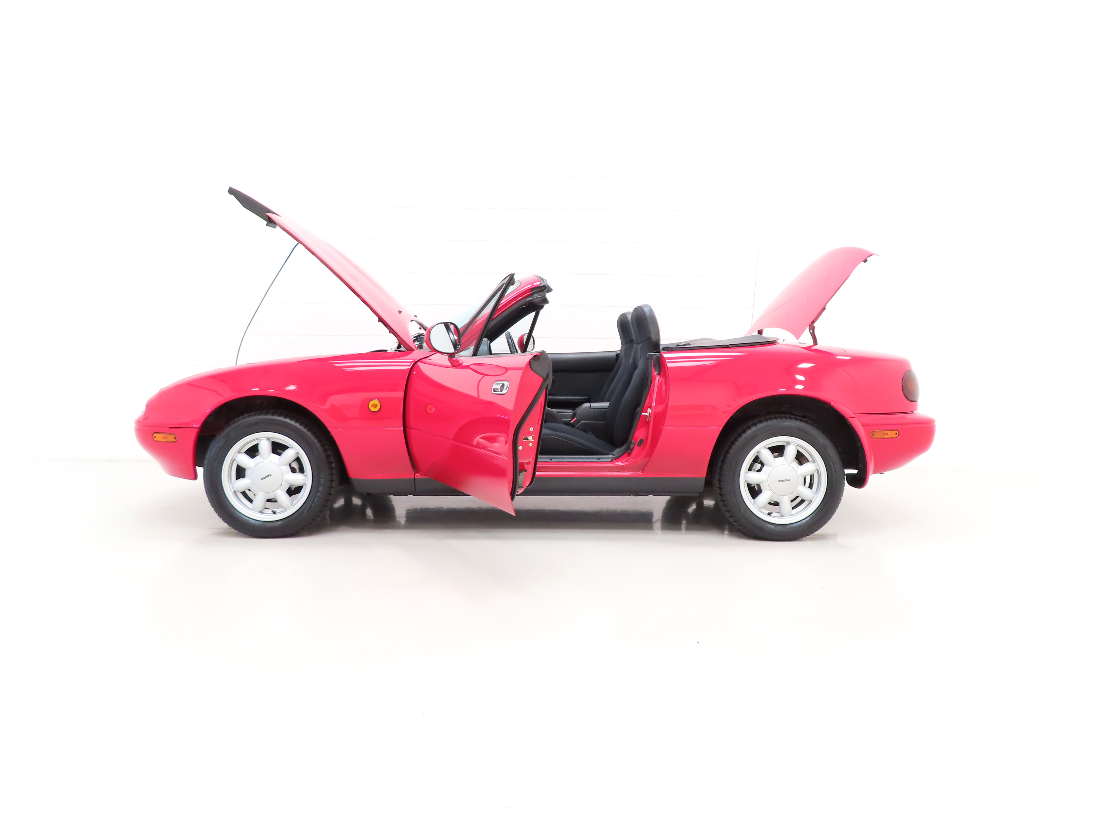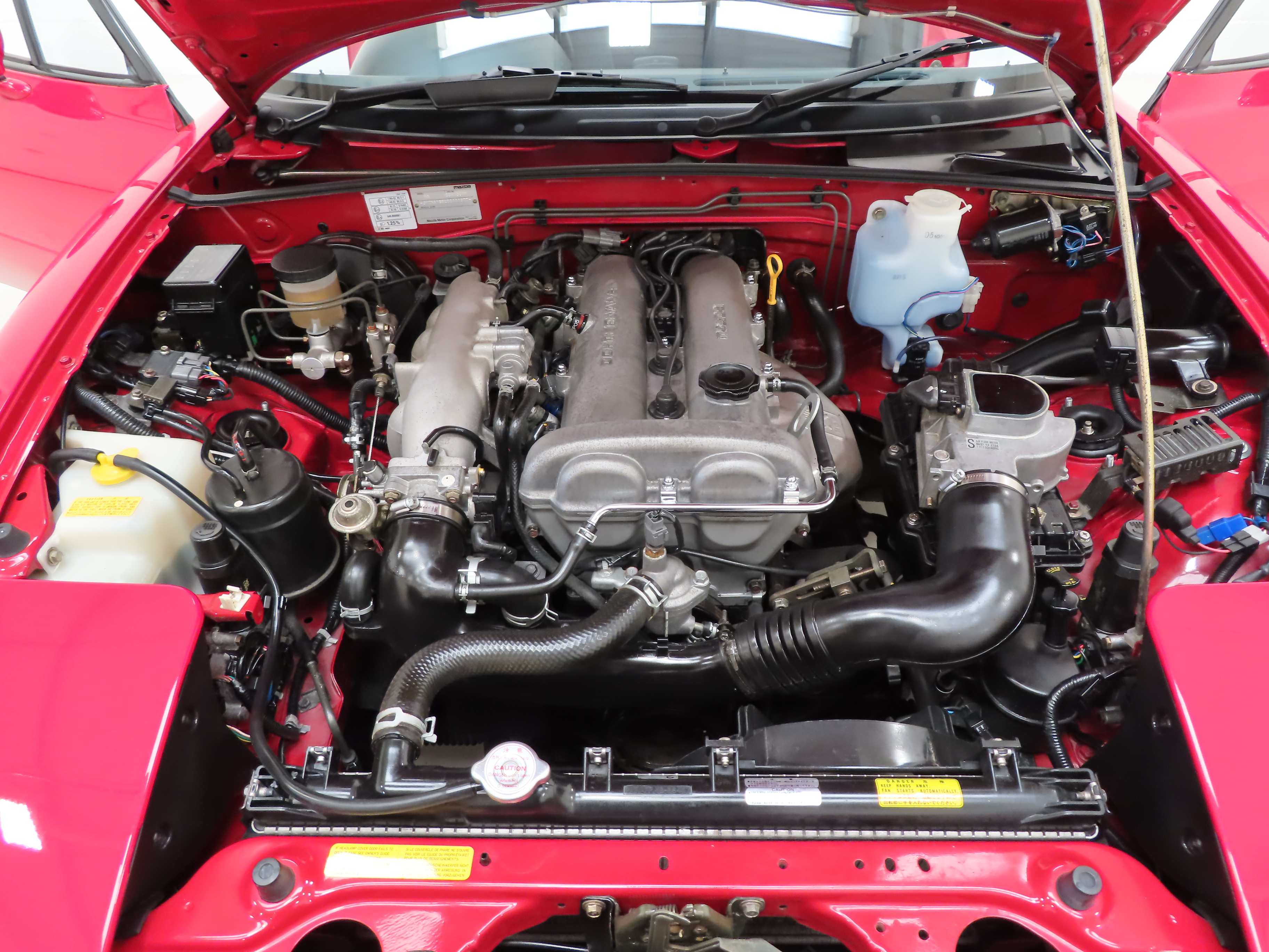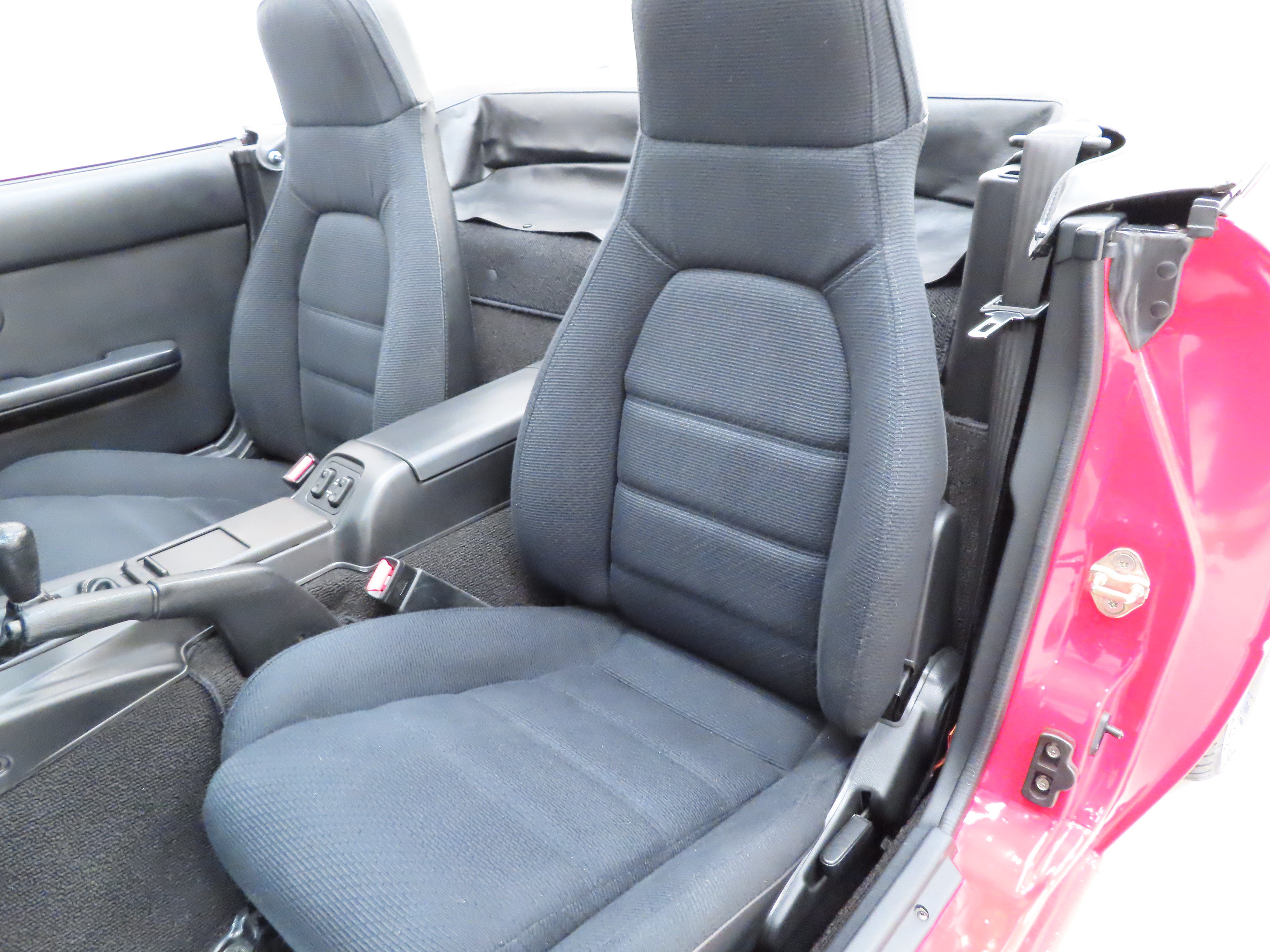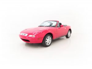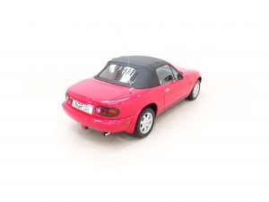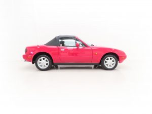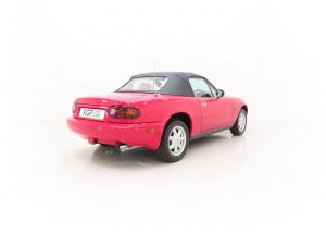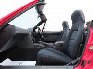 Trimmed in the standard Black Cloth upholstery this interior remains precisely as Mazda intended, and everything is co-ordinated perfectly. The high-backed seats offer great comfort and support, and show virtually no aging to the fabric. The seat structure including the bolsters are firm. The classic sports dashboard houses a cluster of crystal-clear instruments that function precisely as does the factory removable Clarion CRH-70 radio cassette. The original leather trimmed steering wheel with white stitching is fully intact. Dealer accessory chrome vent bezels have been fitted. The original wheel brace, jack and toolkit are all present, as is the tonneau cover for which even the storage bag has been kept. The no frills driver focused concept perfected by Mazda is simply wonderful, and this example upholds that notion perfectly.