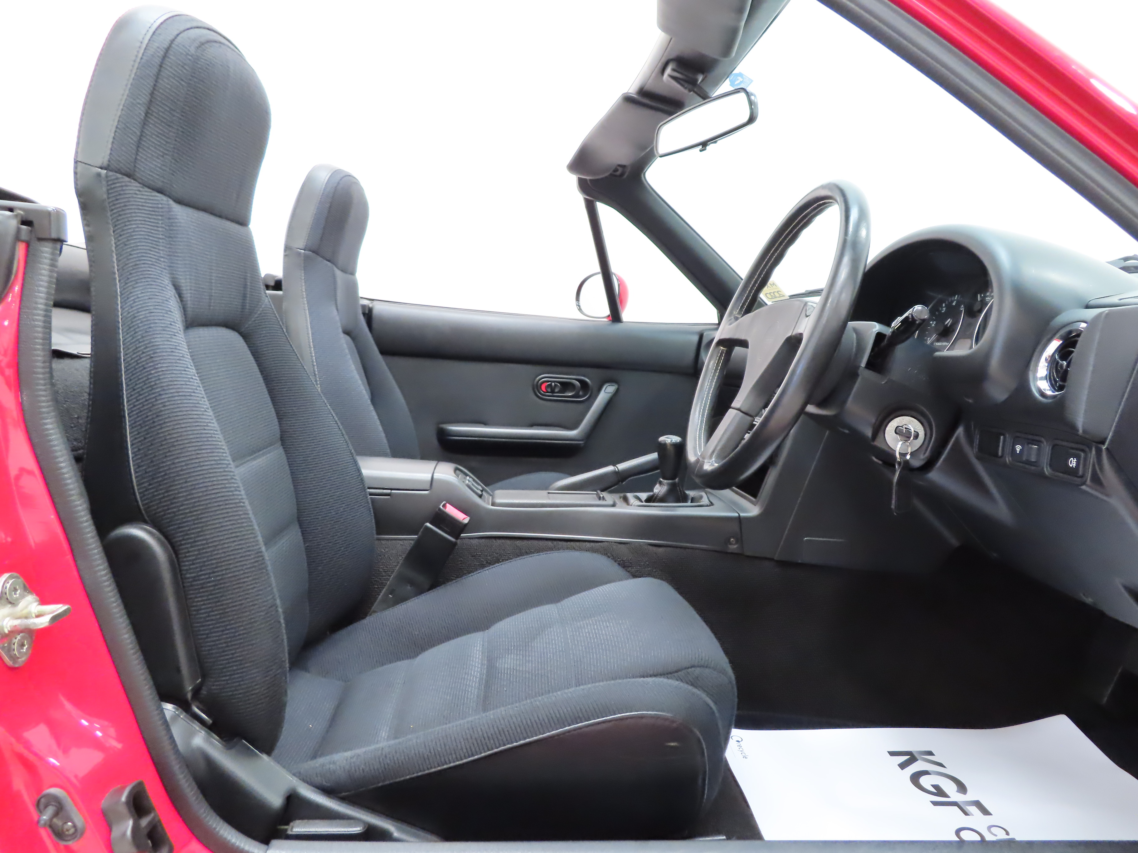 Laminated windscreen, tinted glass, retractable halogen headlamps, bright finish door handles, colour coded bumpers, outer mirrors and mud guards, manual folding black canvas soft top, rear tonneau, power assisted steering, side impact beams, suspension brace bar, power windows, tachometer, leather steering wheel and gear knob gaiter, bucket seats, Clarion CRH-70 radio cassette, interior light, map light, cigar lighter and ashtray, locking glovebox, locking centre storage box. Dealer accessories; Tailored MX5 carpet mats, chrome vent surrounds.