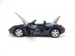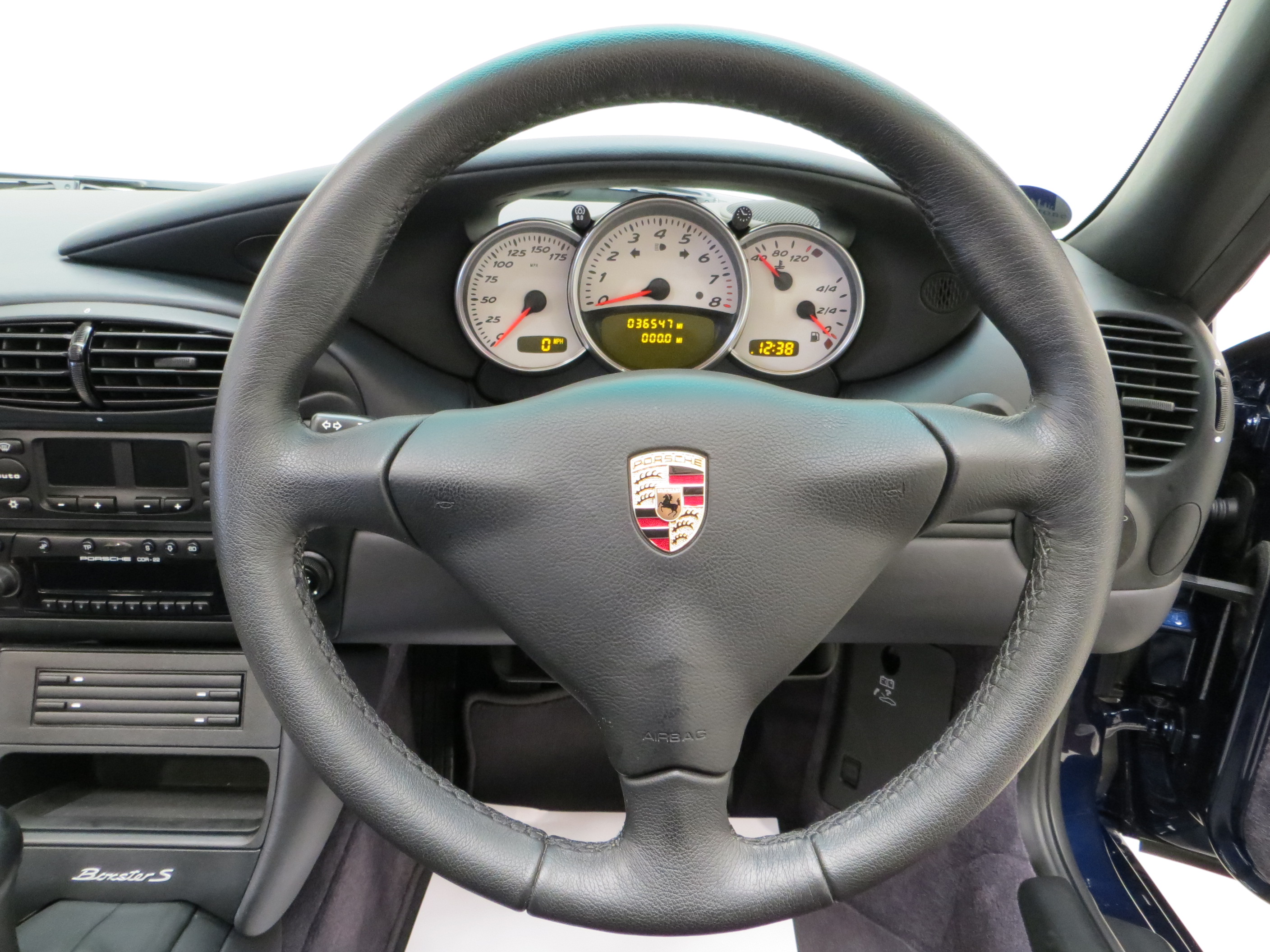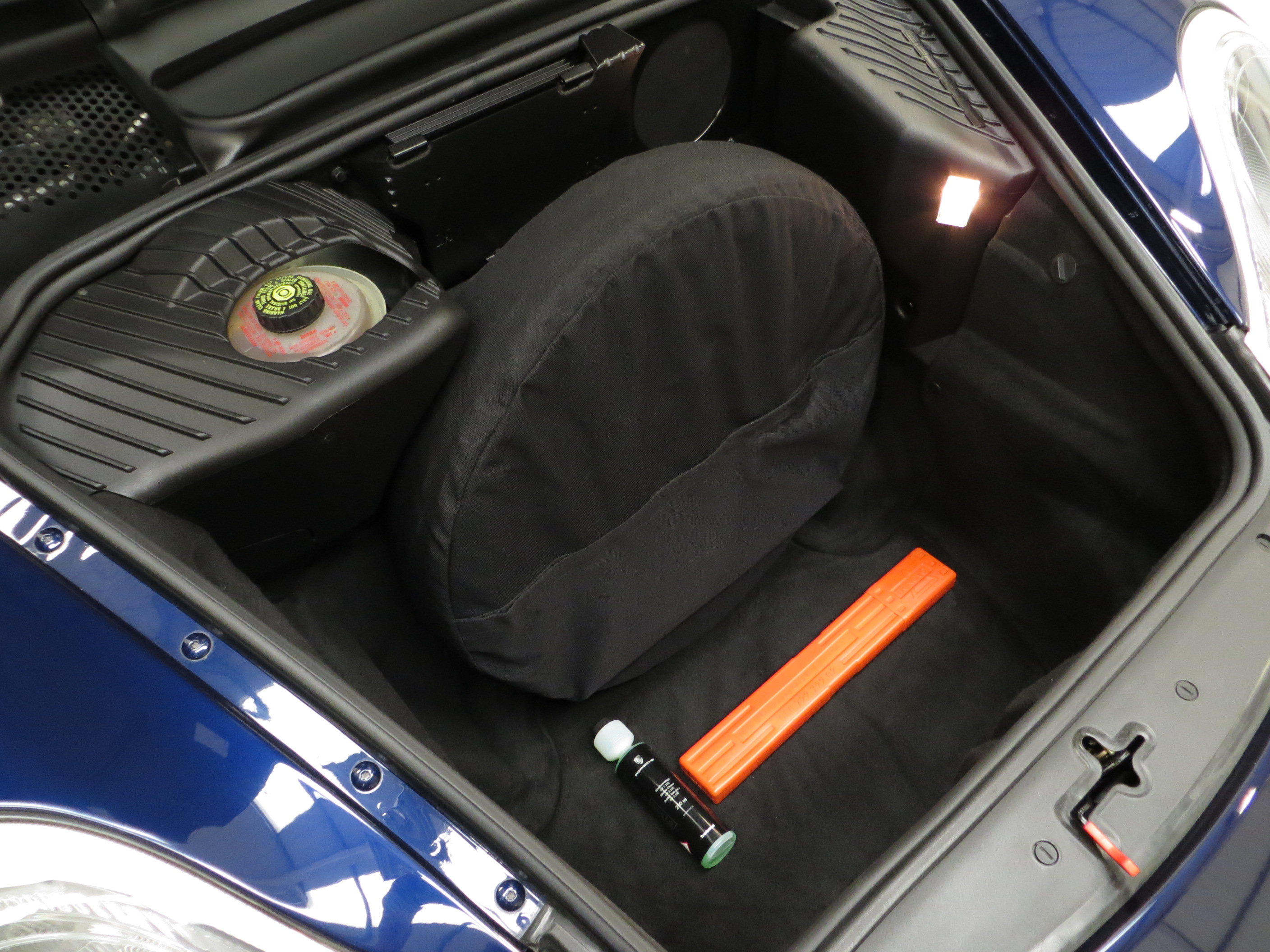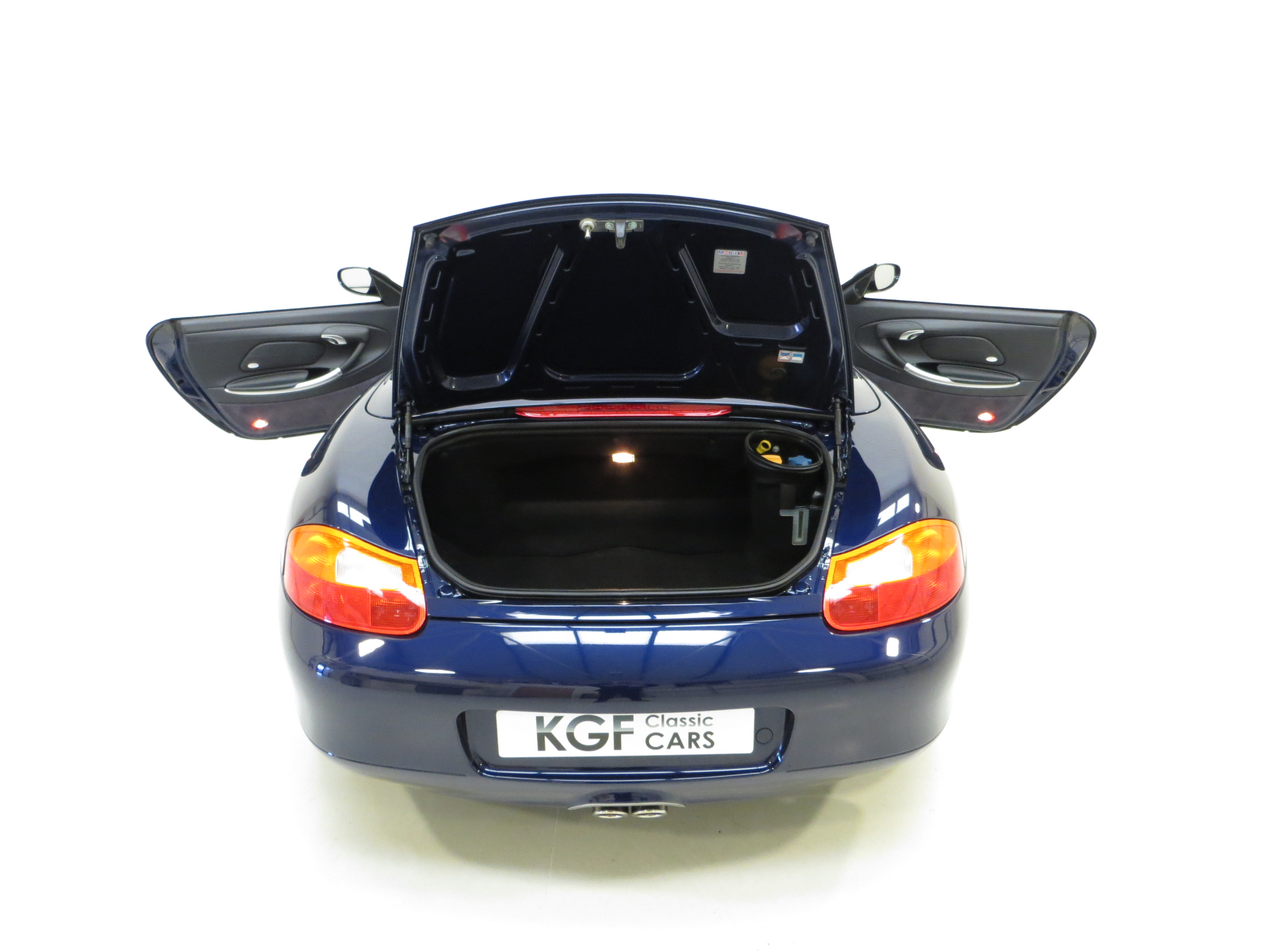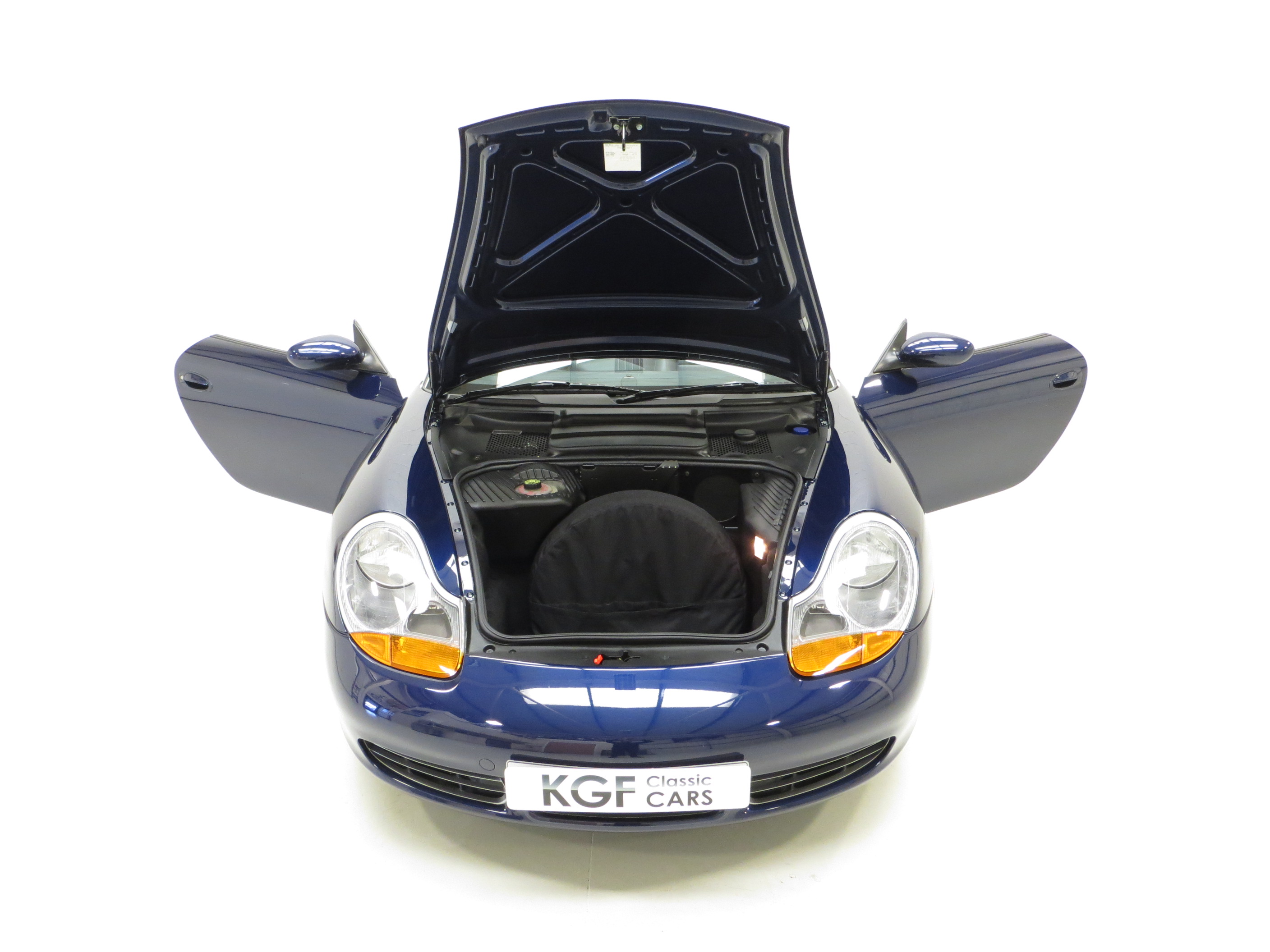 Typical Porsche quality is to be expected in this well-appointed sports car cabin space. The Metropole Blue full leather upholstery (Code E3), an expensive option when new and almost black in appearance, has remained in beautifully clean condition with virtually no wear visible. The carpets are spotless having been protected from new by tailored Porsche over mats, and the steering wheel displays natural prominent veins, a feature lost on higher mileage examples. Beautifully clean dual cargo areas reflect the minimal use and the factory build sticker to the bonnet underside and Mobil 1 sticker in the rear compartment bolster this cars total originality. Effortless folding of the electric hood transforms this every day roadster into something truly special, with endless scope for open top enjoyment and exhilaration.