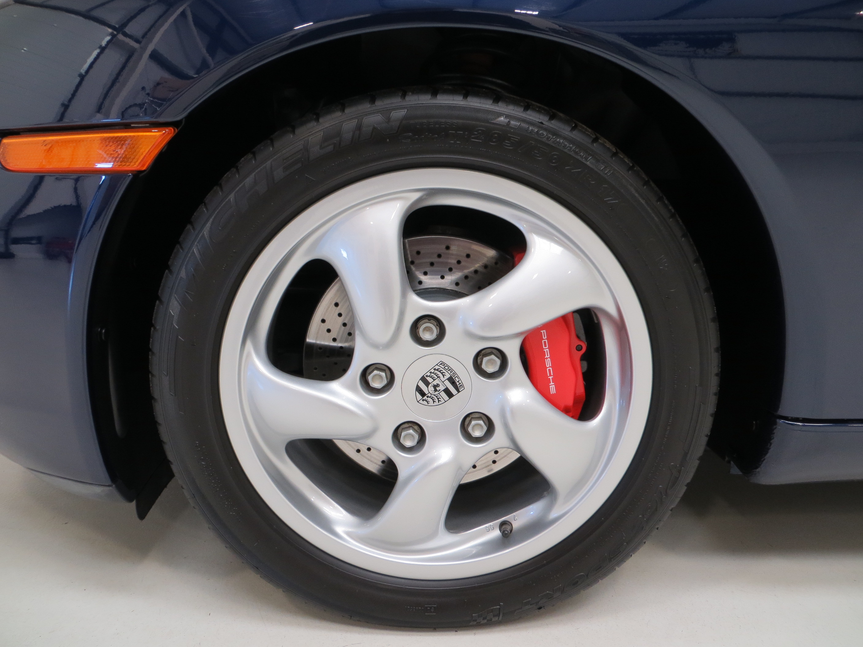 The original 17in twist spoke alloy wheels with Porsche centre crests are in perfect order, and fitted with the correct brand and size Michelin Pilot Sport tyres all round, 205/50 ZR17 and 255/40 ZR17 front and rear respectively with good tread levels. The ABS assisted braking system incorporates 4-Wheel ventilated and cross-drilled discs with 4-piston fixed monobloc callipers. The correct Boxster S specification Porsche Red painted callipers are clearly visible through the spokes and hint towards the racing pedigree infused within the cars genes.