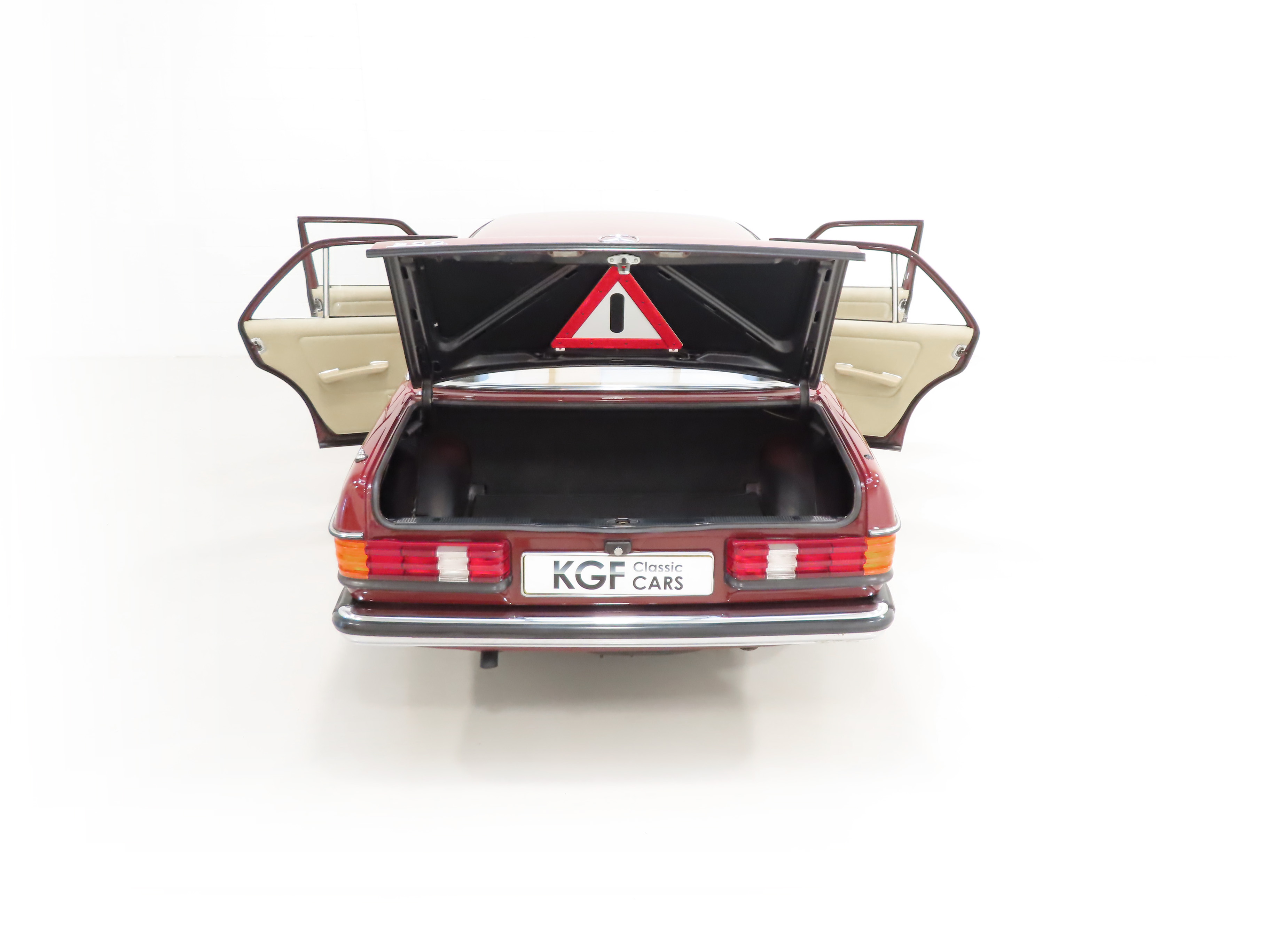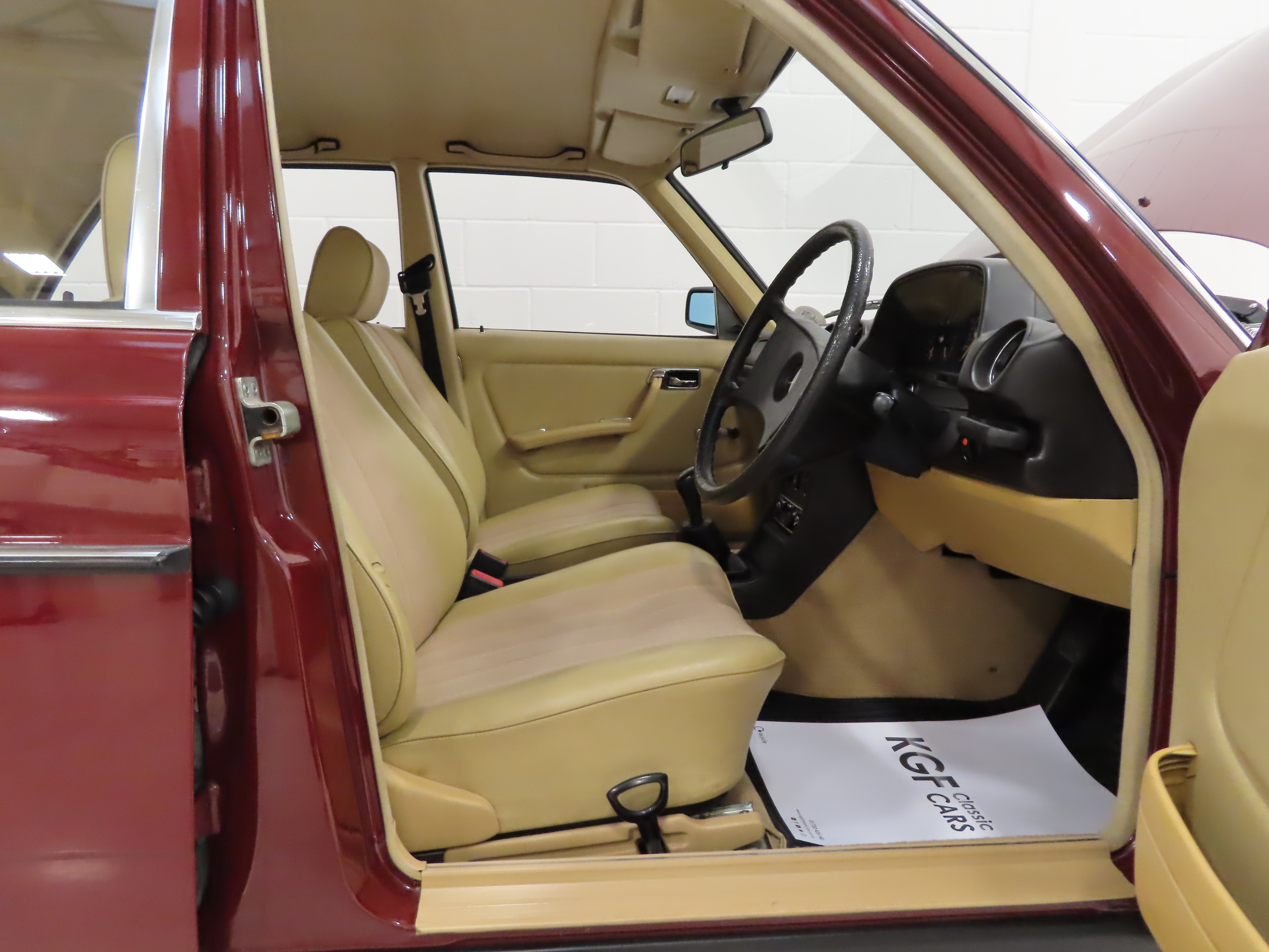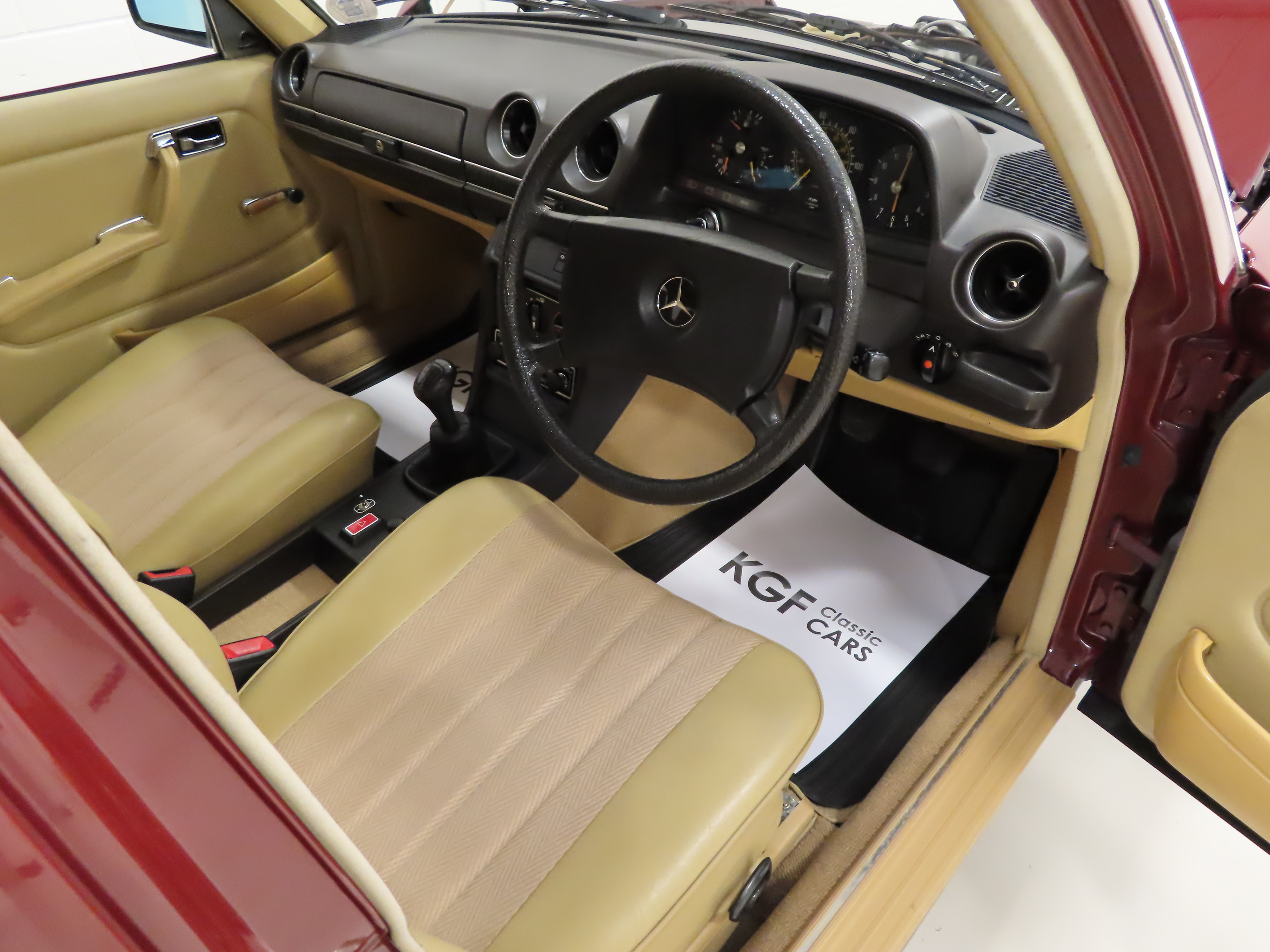Plenty of space to seat five people in complete comfort the anatomically contoured seats upholstered in original Cream Fabric with Leather bolsters provide relaxation to make motoring a pleasure. A complete view of all four corners thanks to a large glass area and high seating position enables complete confidence in all driving conditions. The deep pile carpets are pristine having been protected by genuine Mercedes rubber floor mats front and rear and the headlining and all interior trim sections are beautifully preserved. The manual window winders are marked slightly and there is a nick to the drivers outer bolster. The fascia is perfect and all the gauges, controls and electrics operate exactly as they should including the stereo radio cassette. The boot area has the factory supplied warning triangle and again is spotless. The ultimate in common sense.