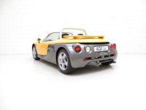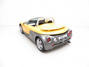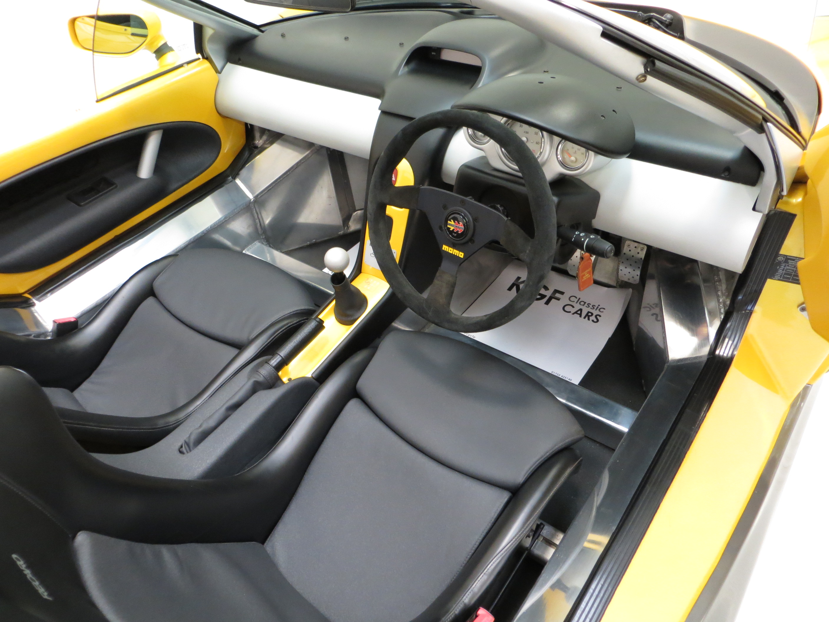 All aluminium spaceframe chassis, aluminium roll bar, vertically opening doors, body-coloured adjustable door mirrors, adjustable pedal positions, removable storage box in luggage compartment, laminated heated windscreen, single wide-sweep wiper, tonneau cover, elasticated door and passenger footwell storage nets, remote bonnet and engine cover levers in passenger door sill, engine immobiliser and coded key. Accessories; Colour coded rear spoiler, Momo steering wheel.