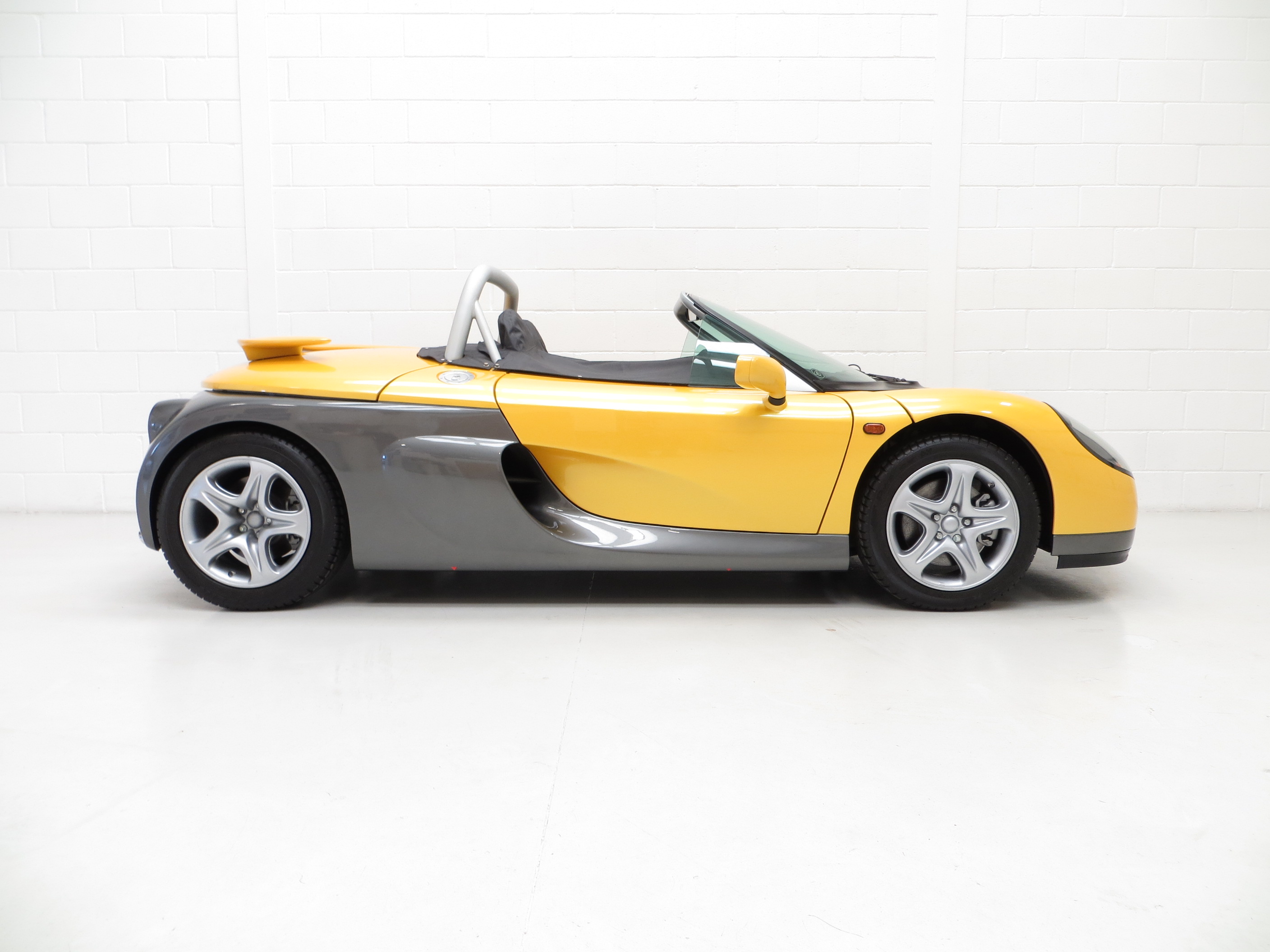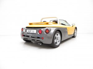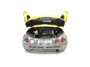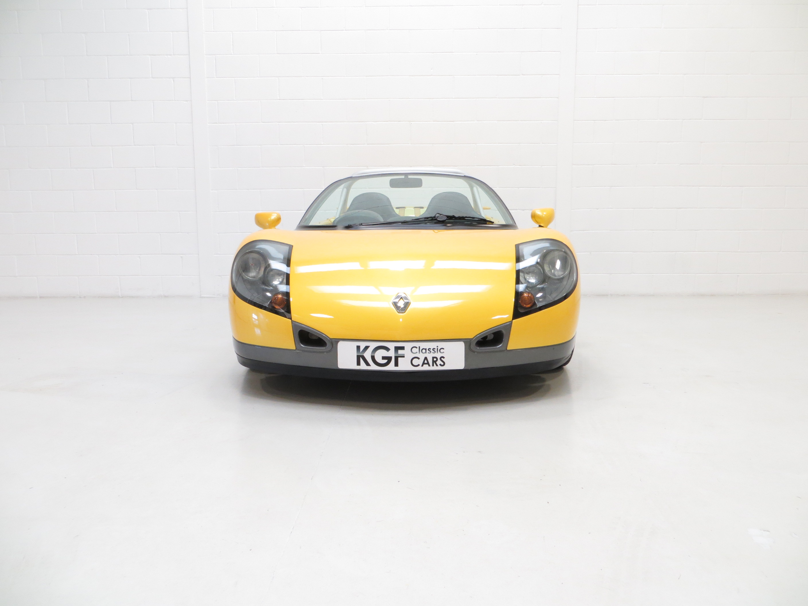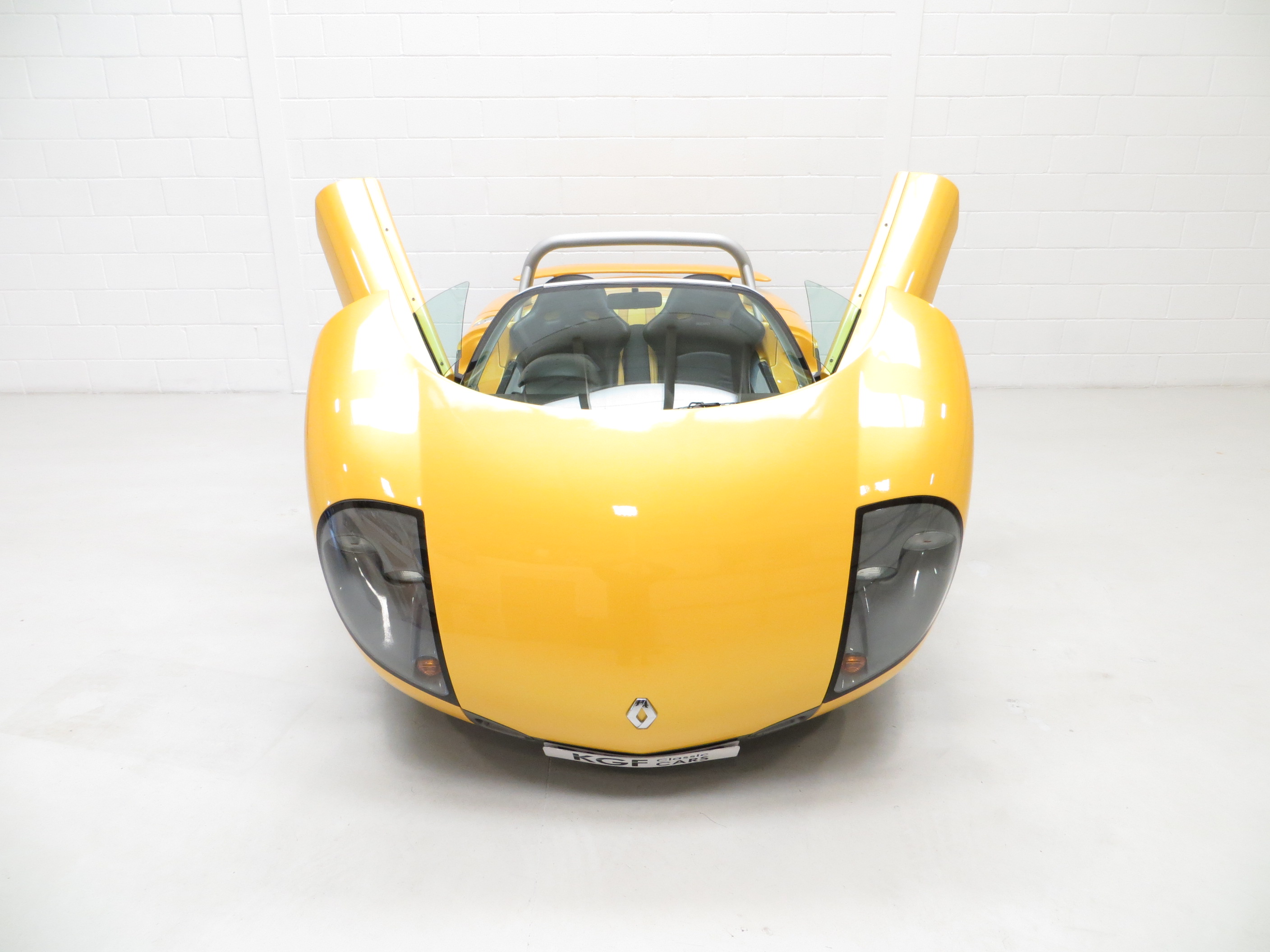 The arresting two-tone colour scheme finished in desirable metallic pearlescent Sports Yellow, (Code 535), looks incredible and can trace its heritage to the Laguna concept car in 1990. The smooth pebble-like design is uncluttered and muscular with large air-gulping side scoops and attention grabbing ‘beetle-wing’ cantilever doors. With such low miles the original condition is almost faultless with only a tiny tear to the front rubber splitter caused while be loaded onto a trailer and minor dimples to one wing top. The jacking point red triangular guide stickers are still attached and the heated front screen has the Renault inscription. An entirely hand built car and so rare.