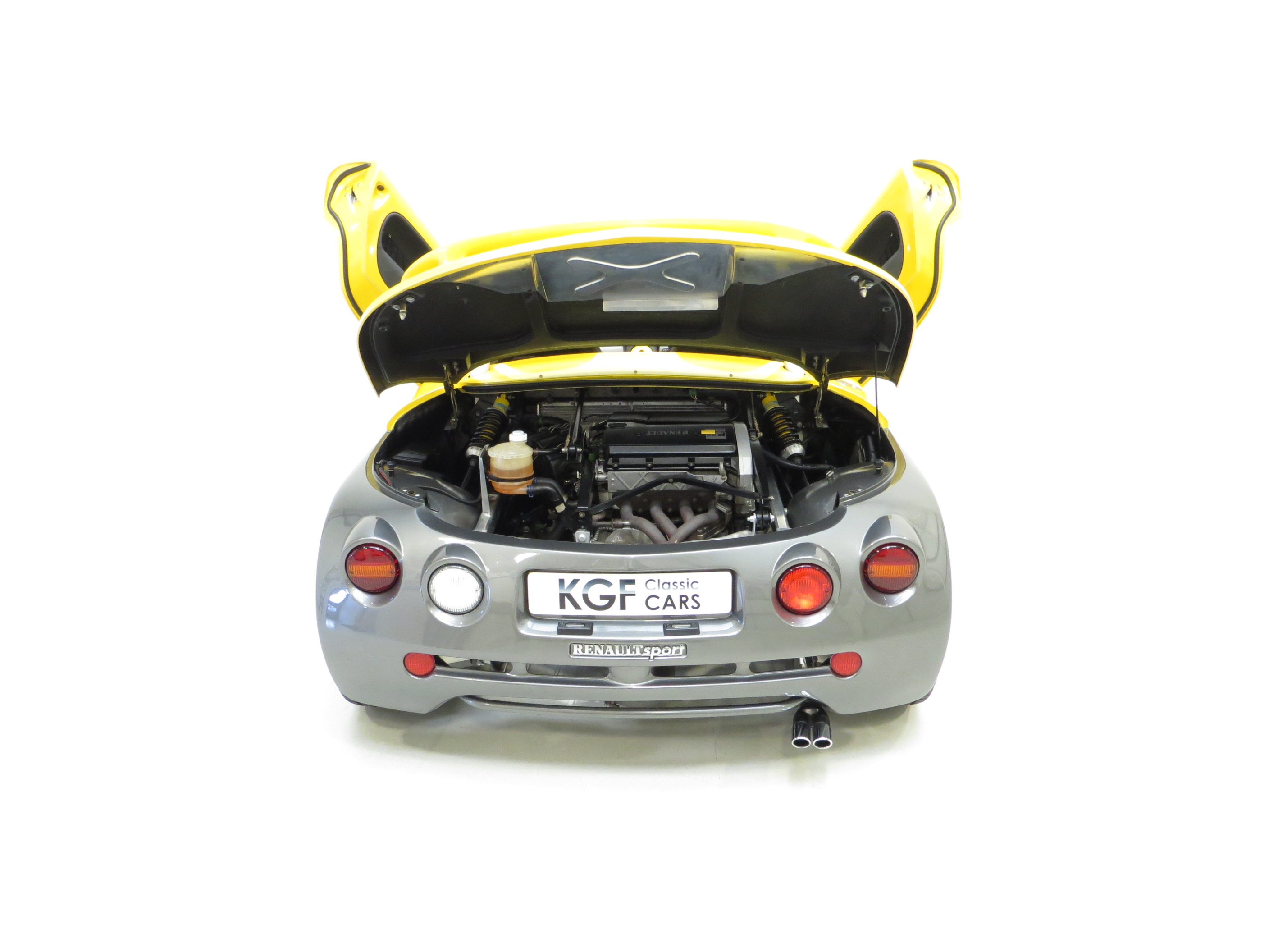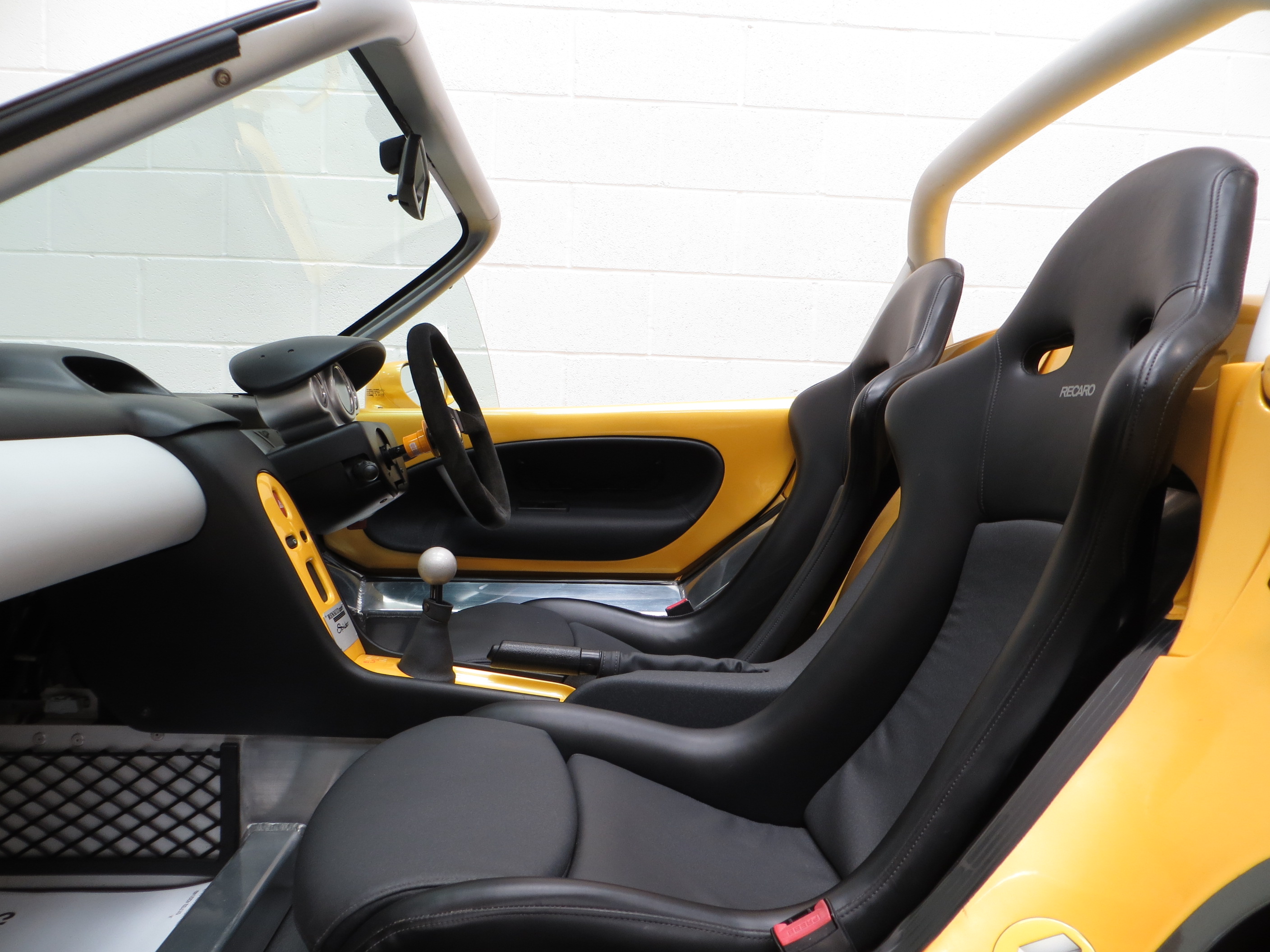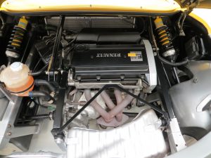 A very raw simplistic ‘back to basic’ feel with a modern, minimalist and uncluttered look. Two fabulous Recaro race-style bucket seats offer the perfect degree of lumber and lateral support and are trimmed in waterproof PVC coated knitted fabric with the side parts finished in matt and the central panel featuring a flecked metallic motif in mottled grey, all in pristine condition. Adjustment of the seats and the drilled aluminium pedals via a knob located beneath the dashboard ensures the perfect driving position. Anodised aluminium of the dashboard crossbar and gear knob nicely offset the body-coloured interior panels and the aluminium chassis and cross member are left exposed. All instrumentation functions and looks stunning set in an aluminium-finish bezel contrasting with the futuristic dash top digital displays. As with the rest of the interior, the silicon carbide-reinforced PVC floor covering has no wear and the original Renault Sport steering wheel is included with the car.