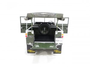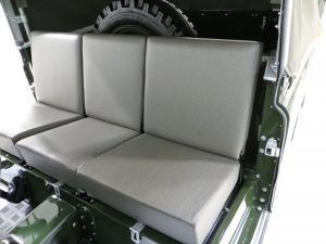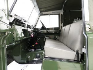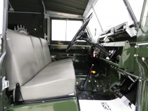 Sparse and utilitarian but packed with enduring Land Rover appeal this interior is truly sublime. Finished in expensive Grey Elephant Hide no interior trim item has been left untreated. Working fully refurbished gauges and switches run through a new wiring loom and the original steering wheel has been meticulously renovated. Heavy duty Land Rover rubber floor mats add a little comfort and all exposed Bronze Green metal work has an amazing gloss finish. The rear has a tilt bed with a spotless painted floor. Spectacular in every respect.