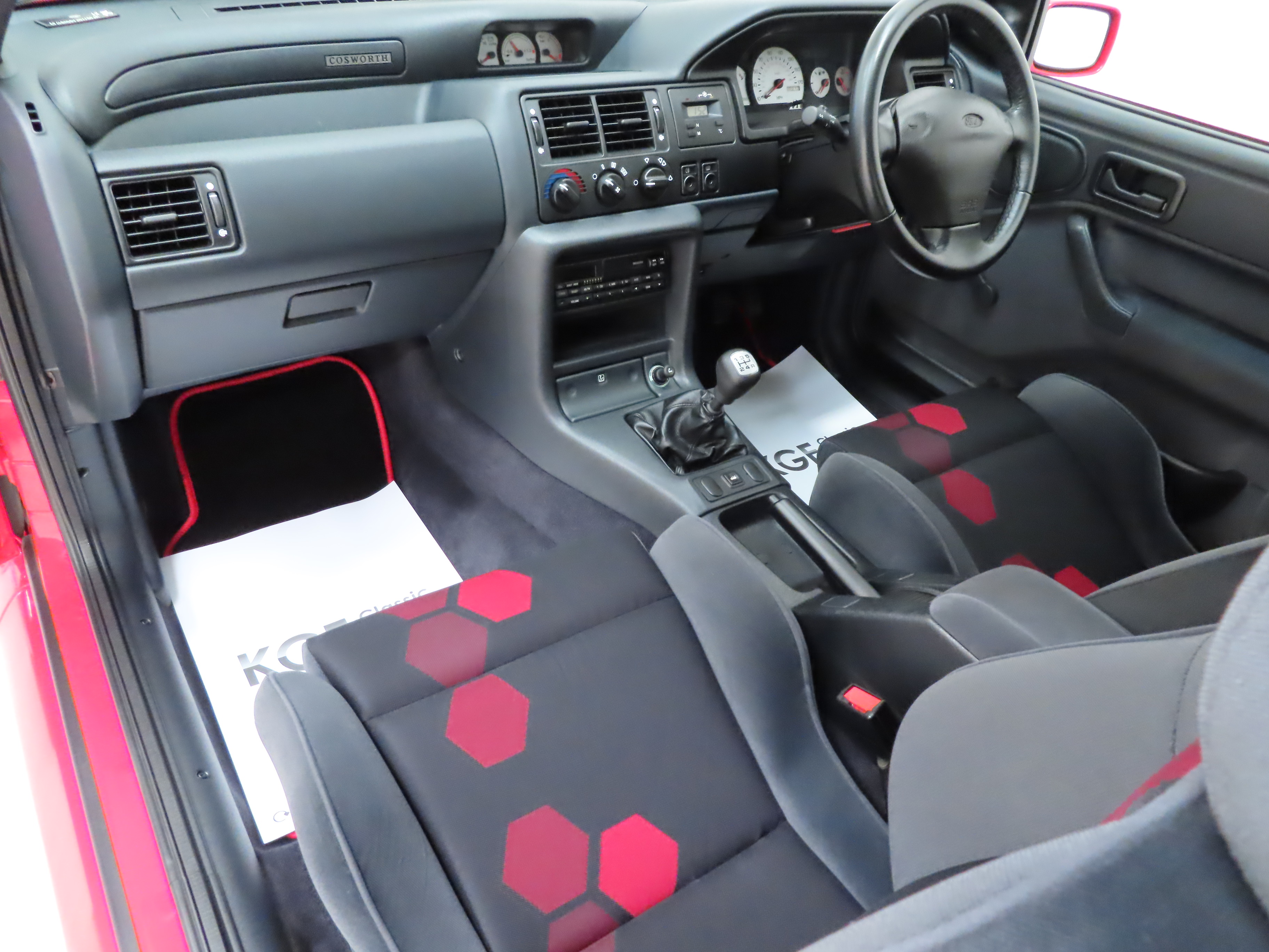 The interior of this late production Escort RS Cosworth is as new and exactly as Ford intended. The body-hugging Recaro seats finished in Raven with Pimento Red Hexagon Cloth, (Code 09), are sublime with complete fullness. Graham Goode carpet mats were fitted by Graham himself protecting the carpets and all trim, door cards and headlining is perfect. Turning the ignition on reveals all electrics operational including the Ford 2007 RDS radio/cassette still with the Keycode P1COS. The rare Standard Edition model has none of the Luxury Edition specification so manual windows, manual door mirrors and other equipment omissions are correct. Incredibly special and a collectors dream come true!