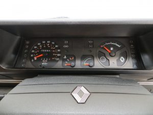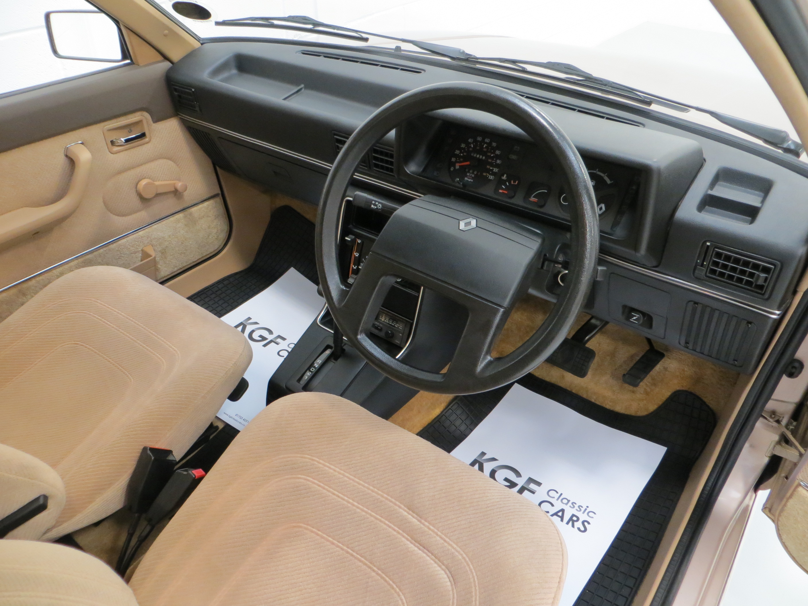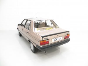 Being the 1.4 Auto this is the highest specification Broadway Edition available with unique features such as the Sand velour upholstery in lieu of cloth check and full deep pile carpeting. Genuine Renault rubber floor mats front and rear have been fitted since new and even the supplying dealer paper floor mats have been kept! Also unique to the top specification 1.4 Auto is the Philips Car Cassette Receiver 451 in full working condition along with all the other switches and gauges. Natural veins to the unworn steering wheel only found on very low mileage cars are clearly visible and the pedal rubbers are virtually new. The boot area is factory perfect and unused along with the jack and wheel brace. A new 1980’s Renault lounge interior.