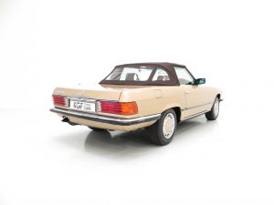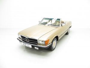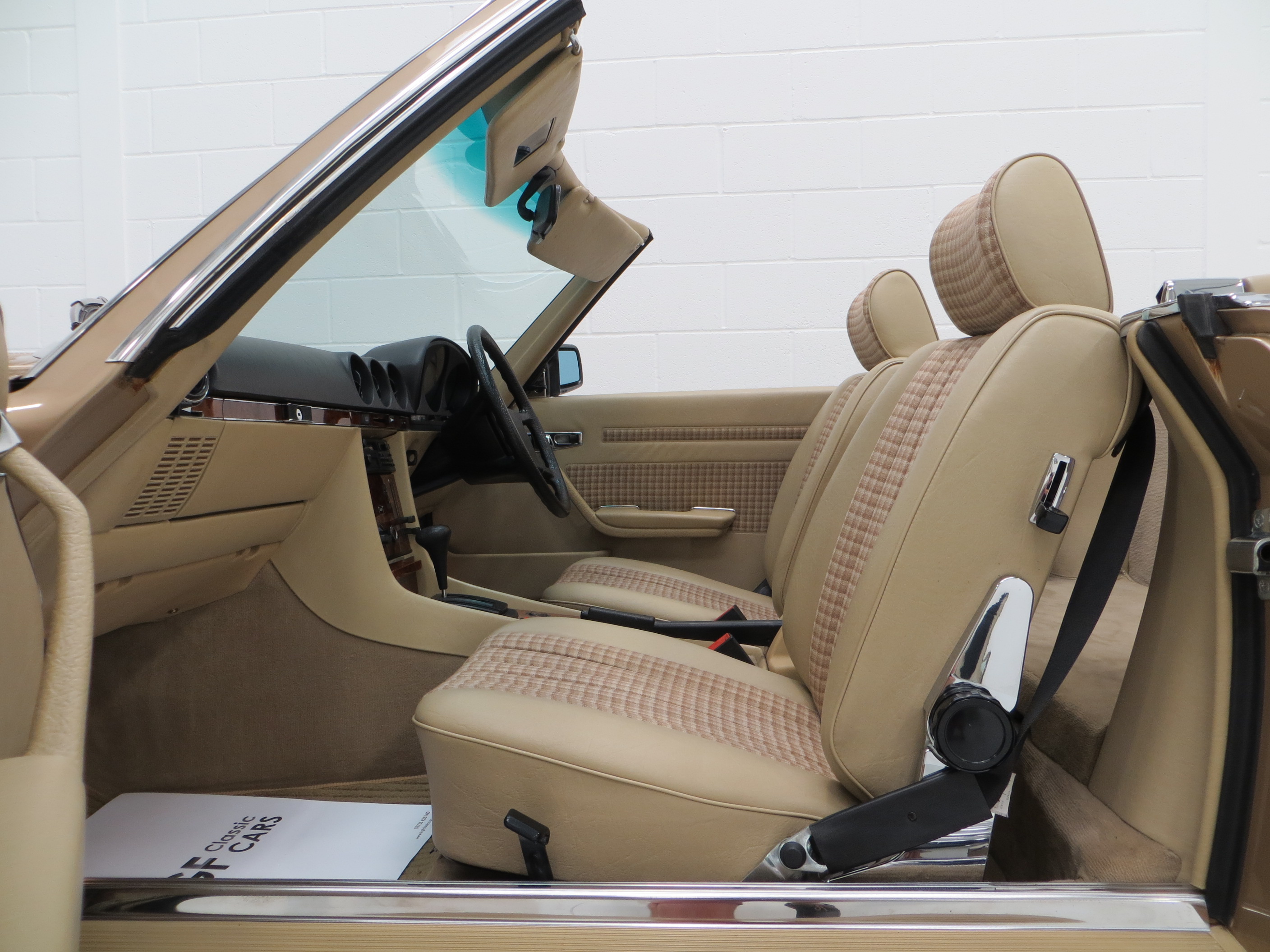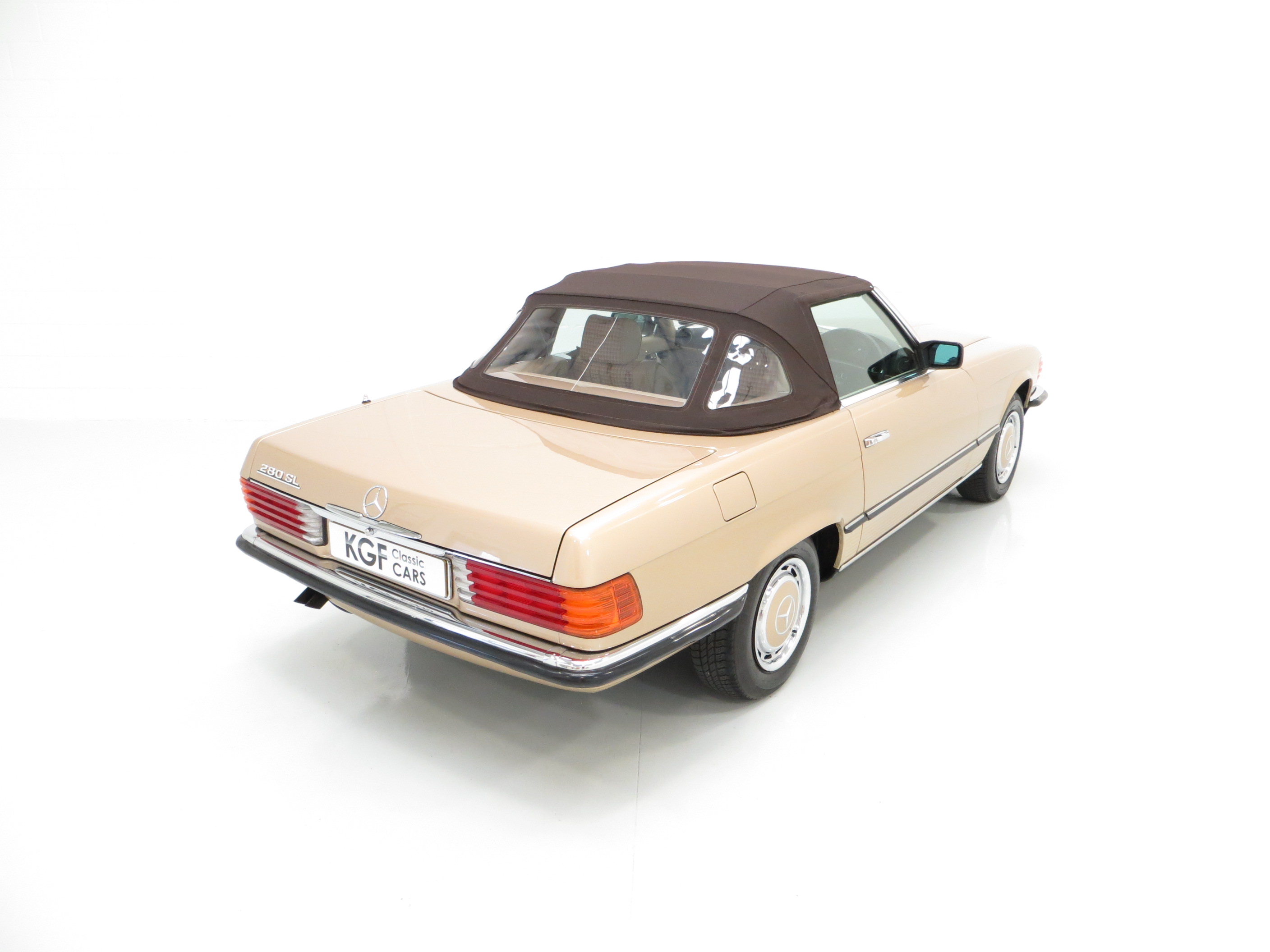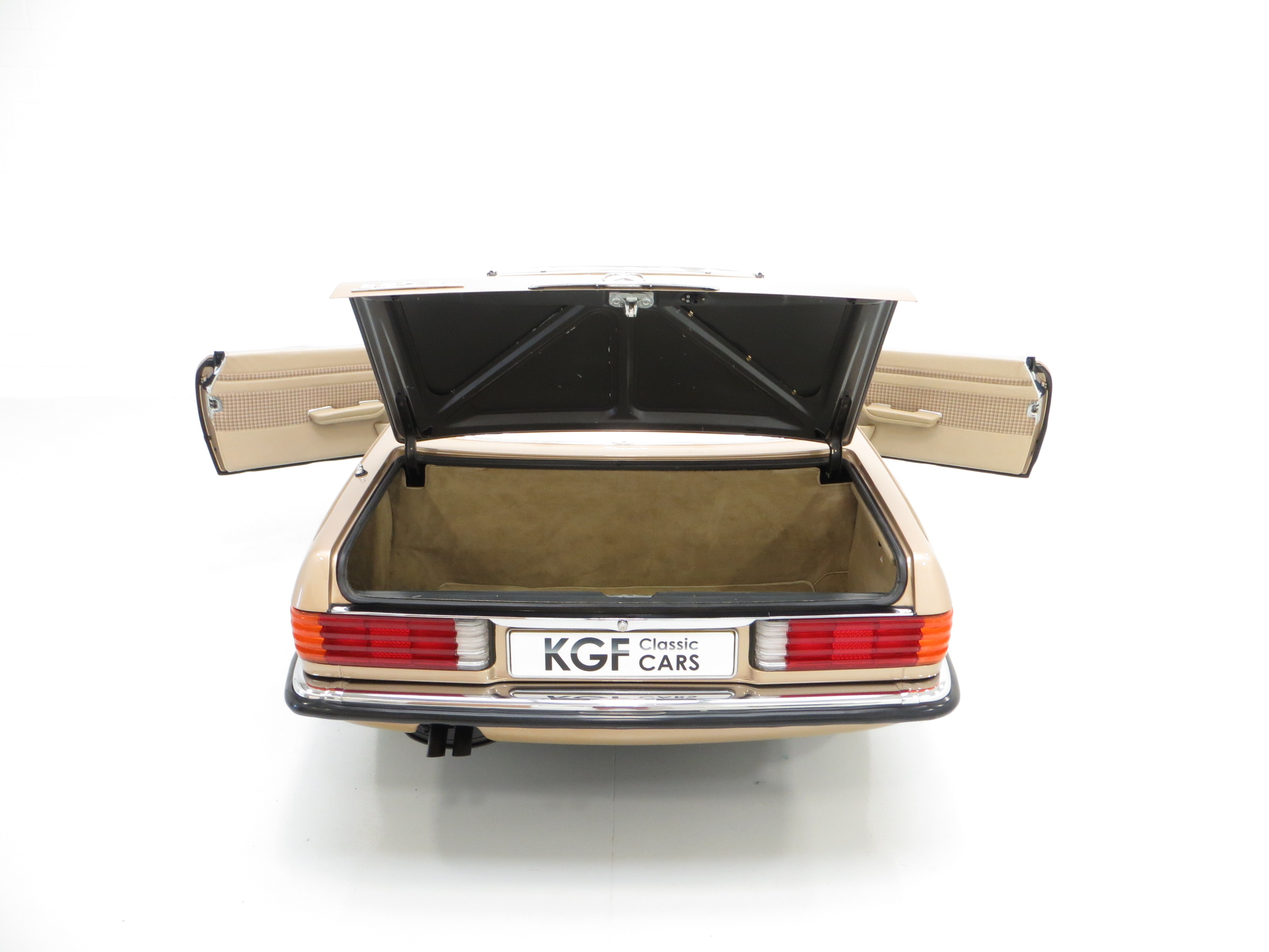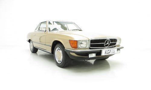 The R107 Mercedes-Benz SL achieved iconic status in the 1970’s and 80’s and became a byword for success, a car for those who had made it! Now a stalwart feature of the modern classic car era, this 280SL represents a superb example having covered just 57,069 miles from new. Finished in factory optional Champagne Metallic, (Code 473), the paintwork boasts a magnificent finish and uniform shine. This fabulously period colour accentuates the cars classic elegant lines, and even upon close scrutiny only tiny markings can be found. The original Dark Brown hood, (Code 8023), is as new, as are the side and rear hood windows. The original colour coded hard top remains with the car and is in immaculate condition, and the hood aperture is clean and displays the original foam bump stops. The high-quality chrome has a mirror finish and trim sections and rubbers are superb. A car that excelled in engineering, build quality and craftsmanship when new, this example has been preserved exactly as Mercedes intended.