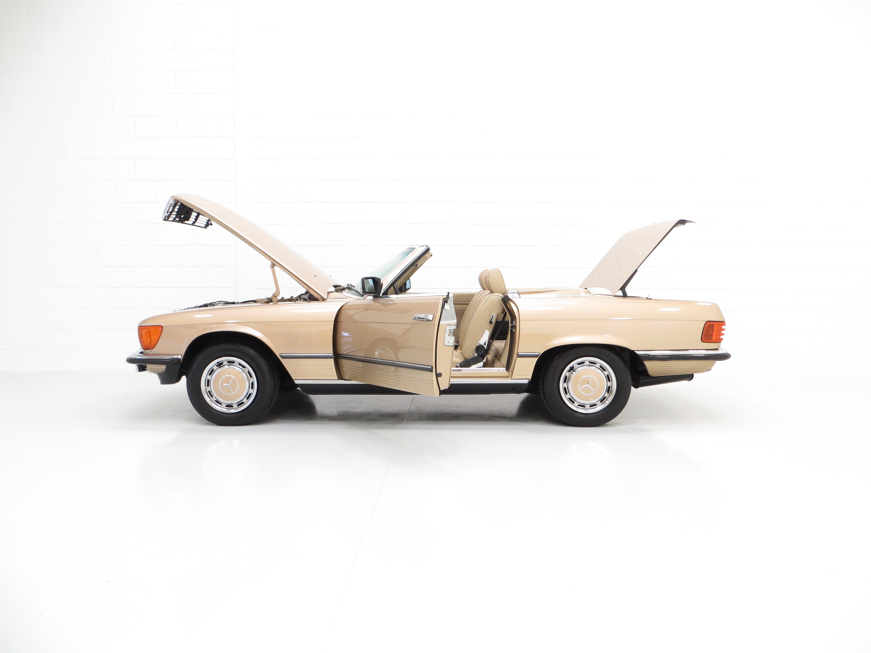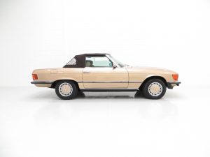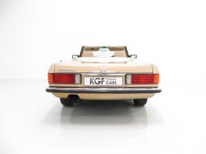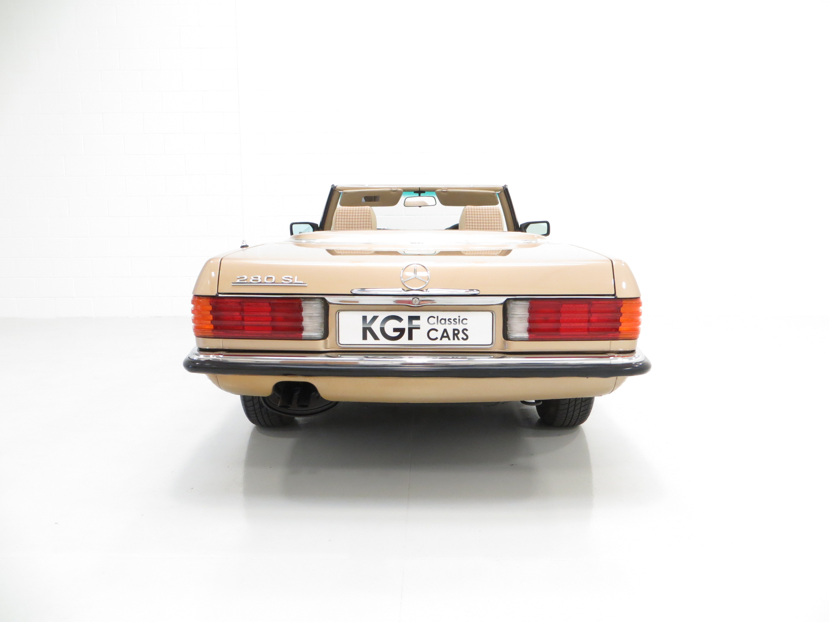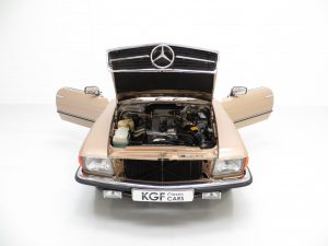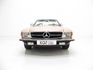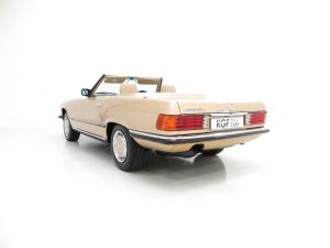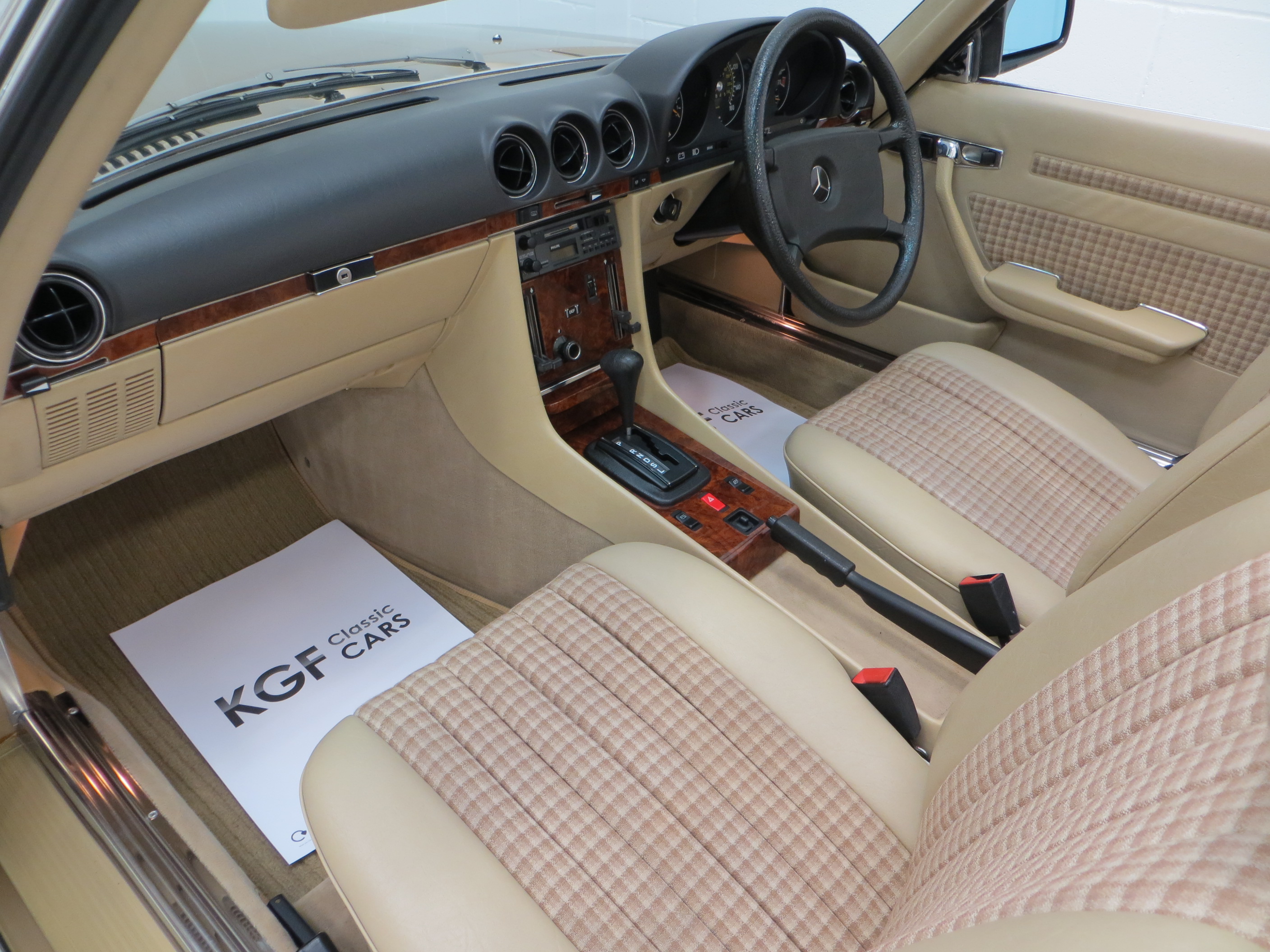 The R107 Mercedes-Benz SL achieved iconic status in the 1970’s and 80’s and became a byword for success, a car for those who had made it! Now a stalwart feature of the modern classic car era, this 280SL represents a superb example having covered just 57,069 miles from new. Finished in factory optional Champagne Metallic, (Code 473), the paintwork boasts a magnificent finish and uniform shine. This fabulously period colour accentuates the cars classic elegant lines, and even upon close scrutiny only tiny markings can be found. The original Dark Brown hood, (Code 8023), is as new, as are the side and rear hood windows. The original colour coded hard top remains with the car and is in immaculate condition, and the hood aperture is clean and displays the original foam bump stops. The high-quality chrome has a mirror finish and trim sections and rubbers are superb. A car that excelled in engineering, build quality and craftsmanship when new, this example has been preserved exactly as Mercedes intended.