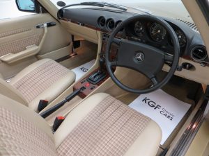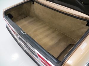 The interior of this 280SL, upholstered in matching Cream Beige fabric with leather side trim, (Code 075), has remained in fantastic condition. The seats are beautifully preserved and commensurate with the low mileage and all seat structure is fully intact with no loss of shape. One miniscule mark to the driver’s seat base can be seen and there is a virtually invisible nick to the leather upper bolster. The deep pile carpets are pristine having been protected from new by Mercedes over mats. The fascia is perfect and all the gauges, controls and electrics operate exactly as they should, including the optional Philips 750 radio cassette. The rear luggage area has the original first aid kit in the side holder and the boot area has the factory supplied toolkit as well as the original warning triangle. Originality seekers will note the rear light clusters complete with delicate manufacturer stickers still attached. Hugely advanced ergonomically and from an era when Mercedes-Benz set the standard for all makers to emulate.