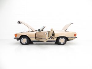 Light-alloy bonnet, easy-closing doors, detachable colour coded hard top, retractable soft top, impact zones, anti-burst locks, strengthened windscreen pillars, parking lamps, remote controlled door mirrors, three speed wipers, individually adjusted temperature zones, oil pressure gauge, non-slip steering wheel, lockable glove compartment, fire extinguisher, first aid kit, warning triangle, power assisted steering. Factory options; Metallic paint. Dealer options; Mercedes tailored floor mats, Philips 750 radio cassette, tailored hard top storage bag.