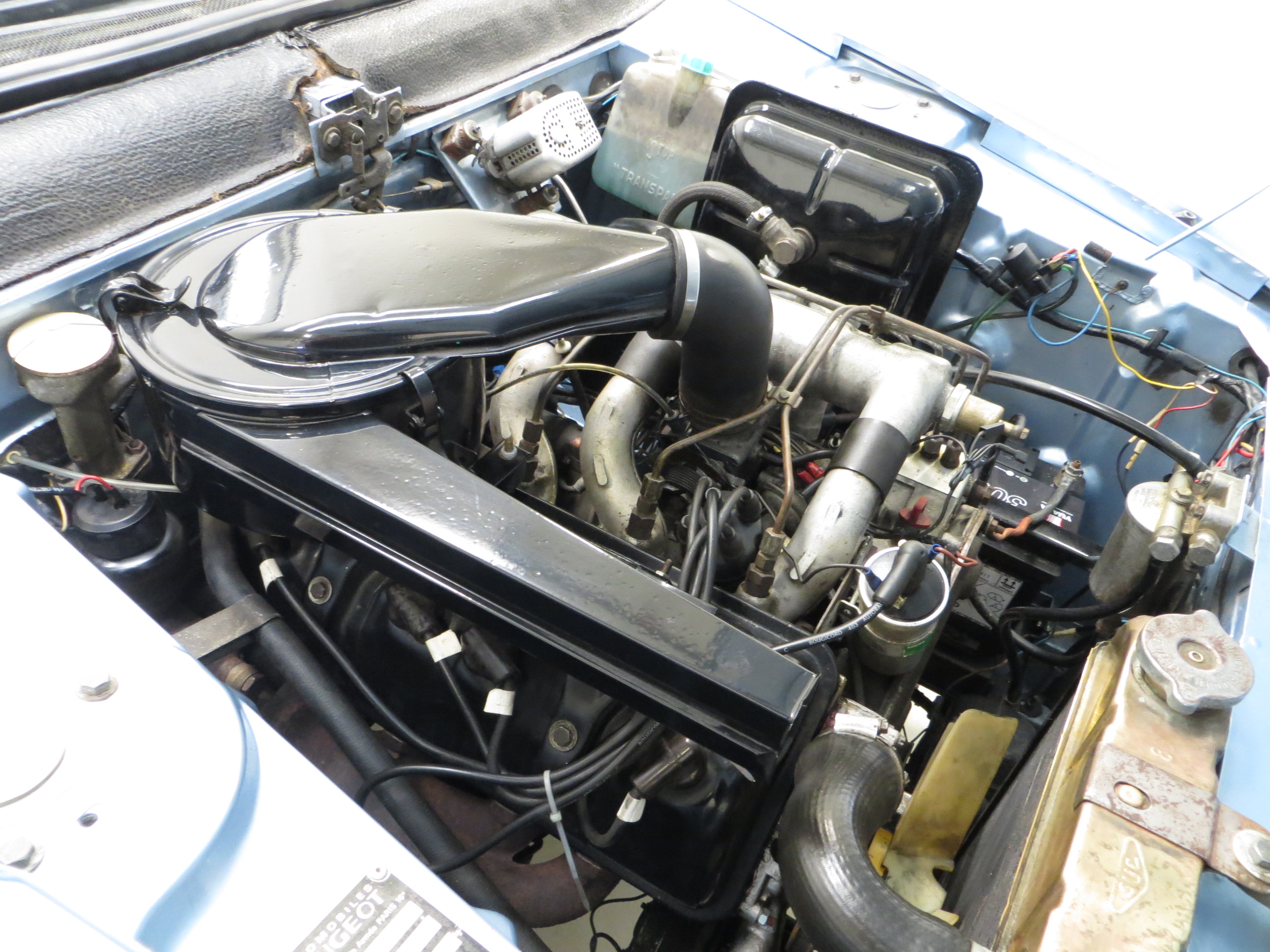 The black leatherette interior fitted to this Super Luxe model is in superb order having been subject to a full retrim. Matching door cards are in excellent order with only minor aging apparent to some interior trim such as the internal door handles, and the black carpeting is clean and fully intact. The stylish fascia with colour coded painted facings and padded top is fashionable and functional in equal measures, with a Pininfarina badge and emblem proudly displayed. The ornate steering wheel with twin spoke and horn ring remains in superb order. A period Radiomobile unit is fitted but not connected. A wonderful original touch is the running in ‘Pendant Le Rodage’ windscreen sticker! A super-sophisticated interior with an abundance of French chic, even down to the beautifully machined Peugeot seat belt clasps.