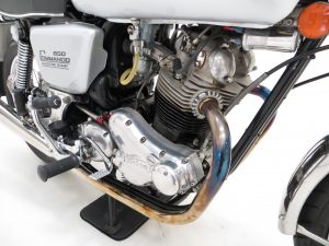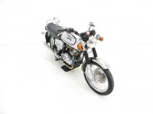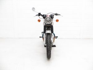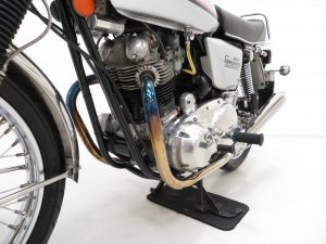 The beating heart of this formidable machine is the air-cooled 828cc OHV vertical twin with an aluminium one-piece cylinder head, forged aluminium alloy connecting rods and aluminium pistons. Electronic ignition and electric start are a feature of this 1977 Mk3 model and have been retained as intended. Performance is quoted of 60bhp at 5,900rpm and during official testing, a standing quarter mile was completed in 12¼ seconds while reaching a terminal speed of 103mph. The engine is very clean and crucially it performs flawlessly having been subject to fastidious upkeep for regular long-distance touring by the now retired long-term owner. The original restrictive exhaust silencers have been replaced by accepted authentic upgrade cans which sound incredible. The wide tooth four speed gearbox with medium-close ratio is well suited to touring and operates exactly as it should with a light clutch action.
