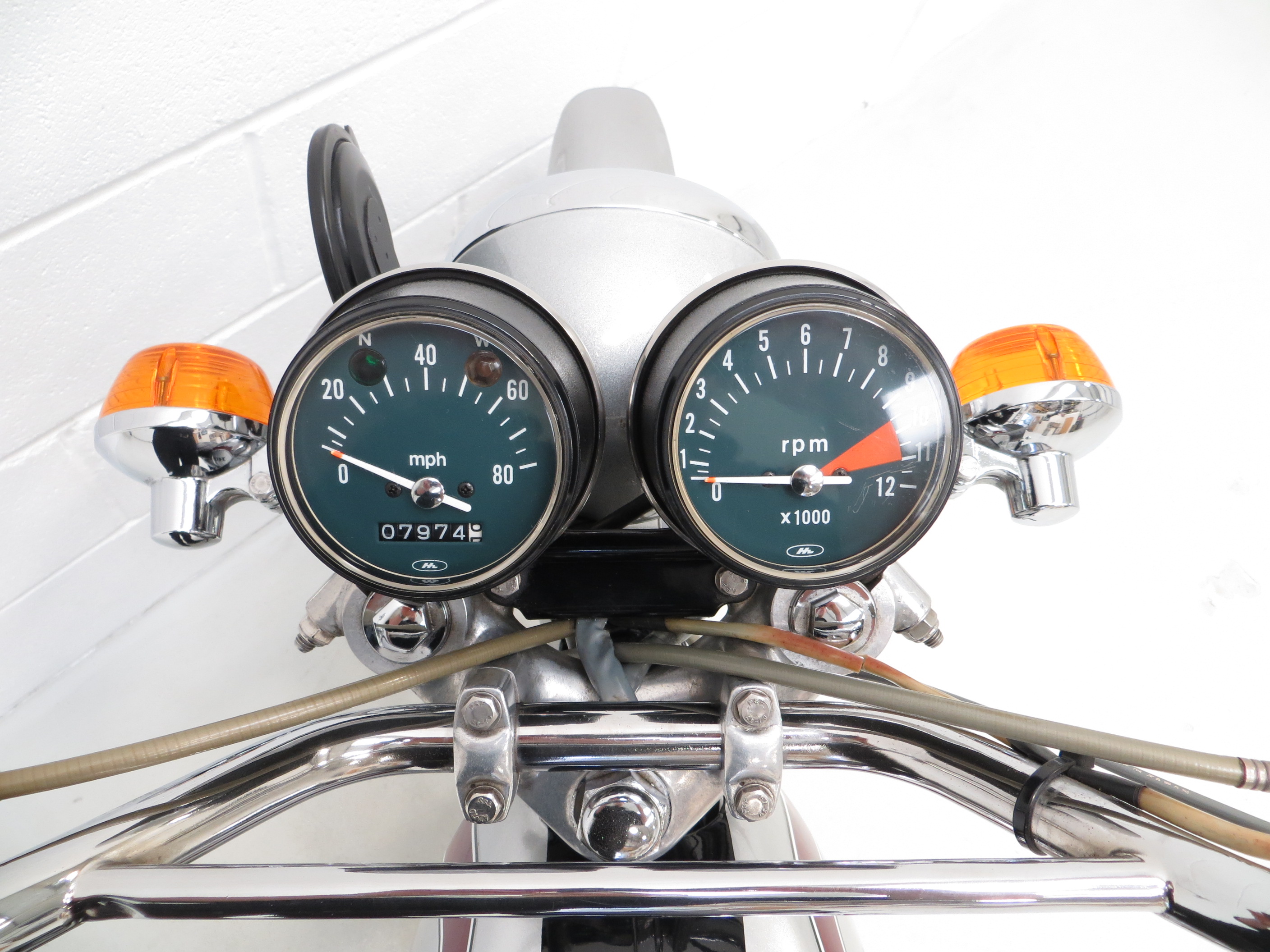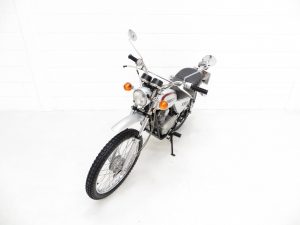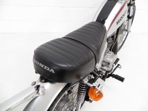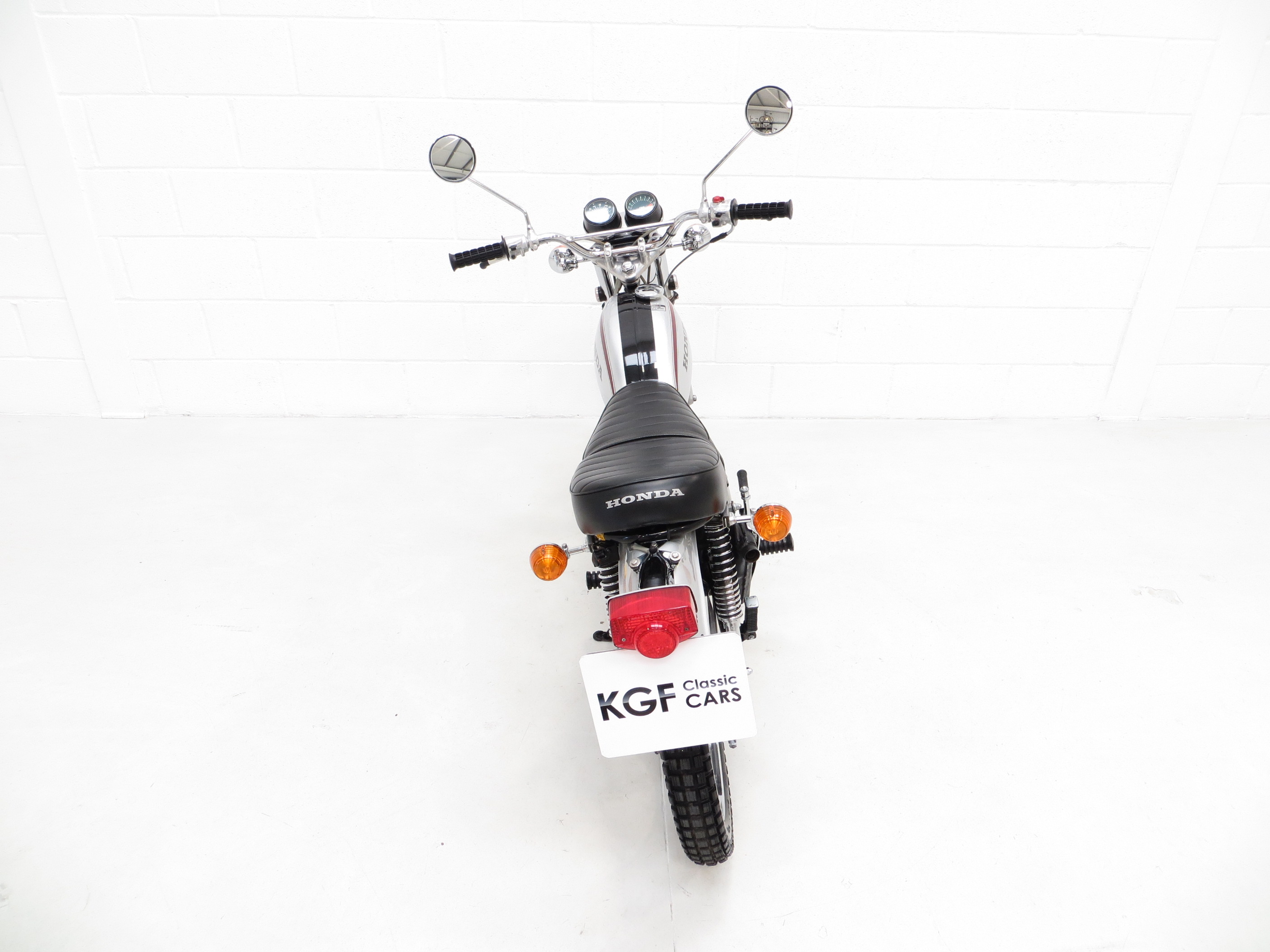 Finished in Special Silver Metallic this iconic and collectable Street Scrambler looks stunning. The paint work has a gorgeous metallic fleck and extends to the fuel tank, side covers, headlight shell and mudguards. The decals are correct and again pristine and even the chain guard information sticker and helmet holder stickers are attached. The material to the seat is original and in remarkable condition with an unbroken pillion strap and the Honda logo in white still vibrant. The double cradle pipe frame has a hardened black gloss finish with no damage and the frame number is just visible. The correct Stanley headlamp and rear lens remains fitted and all lighting and instrumentation is operational. Wonderful in every respect.