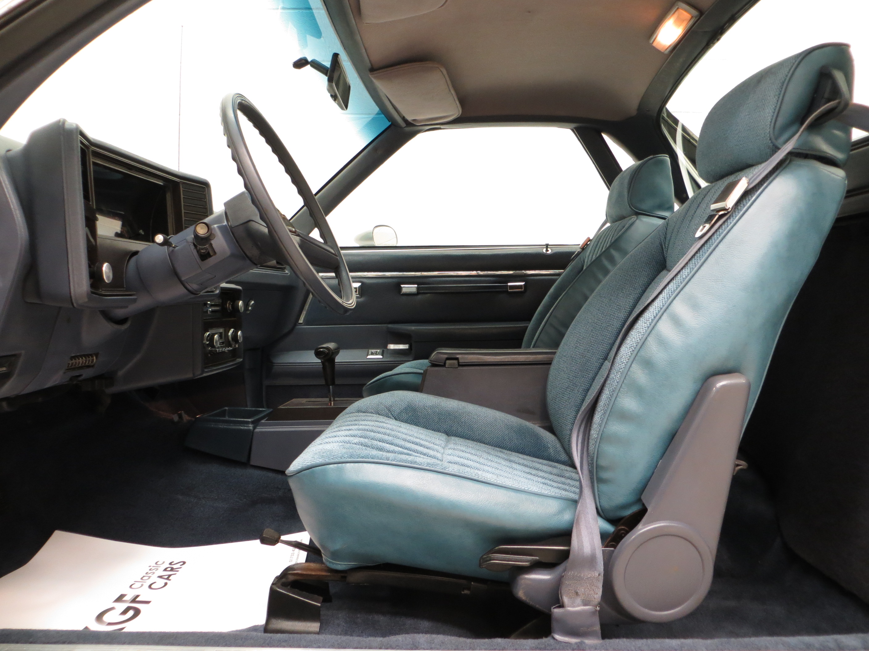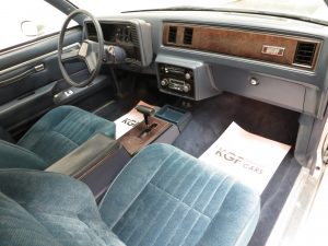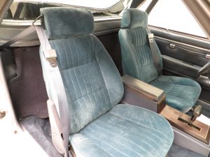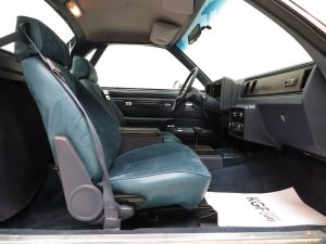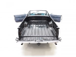 Immensely comfortable the contrasting Blue Velour interior, (Code CDD2), presents very well. The supportive individual bucket seating is undamaged and headlining, door cards and colour-keyed nylon cut pile carpeting is clean. Fake wood trim adorns the spacious cabin and all gauges work along with the GM-Delco FM/AM stereo. The power windows operate slowly and the internal power locks also work but the drivers remote mirror requires manual adjustment. The Super Sport nameplate on the instrument panel above the lockable glovebox remains attached. Unlike most commercial vehicles the El Camino offers car-like comfort and refinement in a stylish package.