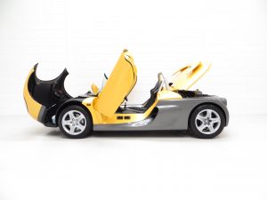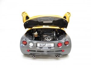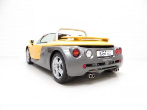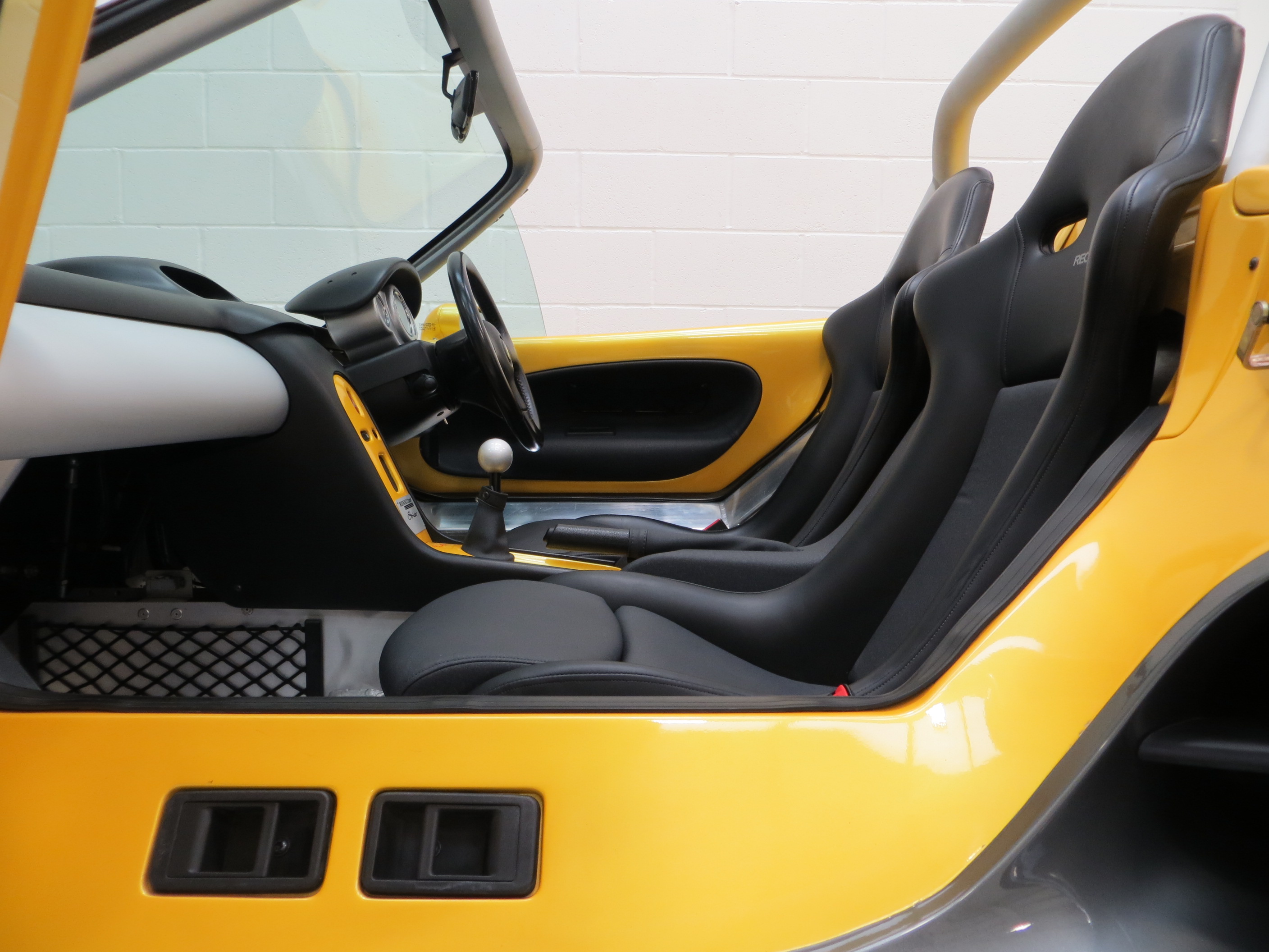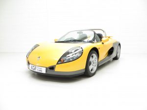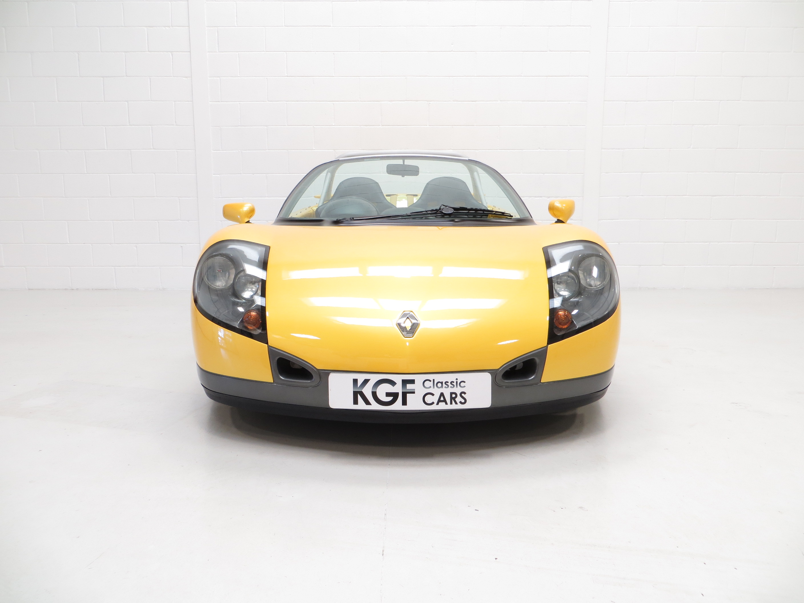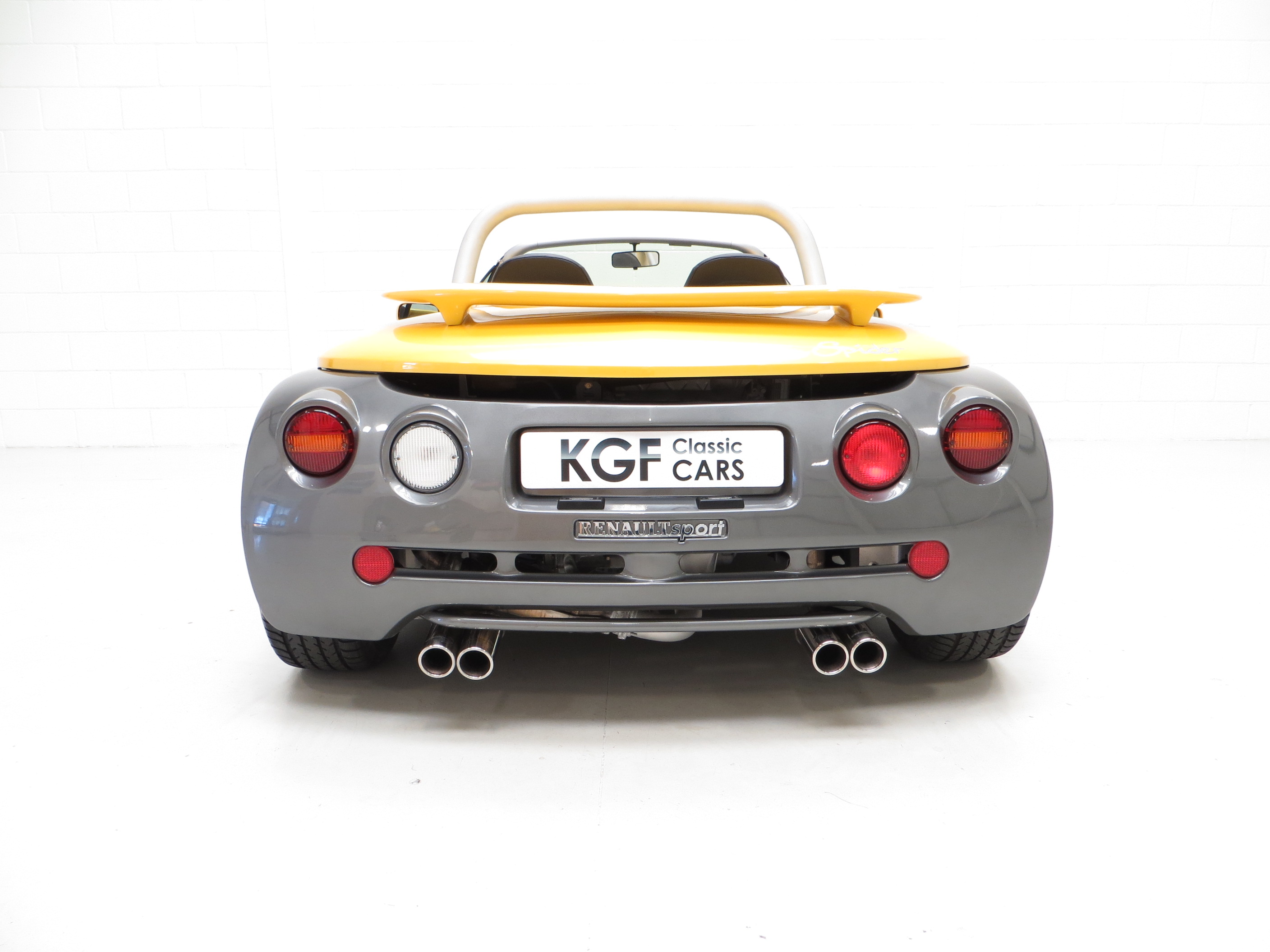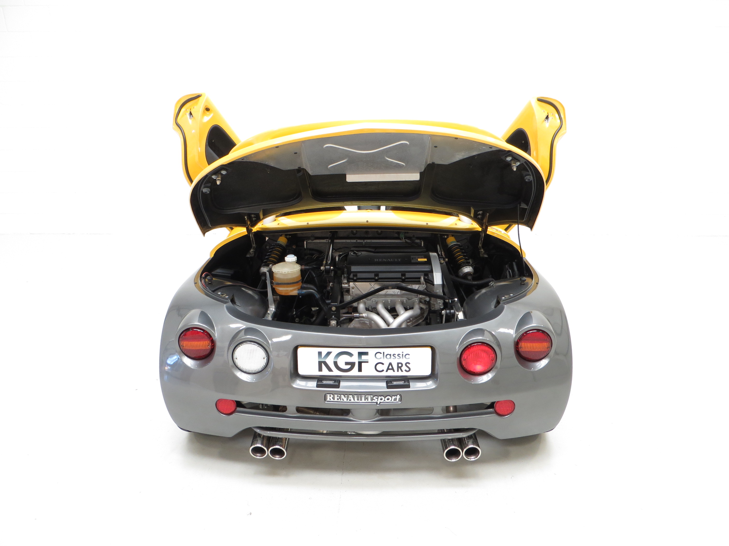 The arresting two-tone colour scheme finished in desirable metallic pearlescent Sports Yellow, (Code 535), looks incredible and can trace its heritage to the Laguna concept car in 1990. The smooth pebble-like design is uncluttered and muscular with large air-gulping side scoops and attention grabbing ‘beetle-wing’ cantilever doors. Having covered an amazing 2,528 miles, the original condition is virtually flawless and the desirable all-weather kit as new. Close scrutiny will reveal nothing other than miniscule markings and a tiny scratch to the front clamshell on the offside. The jacking point red triangular guide stickers are still attached and the heated front screen has the chassis etching and Renault service sticker. An entirely hand built car and so rare.