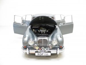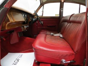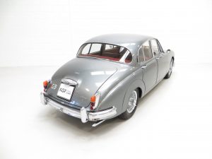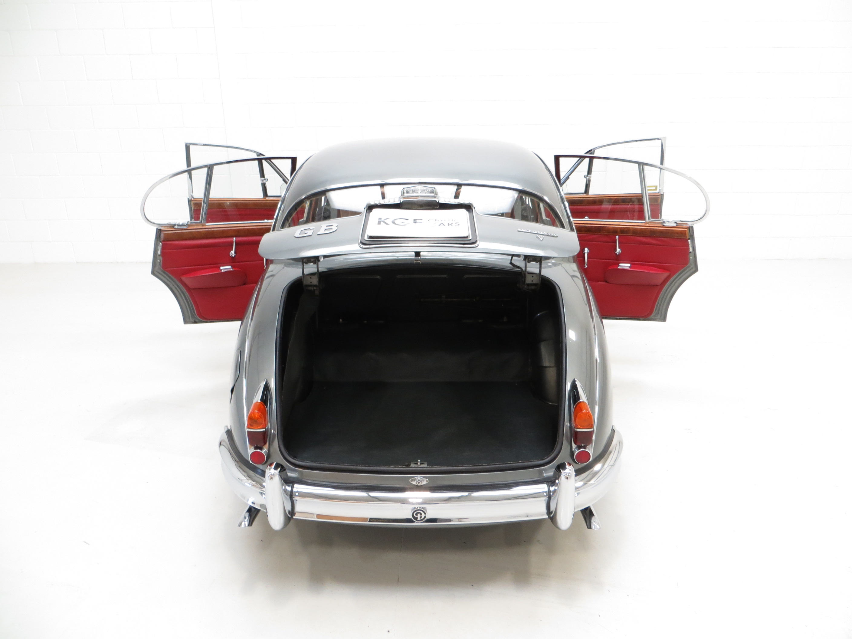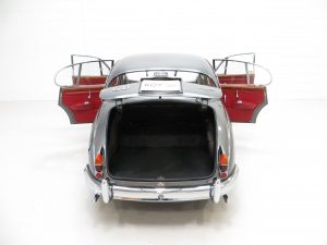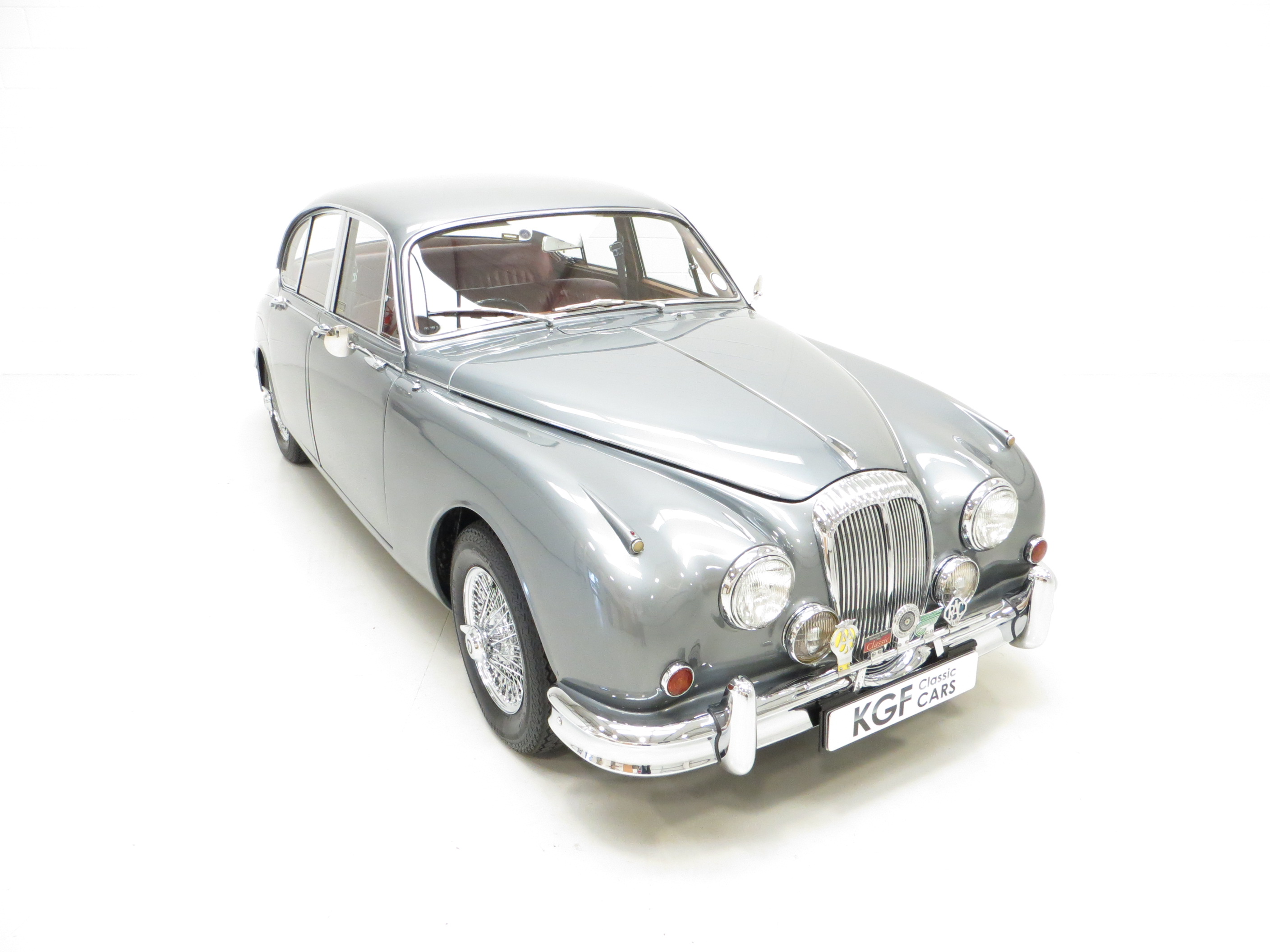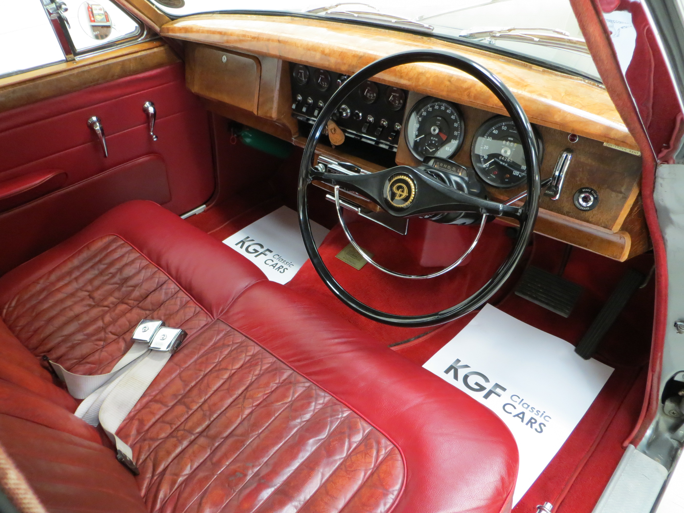 With the high specification of equipment and material finish, the Daimler variant was to cater for the most indulgent of buyers, and it was light-heartedly quipped at the time to be Daimler Saloon’s for the Bank Manager and Jaguar MKII’s for the bank robber! The original finest quality Vaumol leather hide in Red is preserved in wonderful condition but does display natural and dignified aging. Luxury starts from the ground up with deep pile carpets over thick felt underlay, full matching door dressings and individual central arm rests. The soft velvet headlining does show some discolouration. The beautifully crafted polished figured walnut instrument panel features a plethora of ornate and fully functioning switchgear and Smiths gauges, and the original Bakelite steering wheel with Daimler emblem and horn ring is a work of art. Incredibly, a selling dealer fascia sticker and tax disc holder have remained fitted as have the optional Daimler seatbelt clasps. The boot area is very clean and houses a rare full tool kit. Reminiscent of a bygone luxury motoring age, even the leather and wood scent will ignite fond nostalgia.