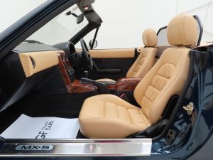 Laminated windscreen, retractable halogen headlamps, bright finish door handles, colour keyed bumpers and outer mirrors, colour keyed mud guards, manual folding black canvas soft top, side impact beams, window etching, tachometer, bucket seats, adjustable headrests, locking glovebox, locking centre storage box, power steering. Mazda MX-5 Gleneagles Edition specification; Gleneagles badging, 15” alloy wheels, Classic leather upholstery, wood effect console trim, Gleneagles Tartan gear lever gaiter, upholstery co-ordinating tonneau edged in Gleneagles Tartan, Gleneagles Tartan owner’s wallet and key pouch, steering wheel centre badge with Gleneagles emblem. Dealer options; Scuff plates, Supaguard protection treatment.