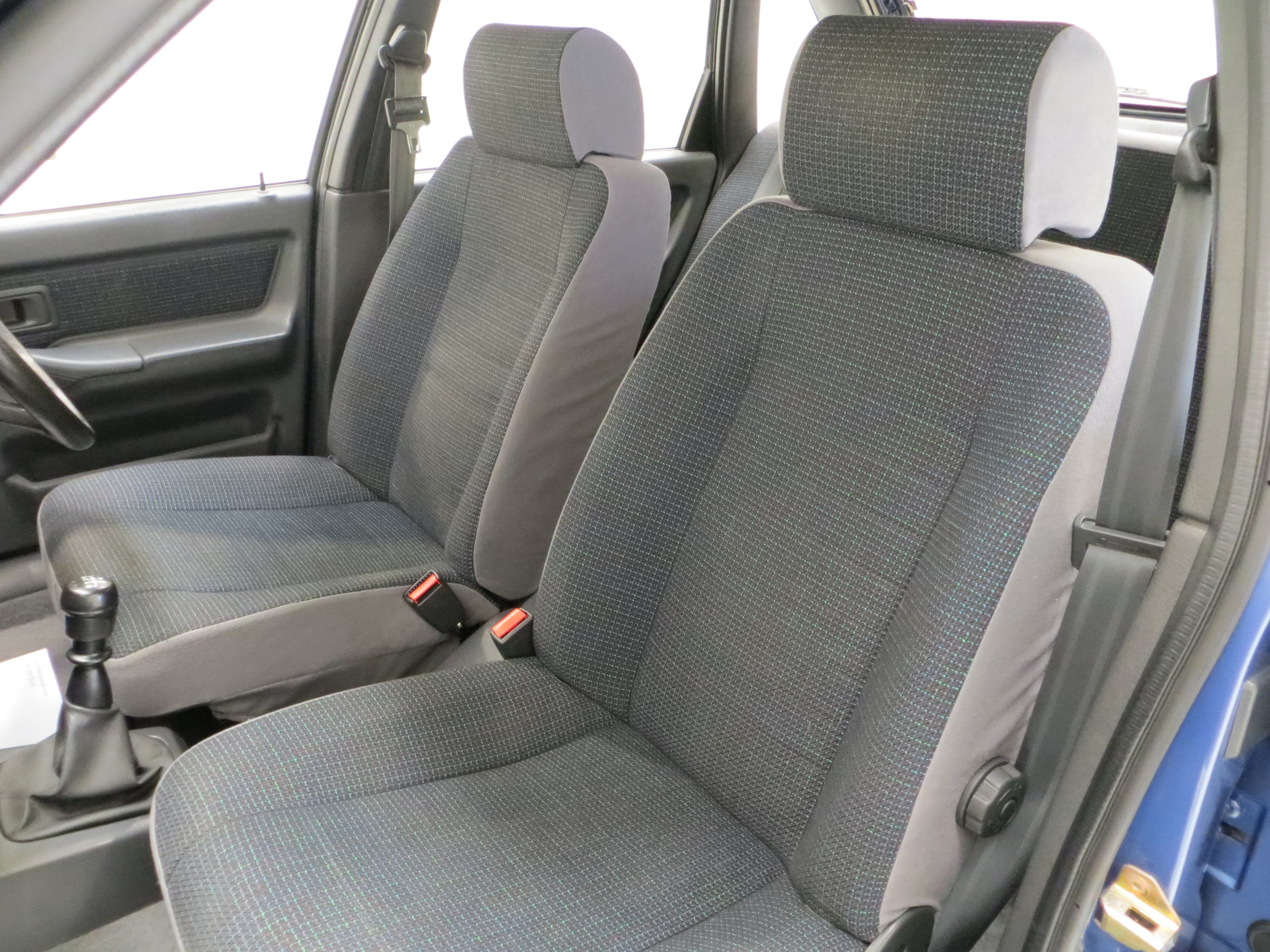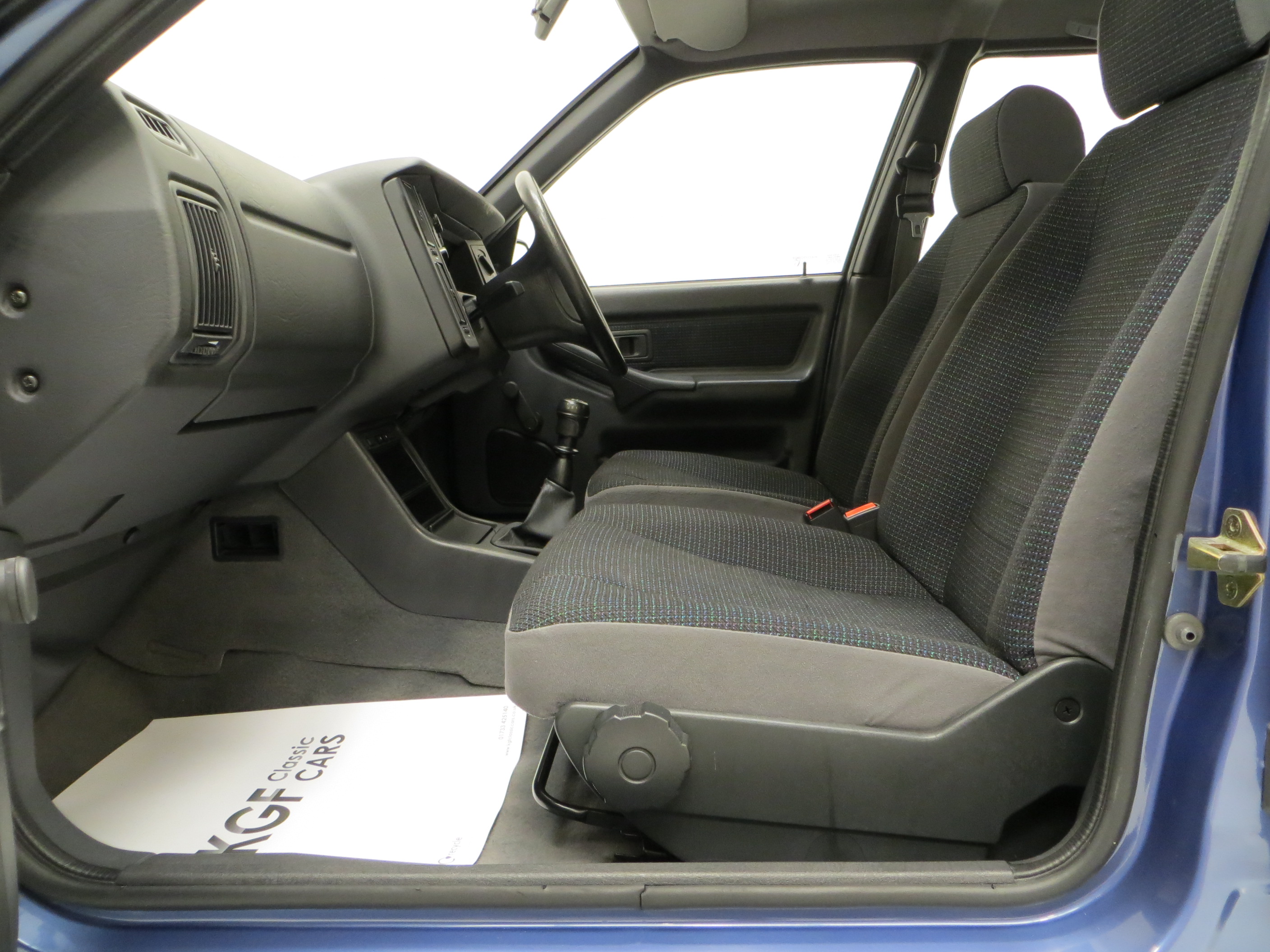 Rigid steel safety cage, impact absorbing crumple zones, side impact bars, halogen headlamps, laminated windscreen, seatbelt warning indicator, glove box, front door pockets, heated front seats, heated rear window, interior courtesy light, water temperature gauge, radio cassette, rear headrests, 4 speed heater fan, clock, rear wash/wipe, high-level brake-light, bulb-blown warning system. Factory options; Metallic paint.