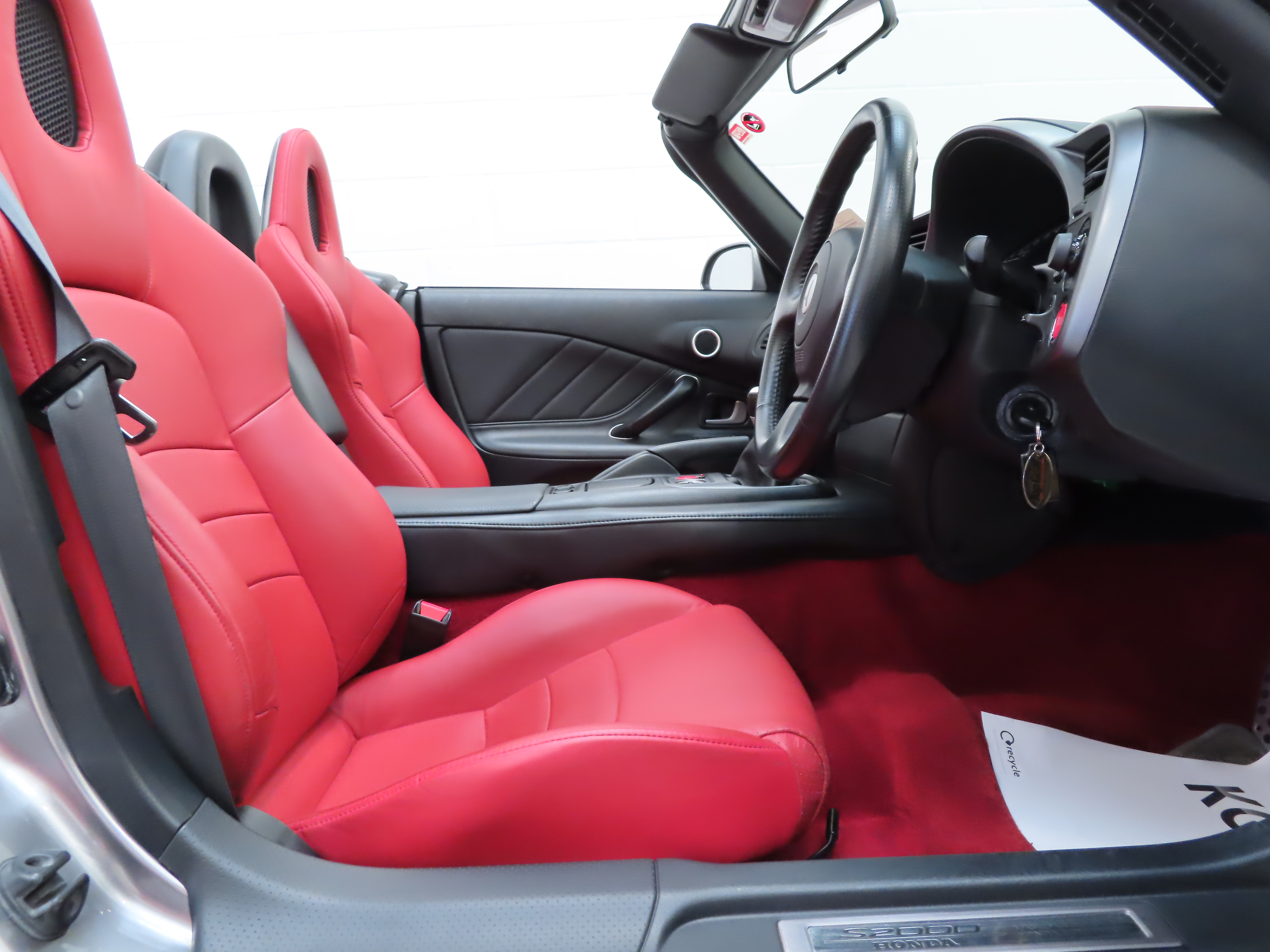 Side impact protection beams, seat belt buckle pre-tensioners, front and rear anti-roll bars, roll over protection, headlight washers, high level rear brake light, SRS airbags, electrically adjustable and heated door mirrors, HID headlights, bee-sting aerial, remote keyless entry, air conditioning, alloy gear knob, leather wrapped steering wheel, drilled aluminium pedals, electric soft top, tonneau, Honda 2SFO stereo, remote stereo controls. GT Specifcation; S2000 hard top with heated glass screen, hard top stand and storage bag, external temperature gauge. Dealer Accessories; Honda tailored floor mats, rear headrest airflow screen, Honda locking wheel nuts.