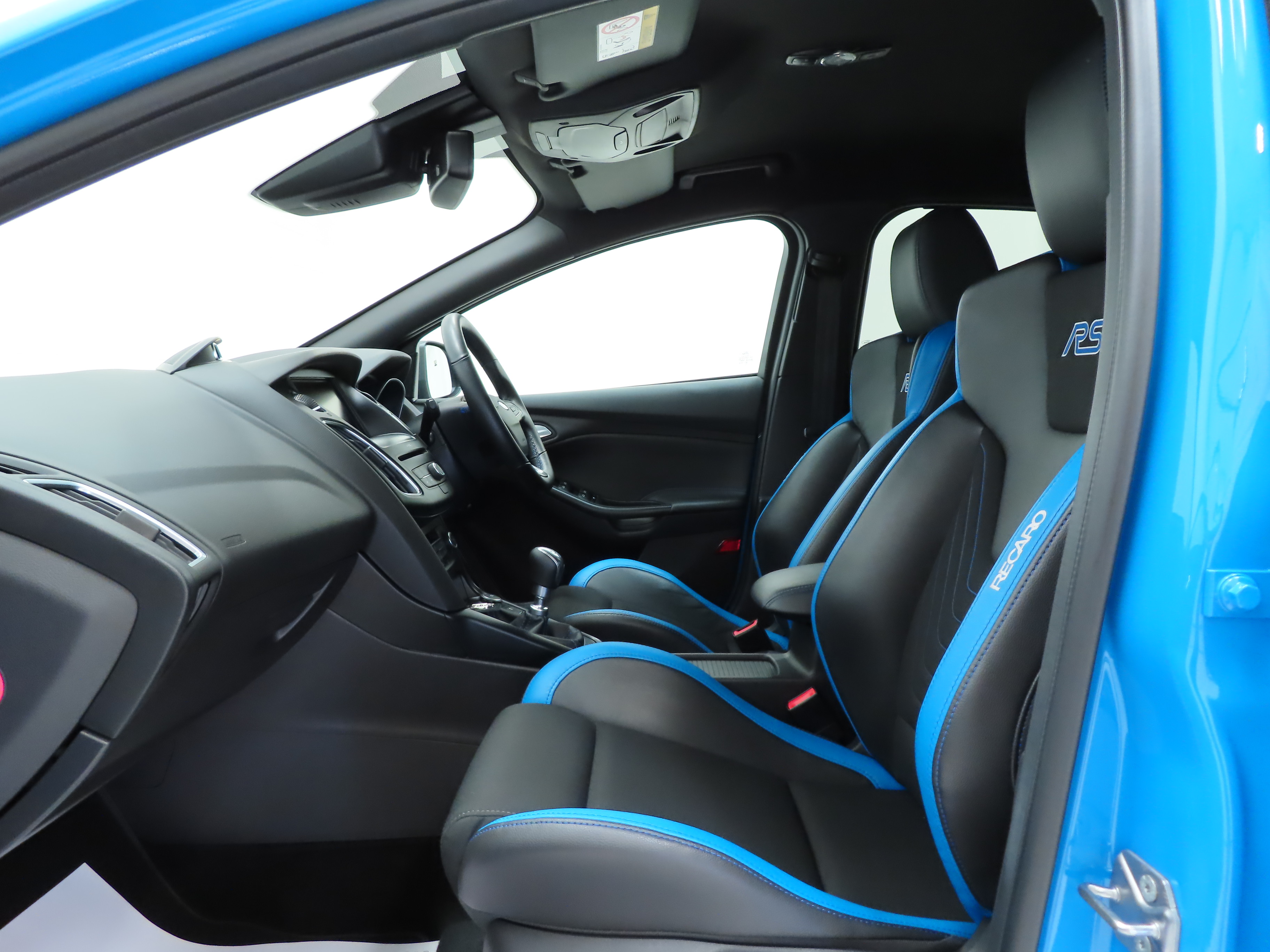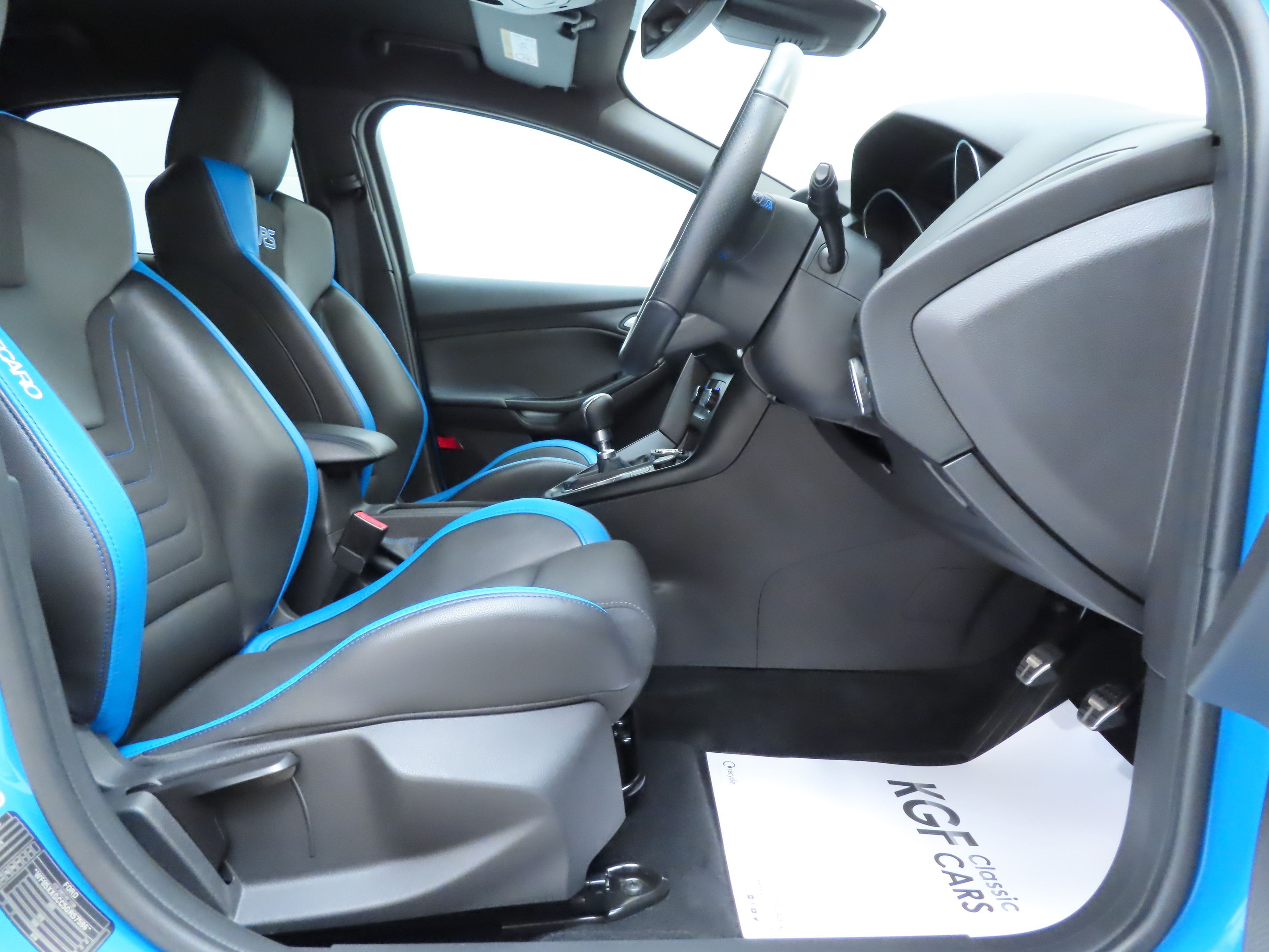 This Ford Focus RS sets the benchmark for driver exhilaration and the high performance character is reflected throughout the interior. The signature Eton/Race Track RS Recaro seats finished in Charcoal/Salerno leather in Nitrous Blue, (Code AP), are unique to cars finished with the Nitrous Blue body and are immaculate having had seat covers fitted for protection. Extrovert styling such as the flat-bottomed leather steering wheel and brushed aluminium tread plates with RS logo complement this Luxury Pack example. High specification optional features such as the ingenious automatic door edge protectors to the Ford SYNC2 navigation system with 10 premium Sony speakers and subwoofer will benefit the next owner. Standard carpet mats are present and along with all other trim and controls, are in prime condition.