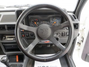Later RS seven spoke alloy wheels are unmarked and are shod with matching Pirelli P5000 195/50 R15 tyres. Diagonally split hydraulic circuits with tandem master cylinder, vacuum servo assistance and 9.4” ventilated discs up front bring the car to a halt well.
