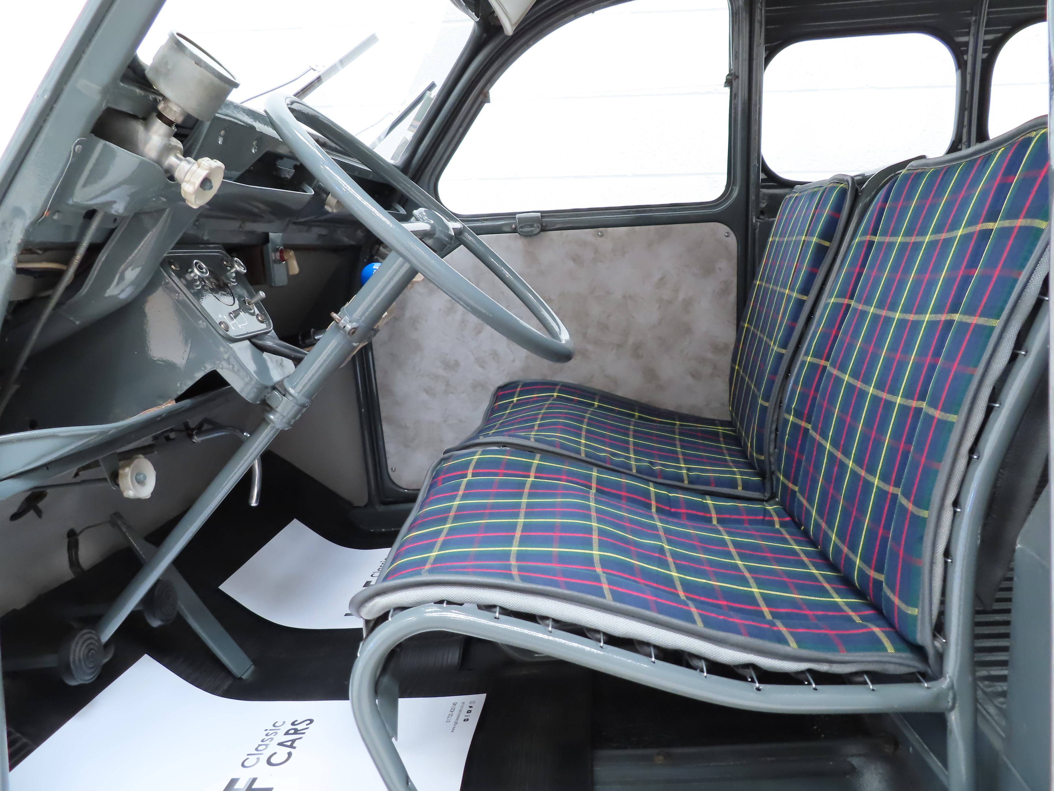 Steel corrugated body panels, twin side-hinged rear doors, rear hinged side doors with openers, spare wheel compartment, rear grab handles, triple side rear glass panes, nearside door mirror, steel slatted grille with chevon emblem, mudguard flaps, one rear light, side repeaters, rear reflectors, removable seats, batterie gauge, headlamp adjustment control knob, pull starter, choke, column mounted Jaeger speedometer with gear change markings, horn, speedometer driven wipers with manual override, scuttle ventilator, sun visors, rear view mirror.