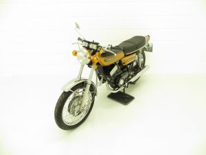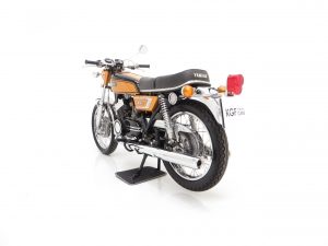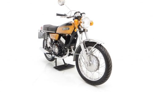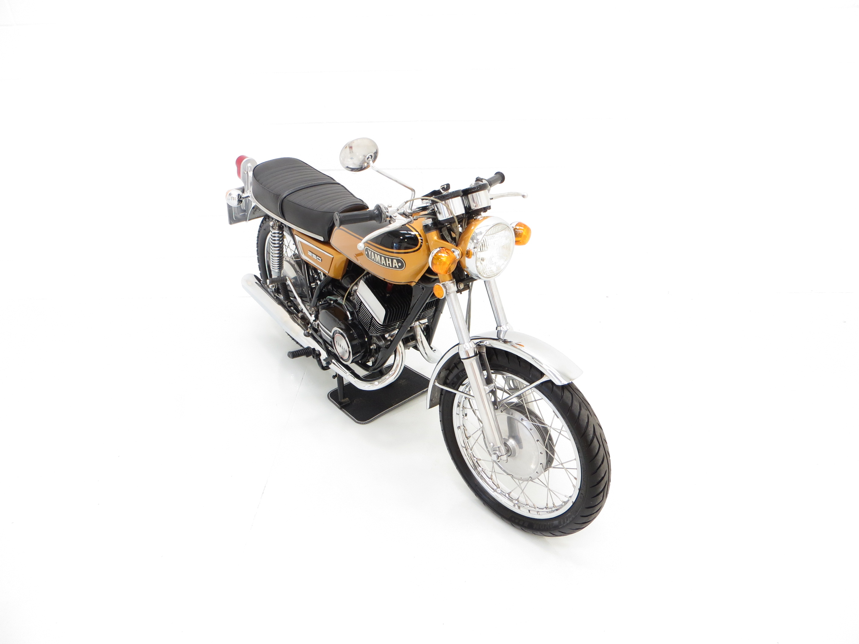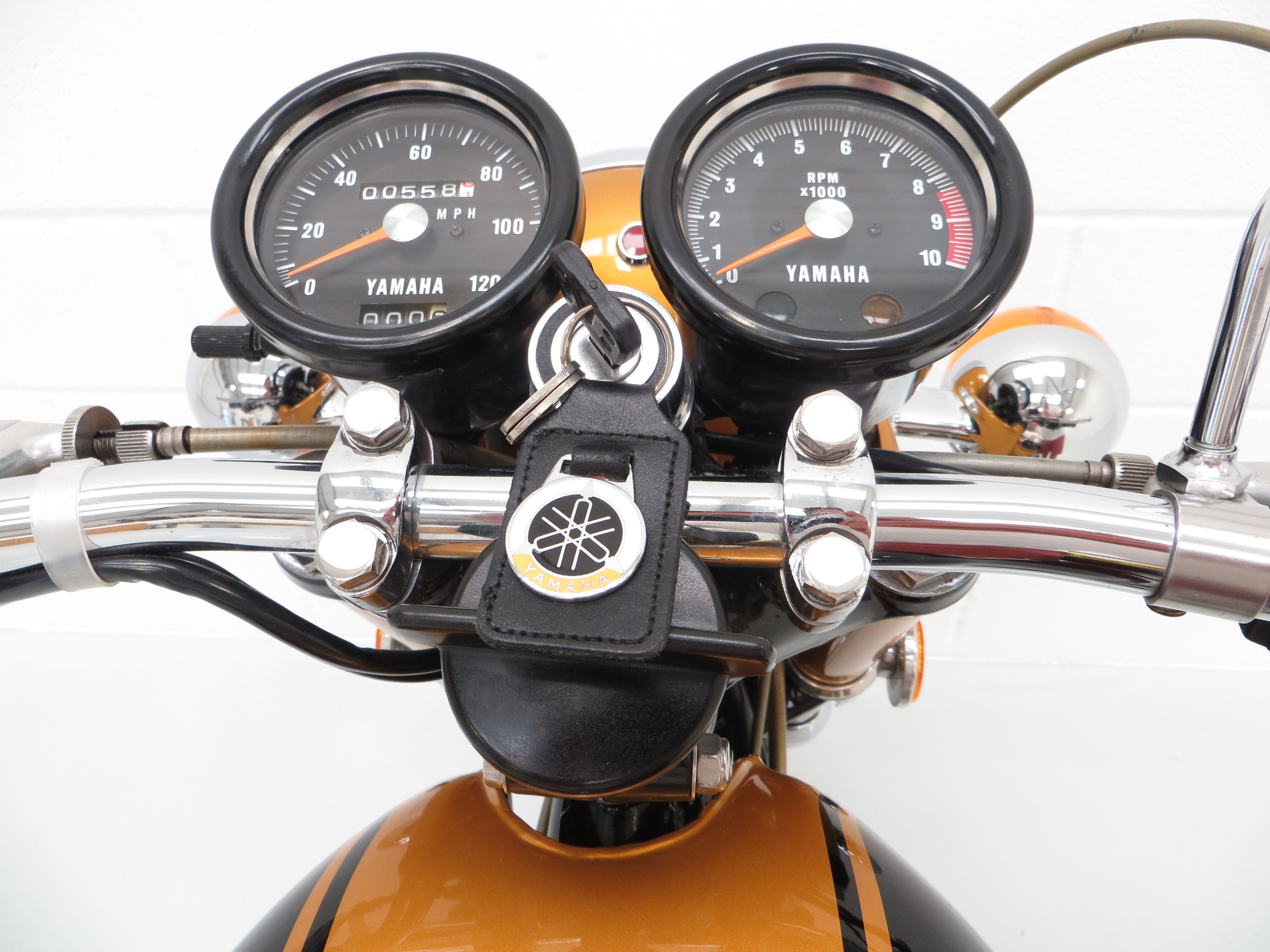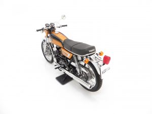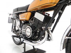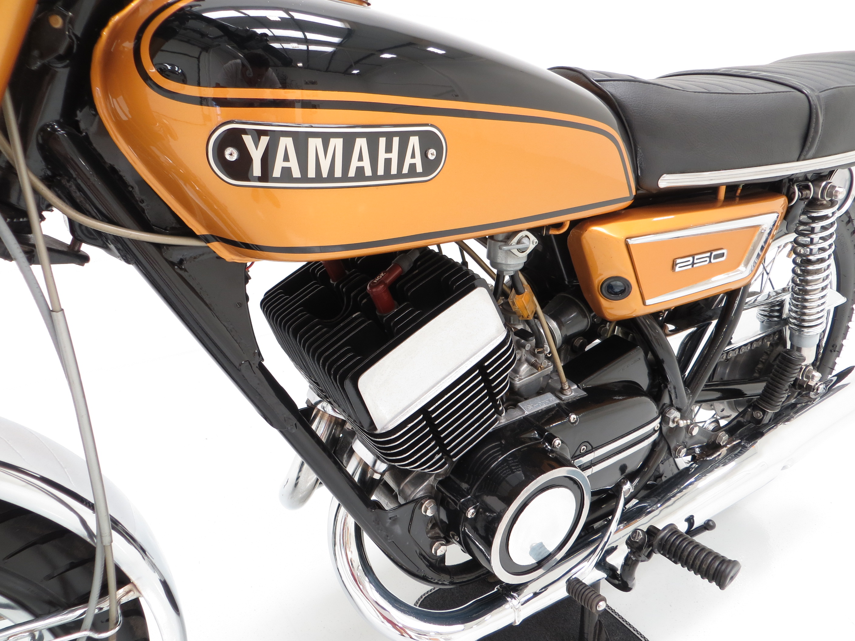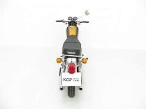 The original engine number stamping confirms this as a matching numbers machine. The 2-stroke, 5 port parallel twin engine has a 247cc displacement and produces 30hp at 7500rpm and 21.1lb-ft of torque at 7000rpm. Manufacturer marketing literature quotes a maximum speed range of 93-100mph, quarter mile in 14.8 seconds and climbing ability of 24 degrees! Advanced features at the time such as Yamahas Autolube system eliminate bothersome messy premixing of fuel and facilitates automatic feeding of just the right amount of oil to the engine as needed. This example kicks into life effortlessly and performs wonderfully. The engine is spotlessly clean and the original crank casing retains the high-polished finish and Yamaha lettering. The 5-speed ‘one down four up’ transmission with working neutral indicator is effortless in operation.