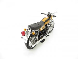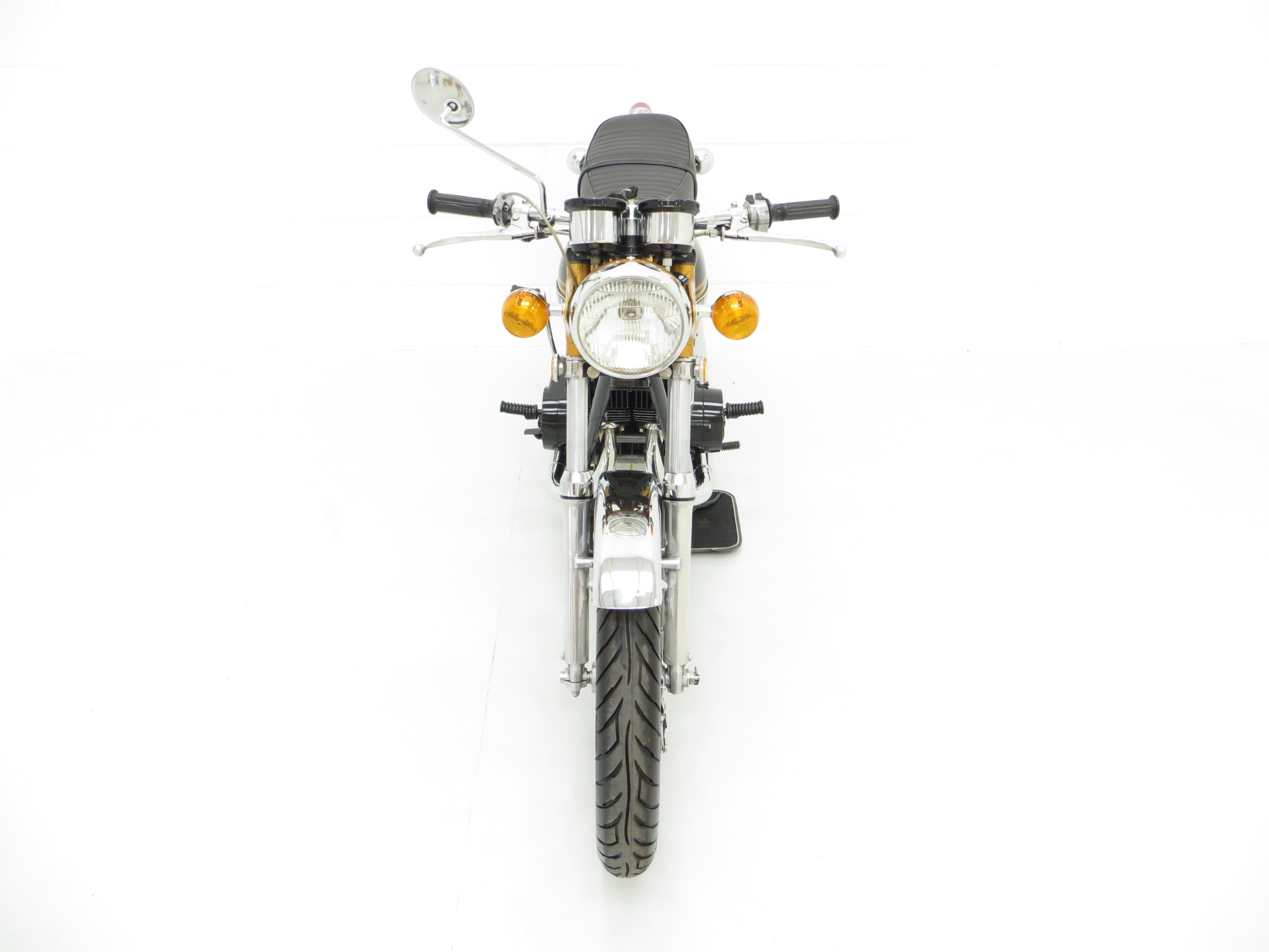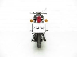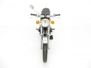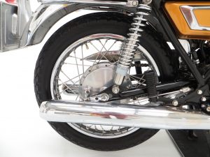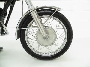 The original 36 spoke chromium plated wheel rims are unrestored and display only very light aging, but nothing to detract from the bright shiny finish. Quality branded 90/90 18 front and 3.50-18 rear tyres retain excellent tread and good rubber condition. Waterproof-Dustproof brakes are non-fade with minimum braking distance quoted in the manufacturer marketing literature of 46ft at 30mph. The brakes perform exactly as intended.