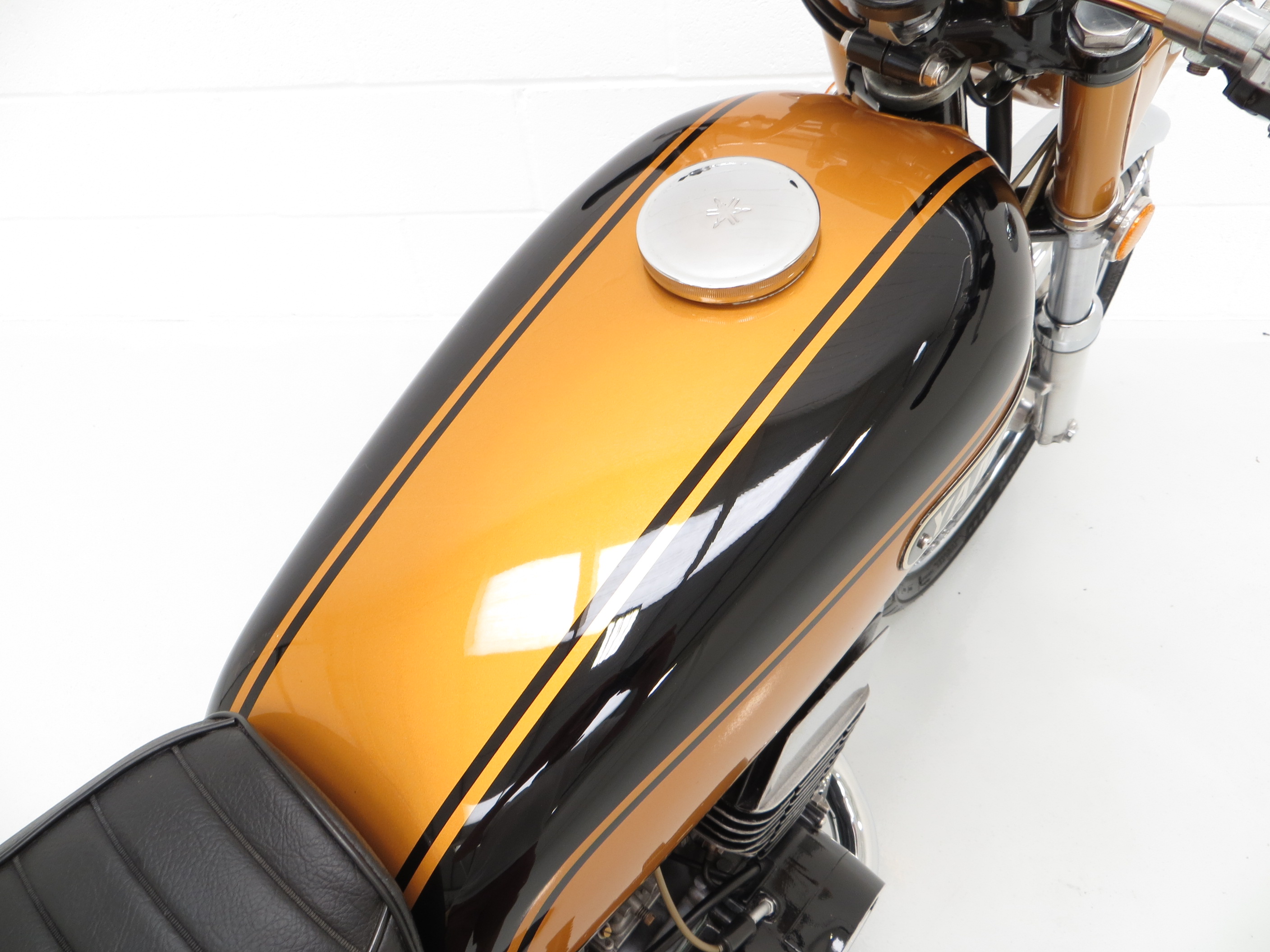 The Yamaha 250 Street DS7 was built for just one year in 1972 and was the initial forerunner to the popular RD Series, introduced in 1973. This example is finished in the desirable and wonderful period colour scheme of Black and Gold from Black and Blue. The pristine paintwork to the petrol tank, side faring and headlamp bowl boasts a deep shine and superb glossy finish having been subject to professional refurbishment in 2013. The Featherbed-type double cradle frame is in fantastic order and the stock VIN stamping is clearly legible. The bright chrome pieces are in excellent order with only very light ageing evident, most notable being two small dings to the front lower mudguard. The seat covering with Yamaha lettering to the rear is completely damage free and all switchgear, controls, light and gauges operate as they should. A fantastic collectable example of this very rare two-stroke street machine.