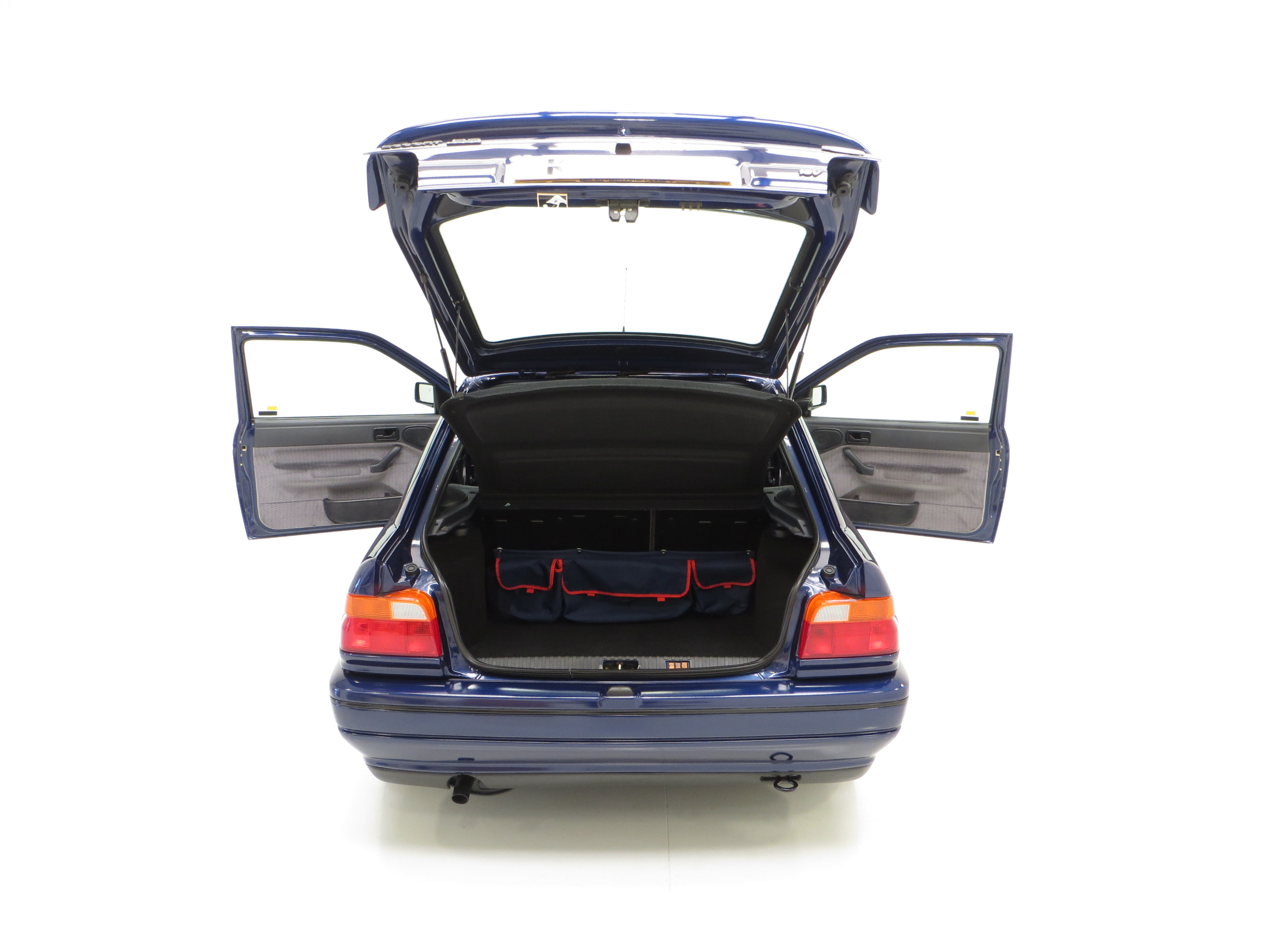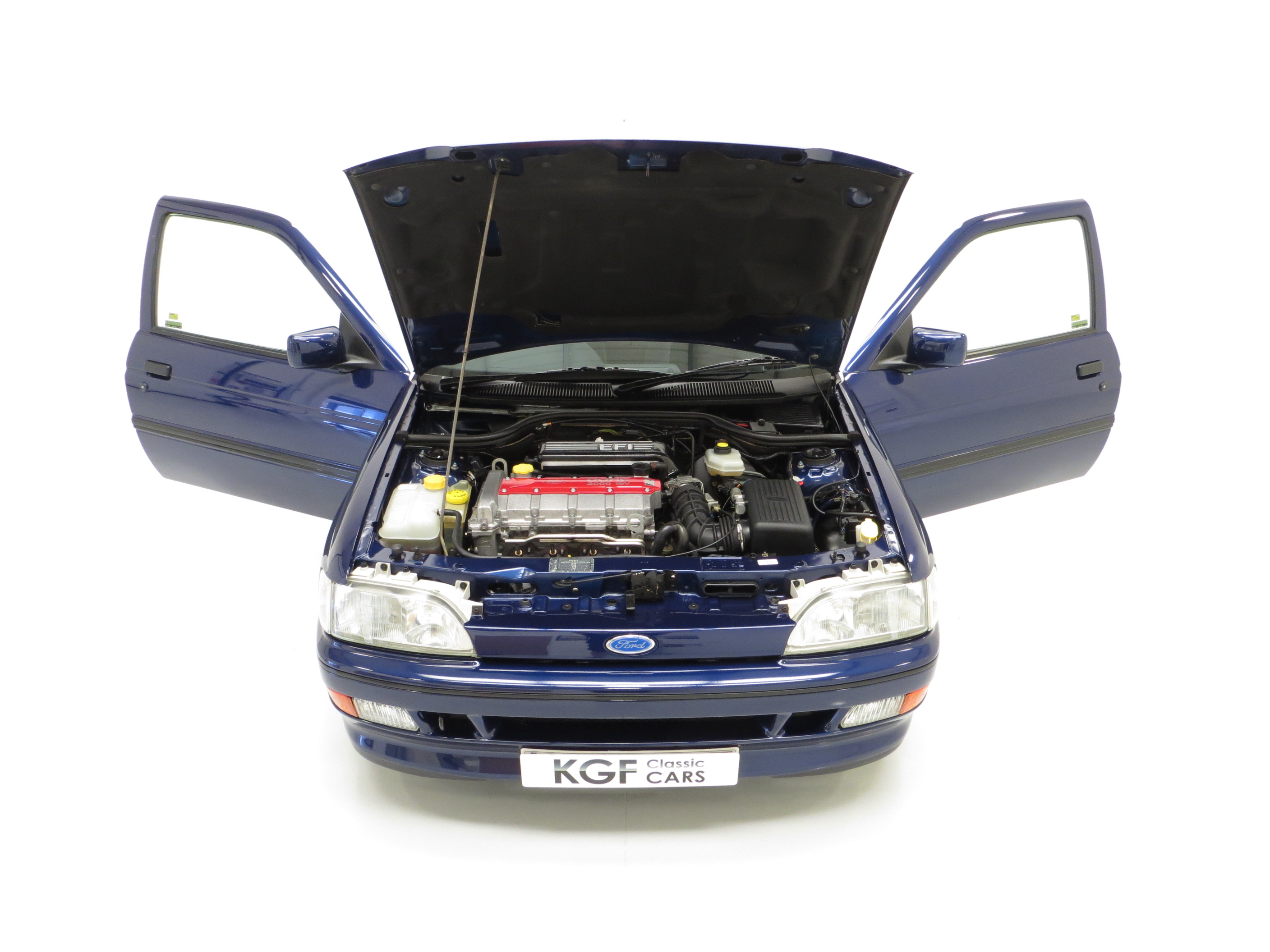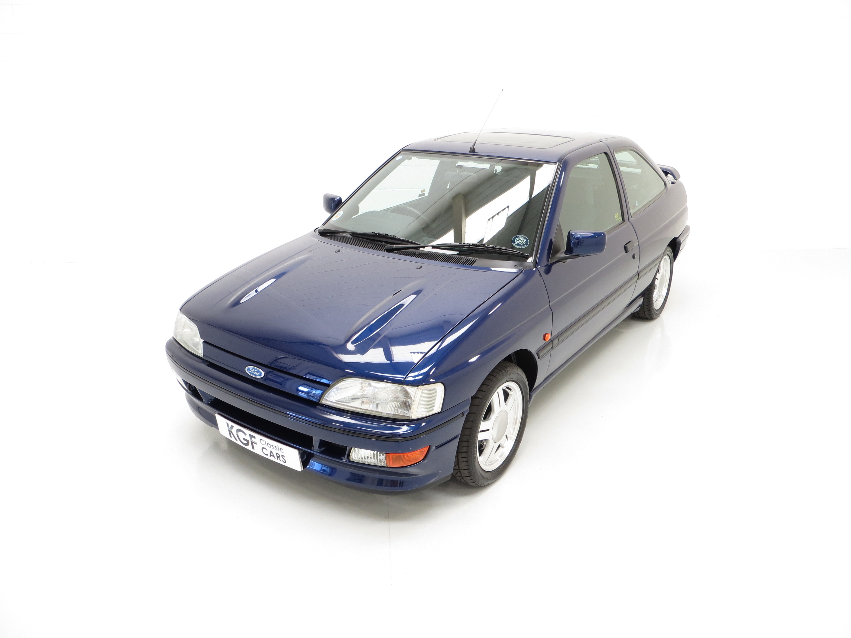 This original example is finished in optional metallic Pacifica Blue, (Code J2), which gleams thanks to indoor heated storage and very low miles. The understated looks were Fords intentions to keep away from the Boy Racer image but bonnet power bulges, revised front grille and bumper, colour coded side skirts and rear spoiler soon inform the knowledgeable. The coveted Rallye Sport badging along with all other trim is immaculate. Minor stone chips to the bonnet and a very slight roof mark prove originality and will not disappoint the perfection seeking owner. Supplying Ford dealer number plates remain fitted along with period window stickers. All apertures are spotlessly clean and the underside still displays Ford PDI colour dabs including those on the coil springs. A totally original, unspoilt and preserved example, very difficult to better.