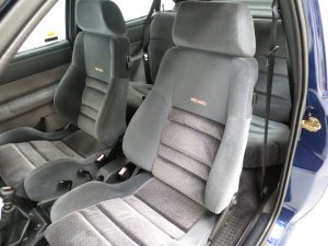 The plush Panache velour fabric in Dark grey complements the sports ambience of the car and is immaculate. The special Recaro seats are comfortable and supportive with no wear and all carpets have been protected from new by genuine rubber Ford mats. The car retains a distinct new car aroma. All controls operate with slickness and ease and the unique lighting on the dash in orange with red detailing is unmistakable. A section of red trim has lifted slightly on the dash and the steering wheel and gear knob still have prominent texture and grain thanks to the ultra-low mileage. The boot area is immaculate with a period boot tidy still attached and the parcel shelf is pin straight. An outstanding Ford RS Ford interior.