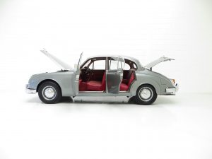 Built in late 1966 towards the end of the production run of the Jaguar Mk2 and prior to the introduction of the first XJ6, this luxurious Jaguar MKII is finished in the original colour of Opalescent Silver Grey. The paintwork presents beautifully with a deep uniform shine and high polished finish. The elegant curvaceous shape of this iconic model can be fully appreciated with the all panels straight and free from damage other than a minor defect to the top of the passenger front wing. The extensive high-quality chrome finishers are undamaged and in excellent order with only very light aging evident upon close scrutiny. Advocates for originality will note Lucas light fitments and lenses including the Jaguar rear number plate lamp and small side lights incorporated into the front wings which show some discolouration to the lenses. The original rubber trim sections are showing age related deterioration. A magnificent classic Jaguar, a true British Icon.