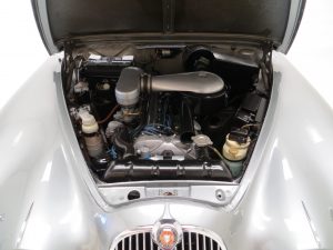 The 2.4 litre Jaguar XK engine is the factory fitted unit and is therefore matching numbers. Featuring the correct twin SU HS6 semi-downdraught carburettors and dual exhaust system, output is quoted at 133bhp at 5500rpm. The engine bay is very clean and the information on the vehicle build plate to the nearside inner wing match exactly to the vehicle records found on the Heritage Certificate. The manually operated four-speed all-synchromesh gearbox changes gear smoothly with no slip but a high biting point and features factory optional Laycock de Normanville overdrive.