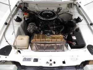 All steel welded integral construction, safety glass all round, opening rear quarter vents, rectangular sealed beam headlamps, extensive sound insulation, anti-burst locks, vinyl roof, sunshine roof with tilt, bright bumpers with rubber inserts, bumper overriders, bright finish driver’s door mirror, bright metal window side mouldings, Capri Ghia sill finishers, power steering, leather steering wheel, water temperature gauge, warning lights for alternator, oil pressure, main beam and direction indicators, quartz clock, heated rear window. Factory options; Manual transmission, bright finish passenger side door mirror. Dealer options; Mud flaps, Kenlowe fan, Clarion 967 ETA-3 stereo cassette, electric windows.