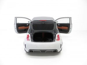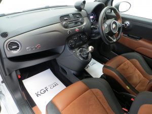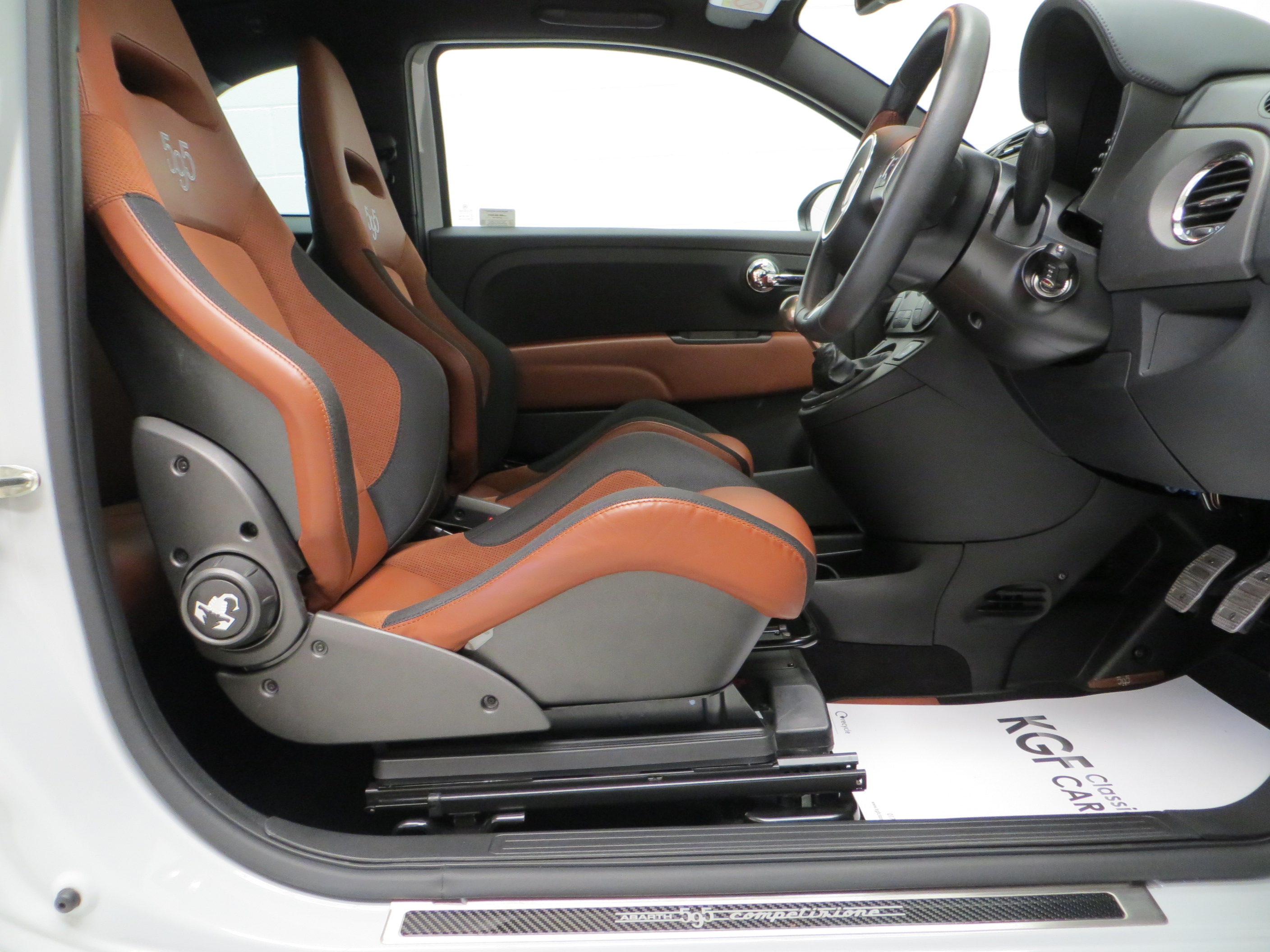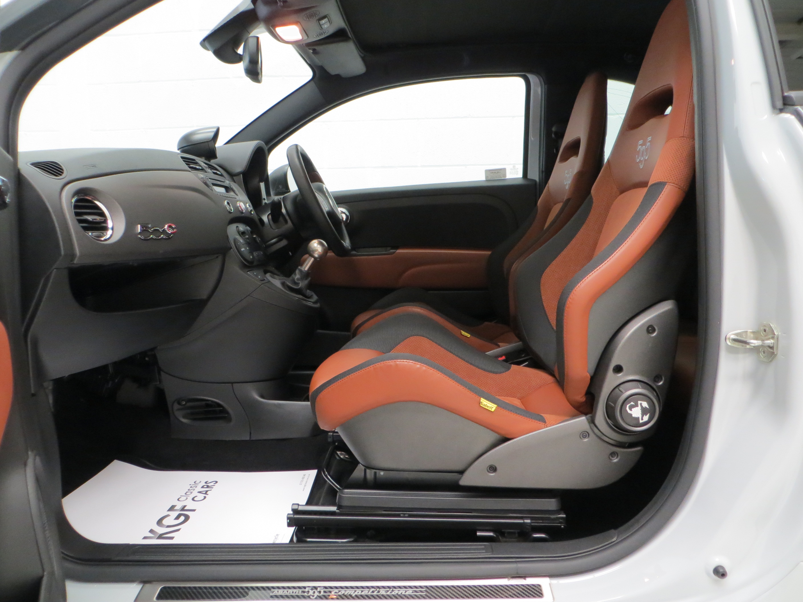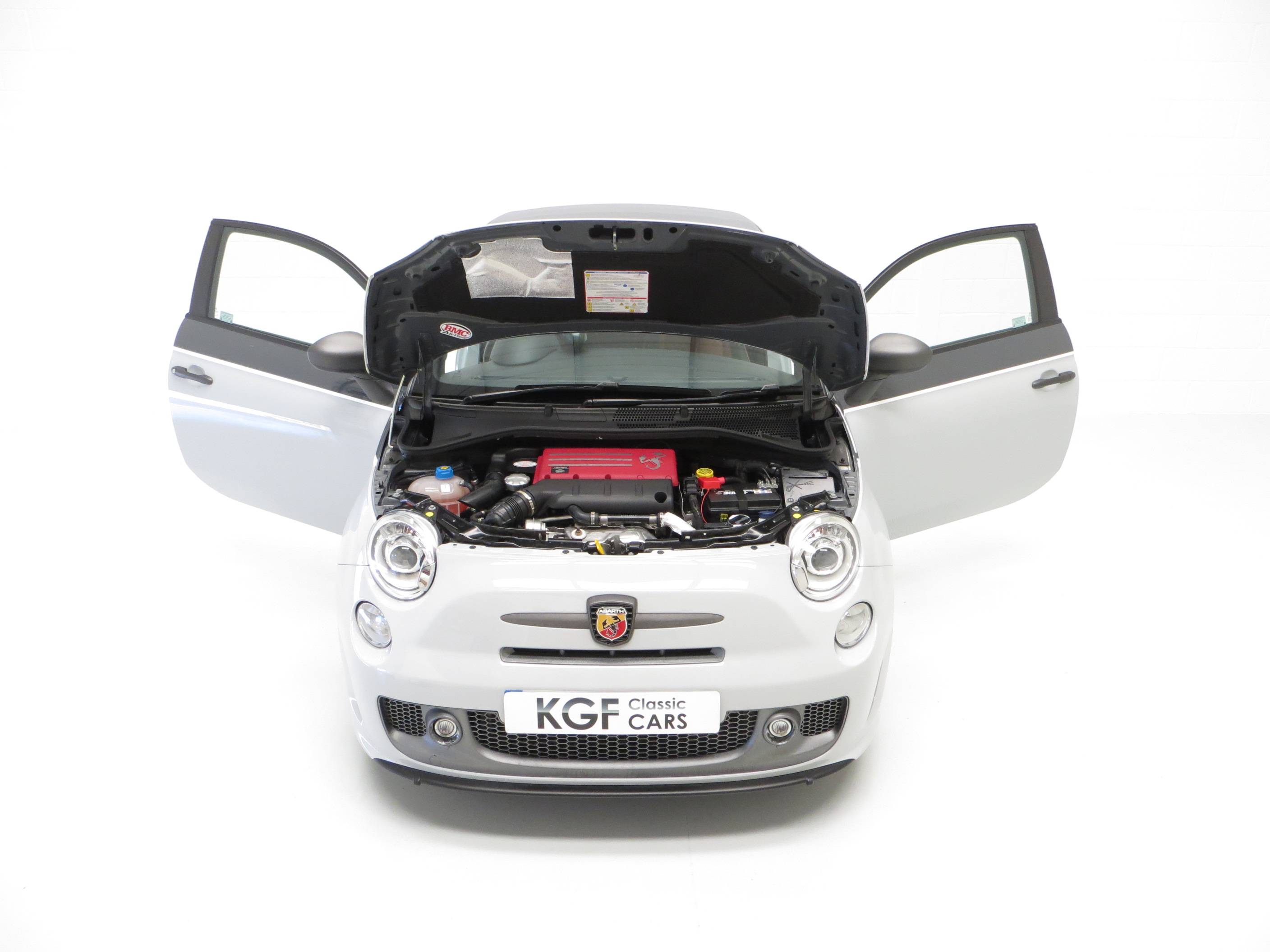 Copaf sports front suspension, Koni rear suspension, FSD (Frequency Selective Damping) shock absorbers, TTC (Torque Transfer Control), Record Monza exhaust system, four tailpipes, Xenon headlights, tinted rear windows, Sport button with turbo boost gauge, rear parking sensors, electrically operated soft top, front air intakes, rear diffuser, digital instrument panel with TFT 7” colour screen, ergonomic grip leather steering wheel, milled aluminium pedals, Abarth Corsa by Sabelt seats, 595 logo stitching, automatic climate control, Blue&Me hands free system, USB port, Bluetooth and MP3 radio. Main options; Bi-Colour paint, Natural Leather/Alcantara front seat coverings, carbon fibre seat shells, 17” Formula Magnesium finish alloy wheels, yellow Brembo brake callipers, carbon finished dashboard, wind stop.