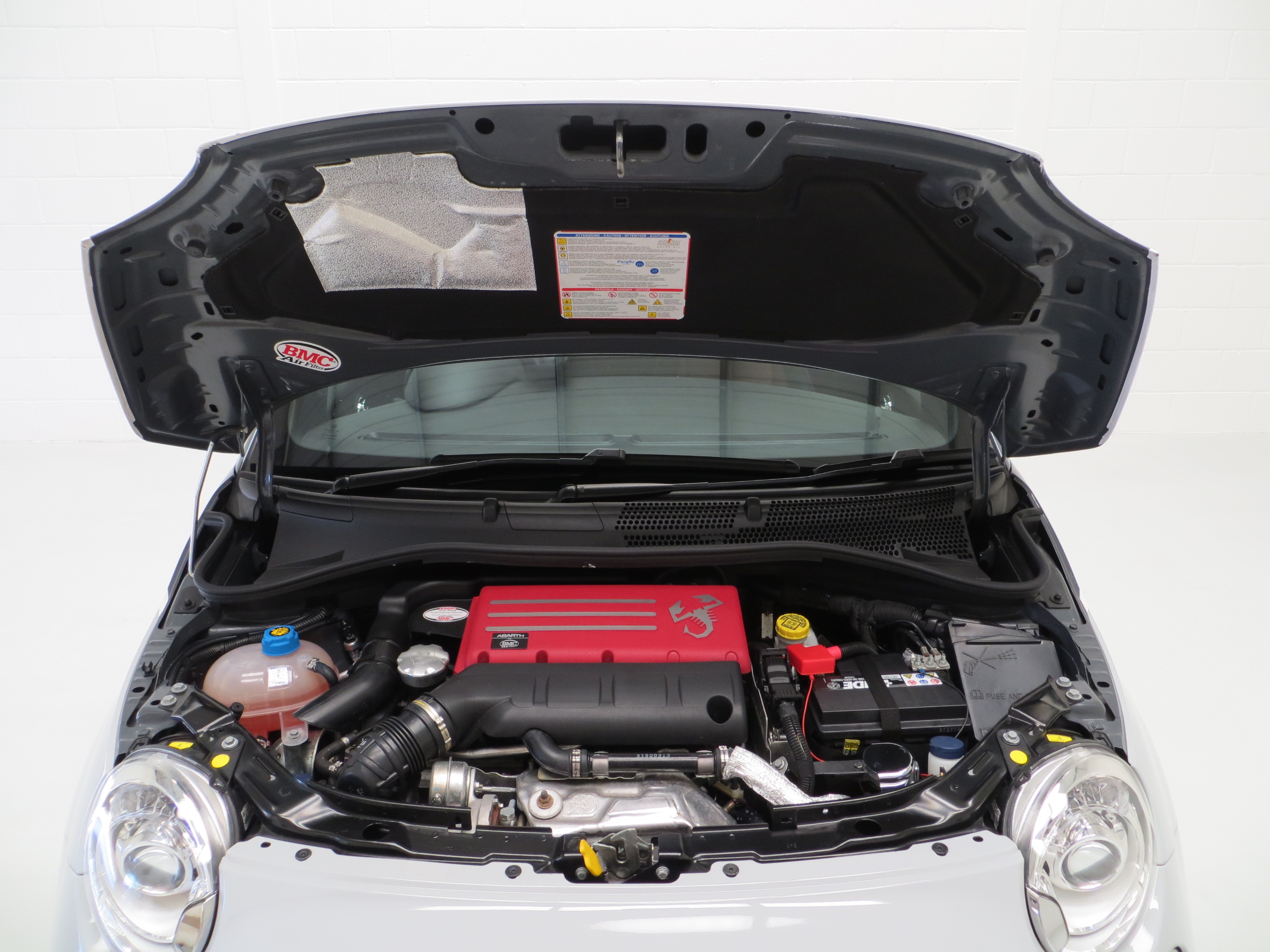 The 1.4 Turbo T-Jet 4-cylinder engine displaces 1368cc to produce 180hp at 5500rpm. Performance attributes include a Garrett turbocharger, Record Monza exhaust system and BMC high-performance intake system to achieve a top speed of 140mph and 0-62 in just 6.7 seconds with a weight/power ratio of 5.7kg/HP. The spotless engine bay with bright red rocker cover proudly displays the Abarth scorpion and features factory stickers, PDI dots and BMC branding. Lowered sports suspension with FSD (Frequency Selective Damping) and the desirable 5 speed quick-change manual gearbox complete the package to the intoxicating soundtrack of the growling exhaust note!