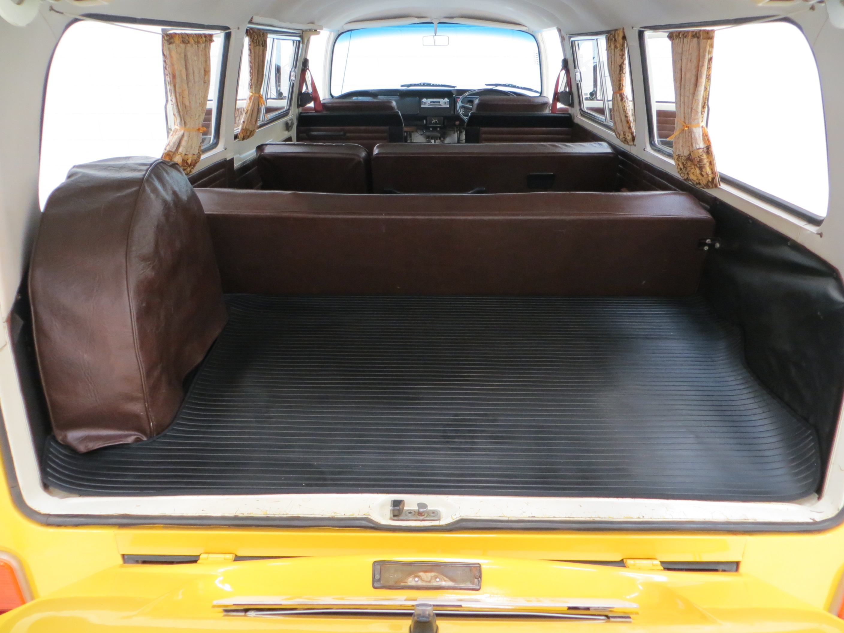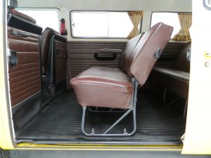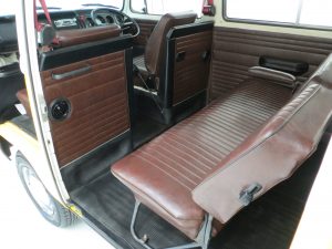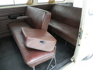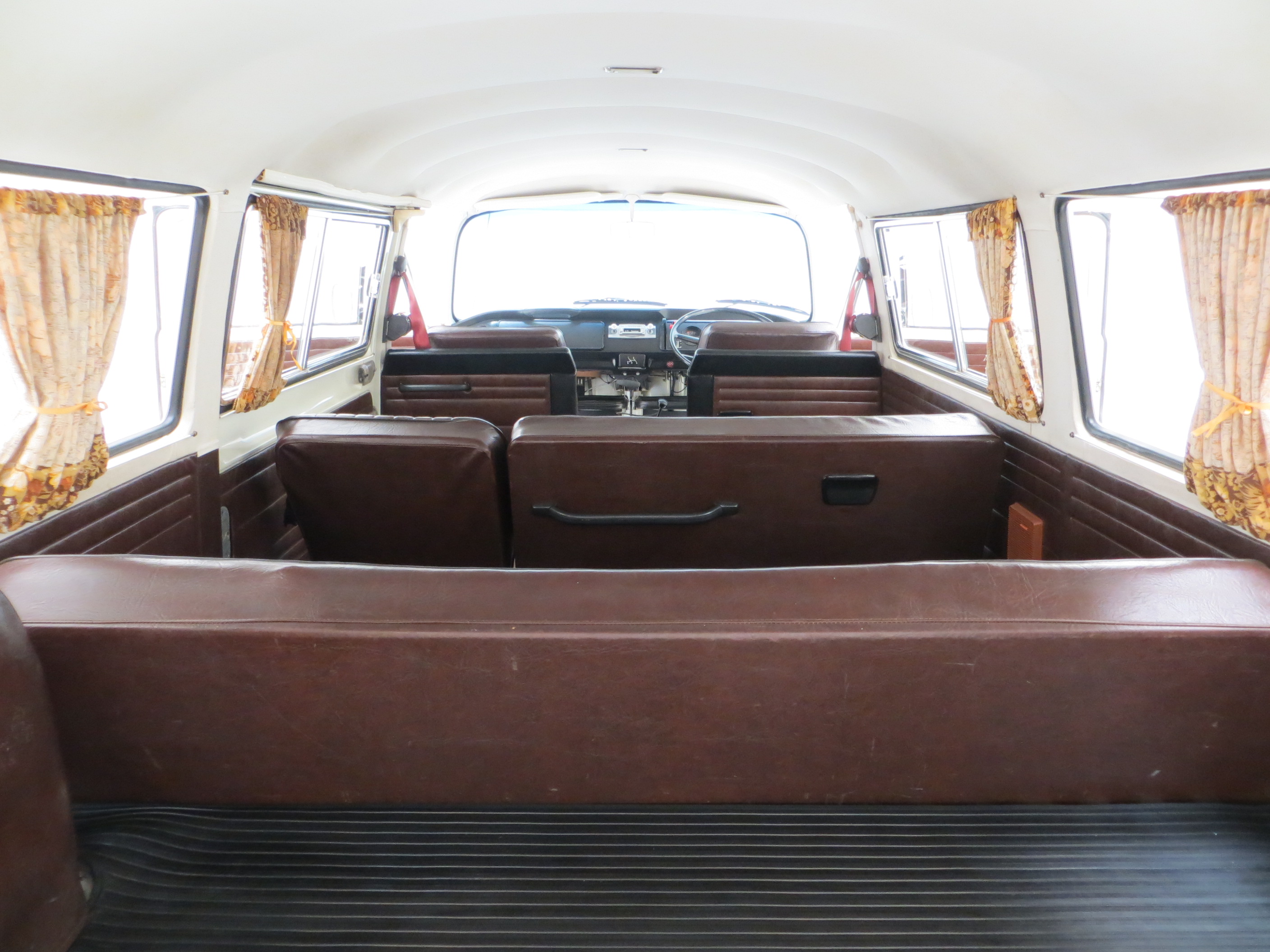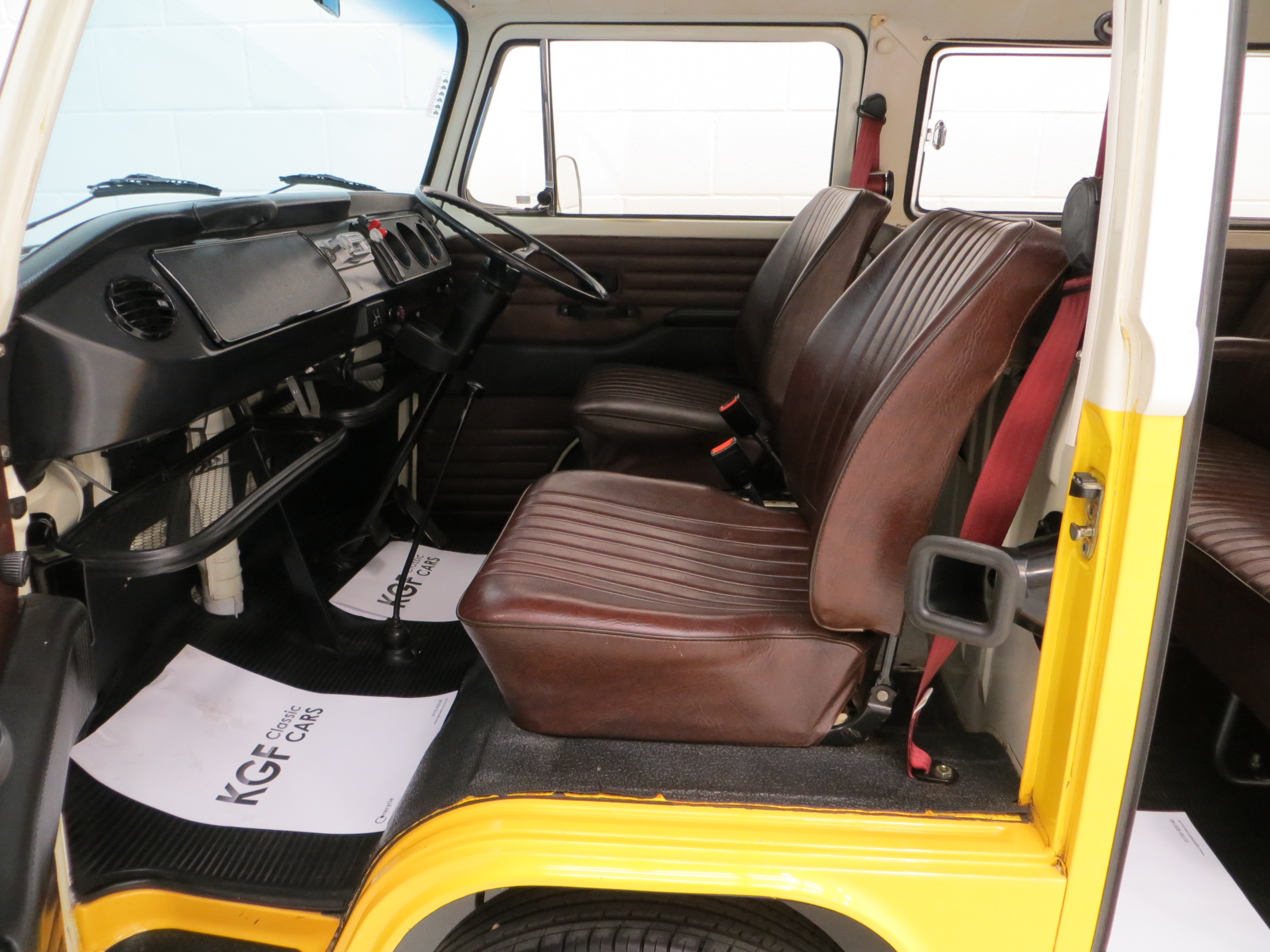 An ingenious and hugely practical interior is revealed upon opening the wide front 90-degree cab doors and huge slide loading door. The neatly designed and well thought out passenger compartment will comfortably seat 6 occupants with masses of leg and head room, whilst leaving the large roof high luggage compartment unimpeded. The cabin space offers space for two further occupants in the fully adjustable seats. The seats, door cards, side panels and matching spare wheel cover are trimmed in original Dark Brown Leatherette PVC, (Code 68), which remains in superb order with no rips or damage. Even the safety armrests are fully intact, although notable upon close scrutiny is a repair panel to the driver’s seat lower bolster which is slight off colour. Factory build plates are found behind the driver’s seat and there are factory stickers still affixed the driver’s door shut. The handsome head liner is undamaged and shows only very light discolouration, and all controls and functions operate well. With plenty of room for friends and family, this is the ultimate recreational classic.