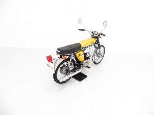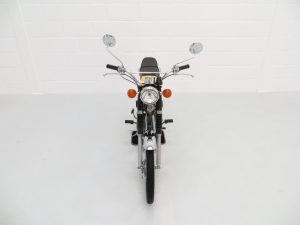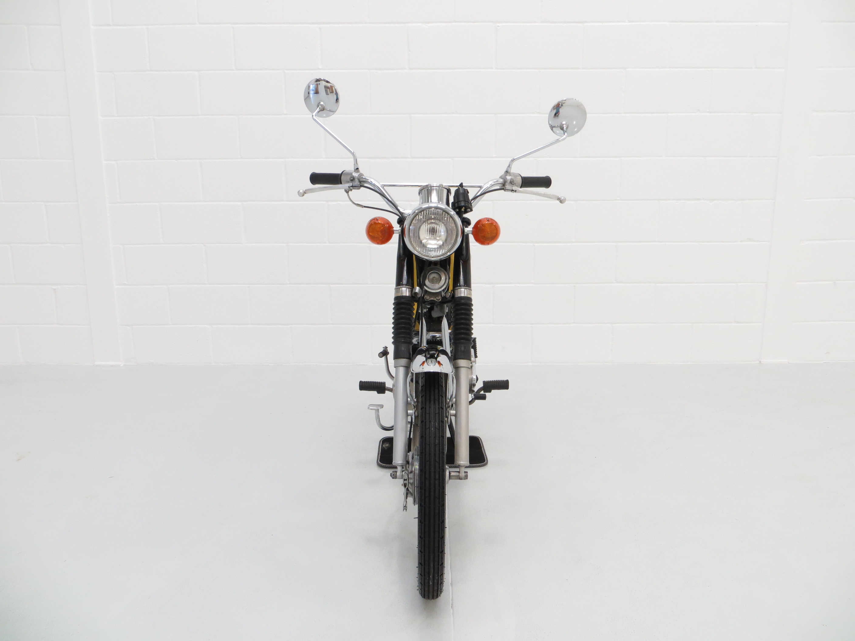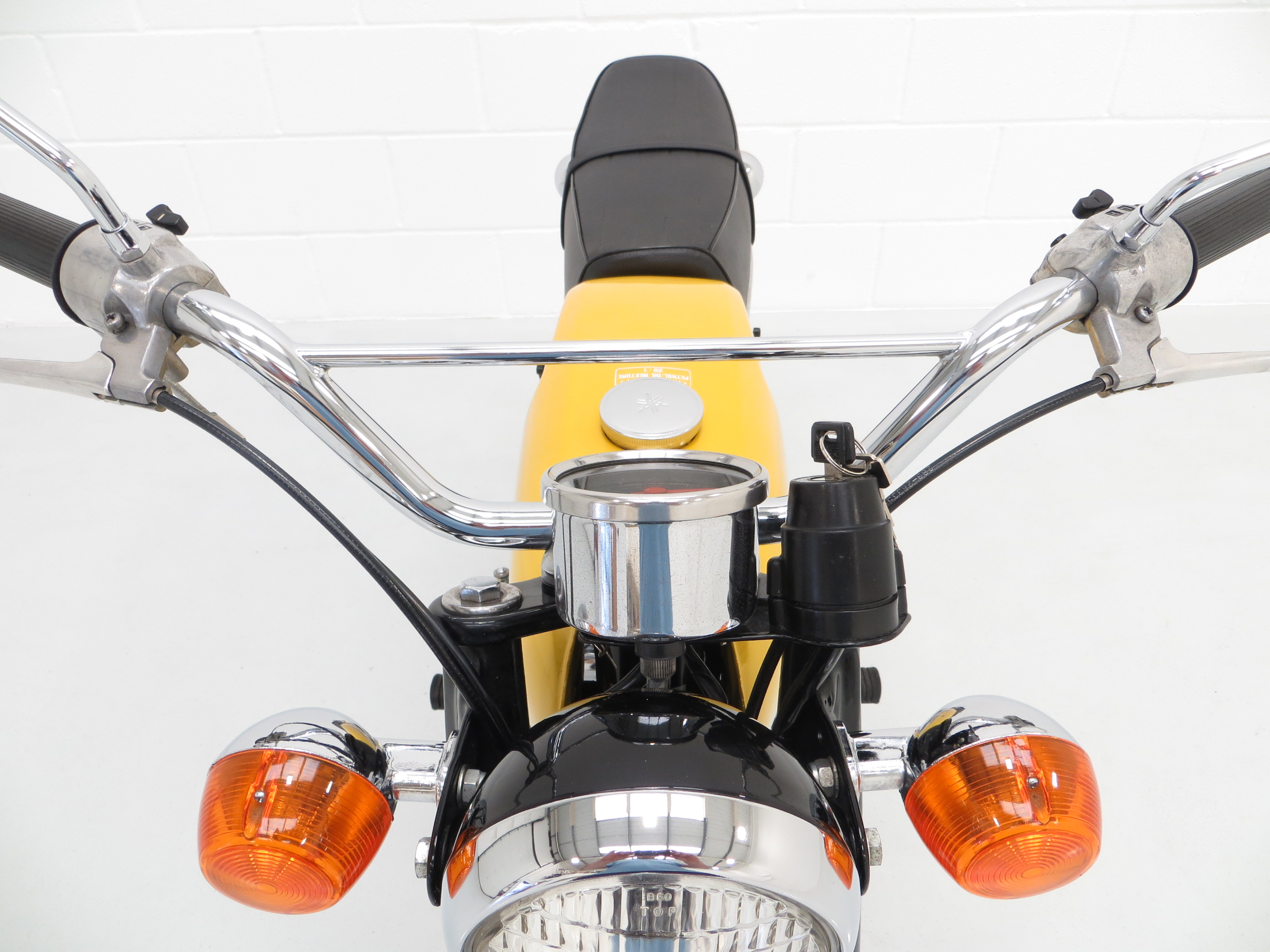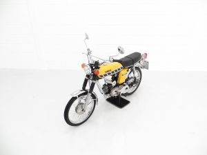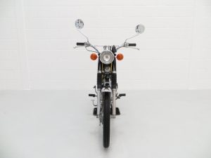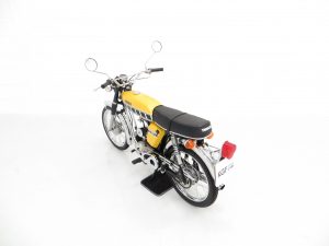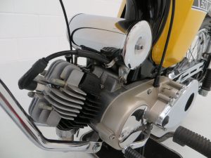 This wonderful example is finished in desirable Competition Yellow with correct tank and side panel decals. The superb paintwork pops beautifully in the sunlight and displays a uniform polished finish with no markings worthy of mention. The black tubular backbone type frame is pristine with the matching stock stamping clearly legible, and the trim pieces, chrome fitment, seat and lights are in excellent order. All lights, functions and controls operate as they should. The previous owner, an eclectic antiques expert, has made some alterations to suit his taste including a colour change from Baja Brown, addition of detachable chrome brace bars, removal of the pedals and a chrome replacement of the factory air box, with the standard items having been kept for the next owner. A hugely collectable bike that instantly became a teenage cult classic and remains as ever popular today.