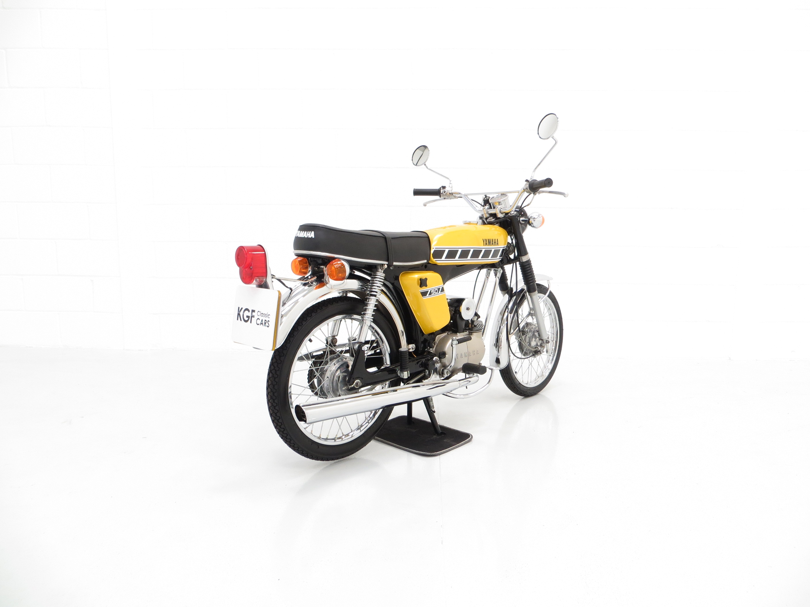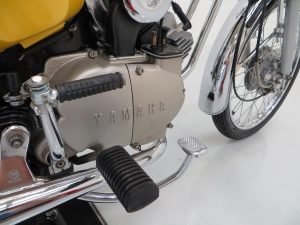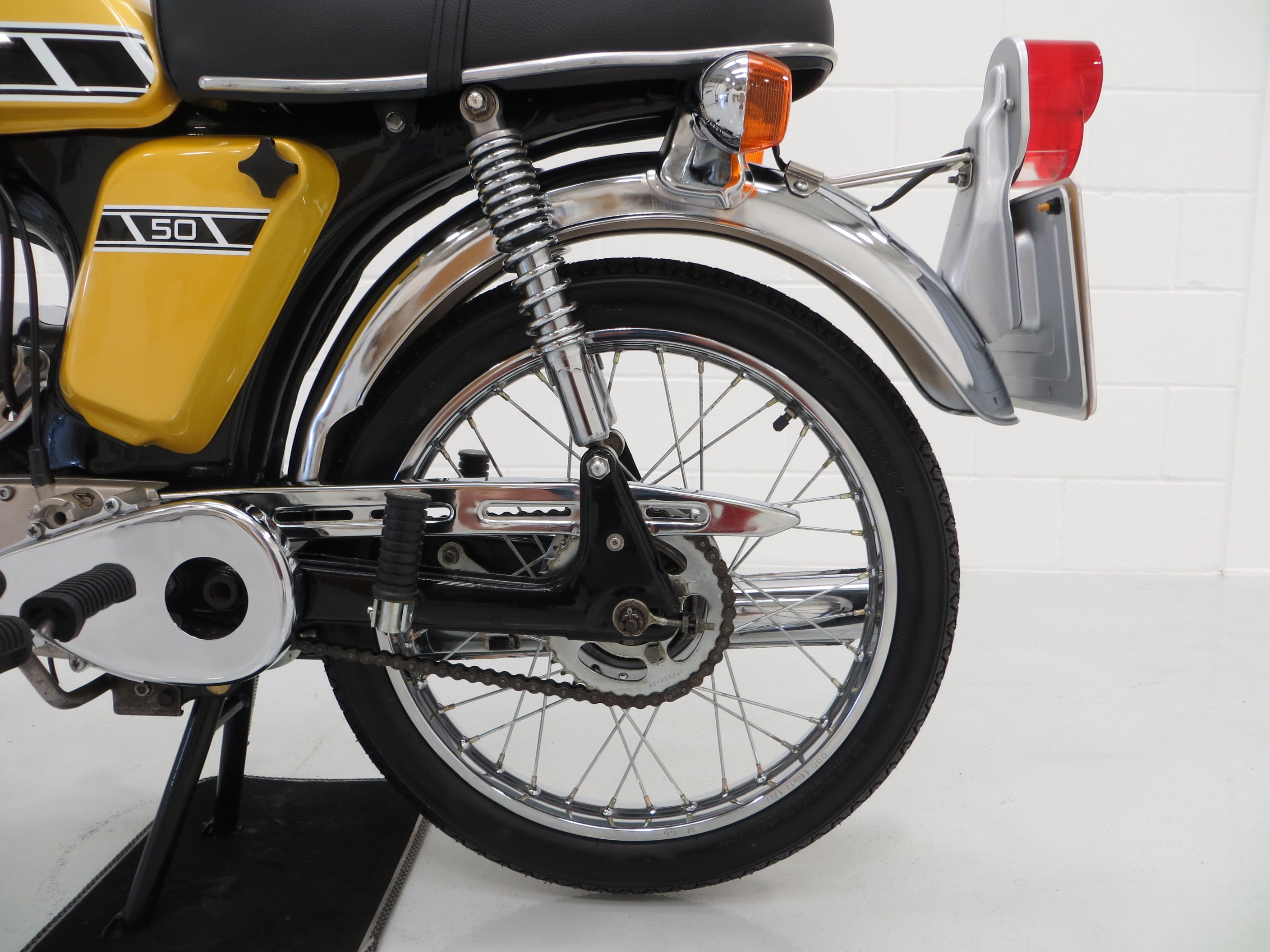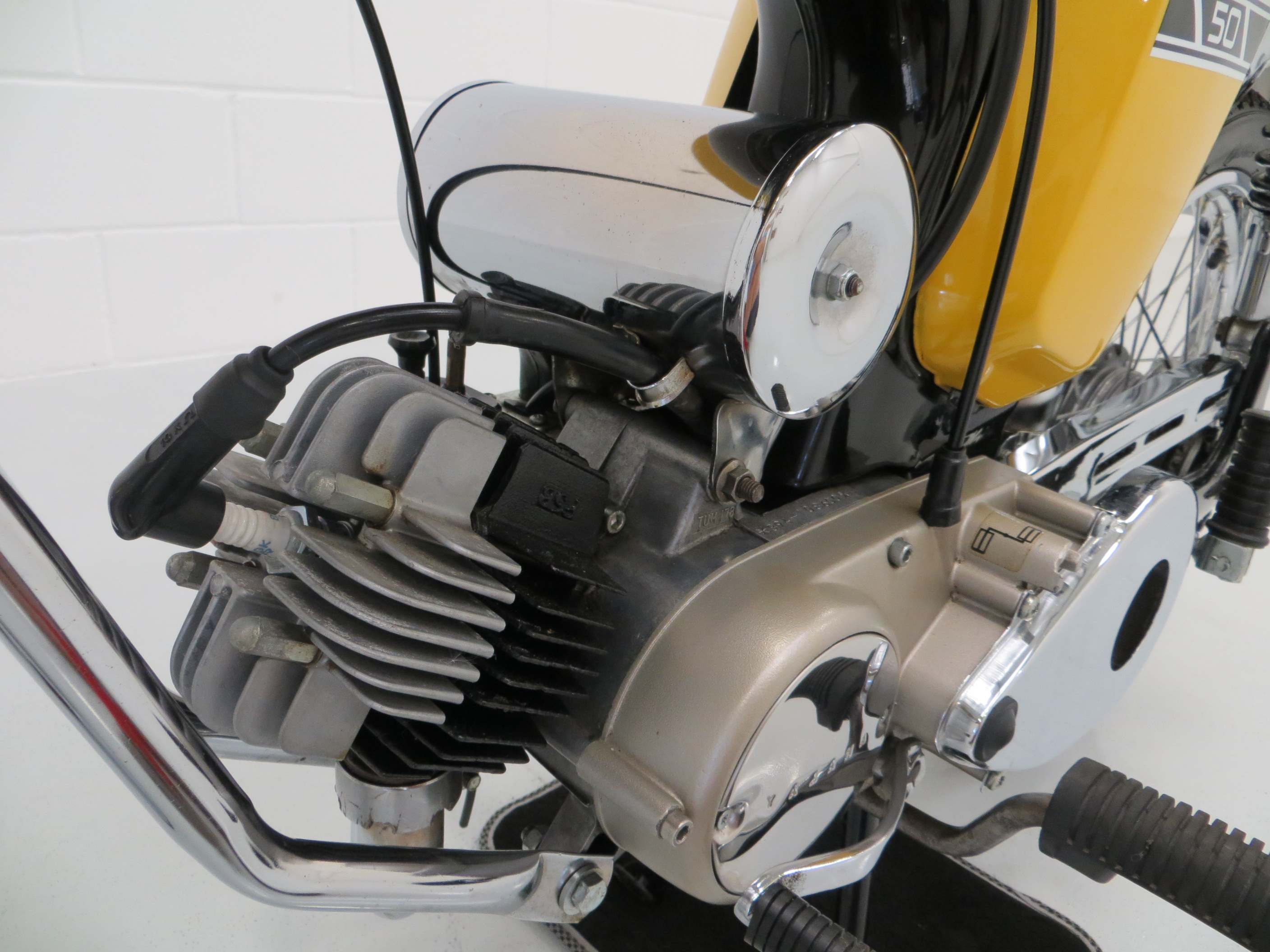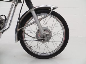 The original engine number stamping confirms this as a matching numbers machine. A single cylinder 2-stroke engine with Yamaha reed-valve torque-induction system has a 49cc displacement to produce 4.8hp at 7000rpm and 5.1lb-ft of torque at 6000rpm. Manufacturer marketing literature quotes a maximum speed range of 46mph, unrestricted of course for those wishing to ignore the 30mph limit imposed for UK riders! This example kicks into life effortlessly and performs wonderfully. The engine is spotlessly clean and the crank casing retains the high-polished finish and Yamaha lettering. The 4-speed ‘all down’ transmission with working neutral indicator is effortless in operation.