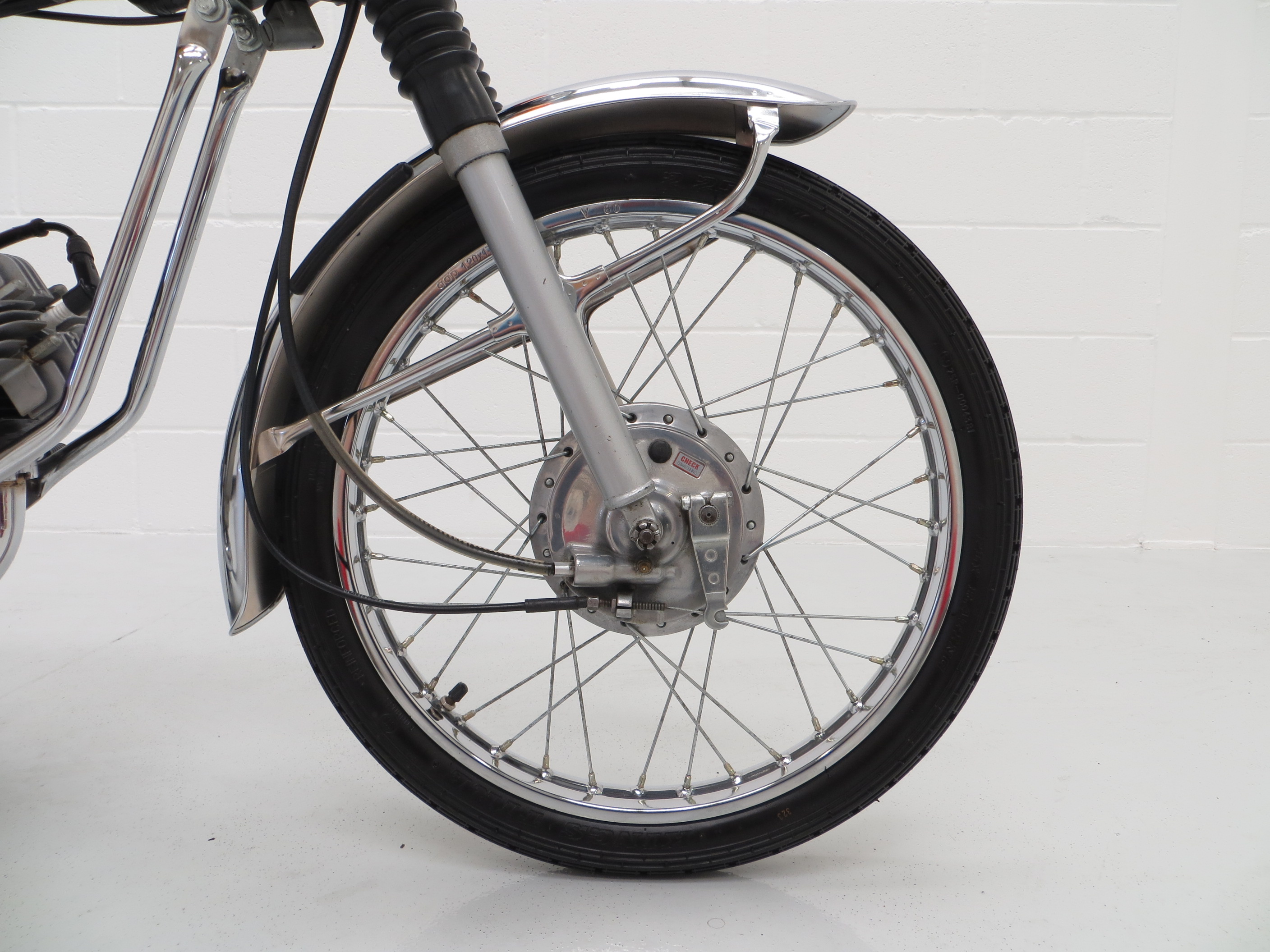 The original 36 spoke chromium plated wheel rims are unrestored and display outer rim stampings. 2.25-217 front and 2.50-17 rear tyres retain excellent tread and good rubber condition. Waterproof-Dustproof brakes with aluminium single leading shoe drums front and rear perform exactly as intended.