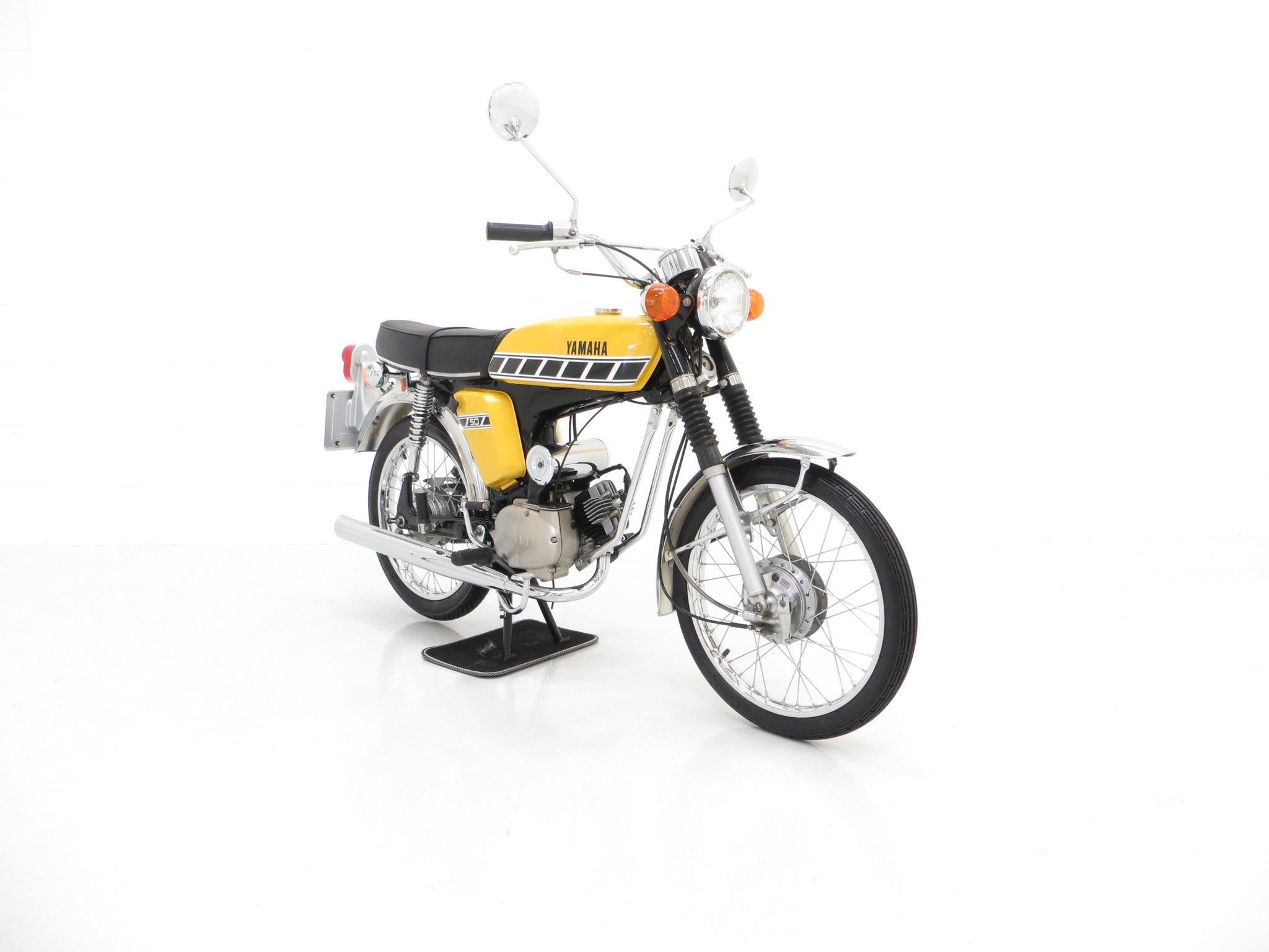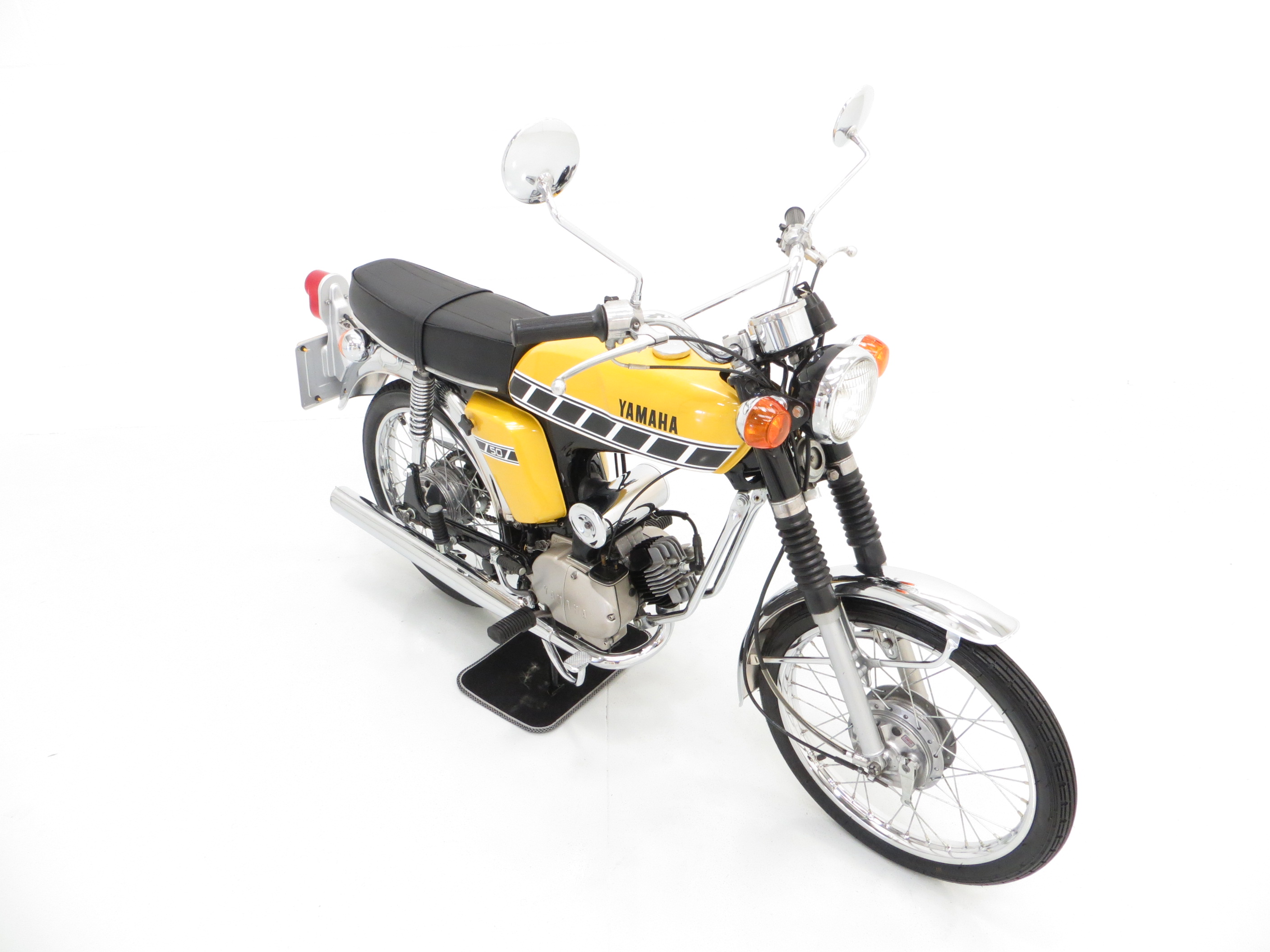 Pressed steel tubular backbone type frame, 26mm telescopic front forks, naked spring type rear cushion, Yamaha reed-valve torque-induction system, primary coupled kick-starter, chrome mudguards front and rear, chrome side repeaters, two chrome adjustable mirrors, Nippon Seiki speedometer, odometer, turn signal switch, headlight switch, neutral indicator, horn, large twin seat with assist strap, rear footrests, fuel valve with reserve, side storage locker.