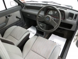 Special ‘pepperpot’ 13” X 6” alloy wheels are in excellent order and display prominent Ford emblems and raised part number markings. Matching branded 185/60 R13 have masses of tread. The spare alloy wheel still wrapped in the original Pirelli Cinturato P6 rubber sits in the boot wheel housing alongside the Ford jack which incorporates the correct ‘bulged’ rear lower valance designed to accommodate the enlarged alloy wheel compared with lower Fiesta models. The dual line servo assisted brakes with ventilated 9.4” front discs and 7.0” rear drums bring the car up to a steady, straight and assured halt.