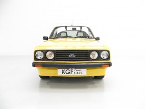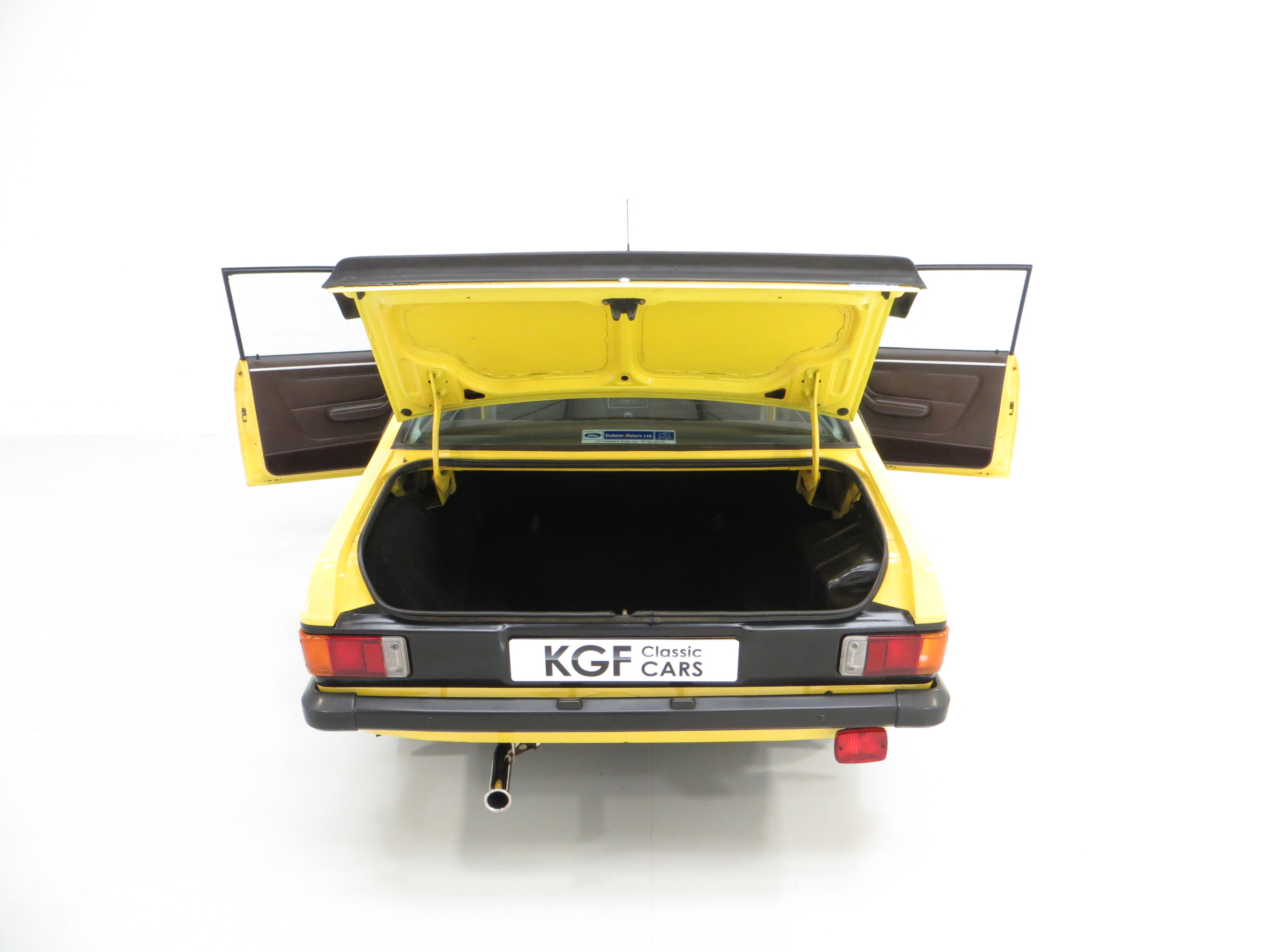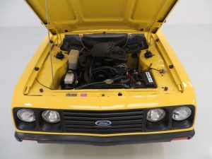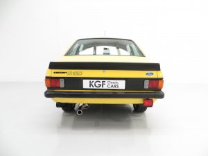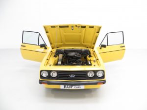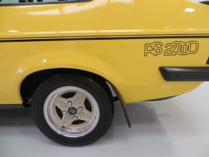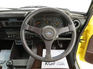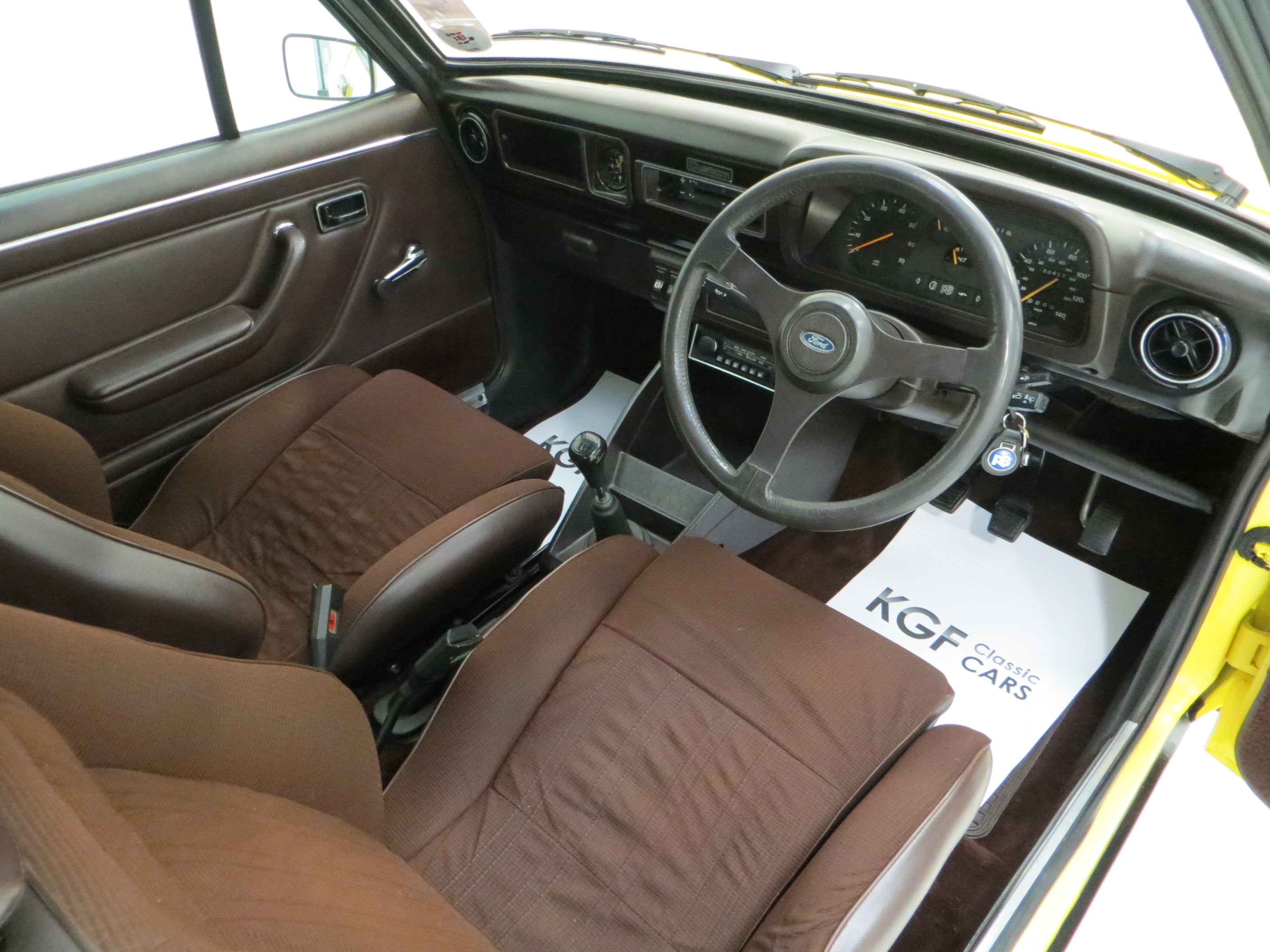 This excellent RS2000 finished in striking Signal Yellow, (Code 9), boasts a marvellous deep shine and uniform finish. The polyurethane droop snoot is straight and perfectly colour matched housing a set of four Cibie 60/55W quartz-halogen headlamps with three light stress marks. Genuine Altissimo rear light clusters and a Ford rear fog lamp remain fitted. Panel fit is excellent and the shut lines uniform. Worthy of mention are some micro blisters to the front air vent and one to the rear quarter. All trim sections, RS decals and badges remain intact and are in good order. The vehicle still has the correct colour coded fuel filler cap. A very usable and attractive RS2000, one for the avid blue oval enthusiast wanting to exploit maximum enjoyment from classic Ford ownership.