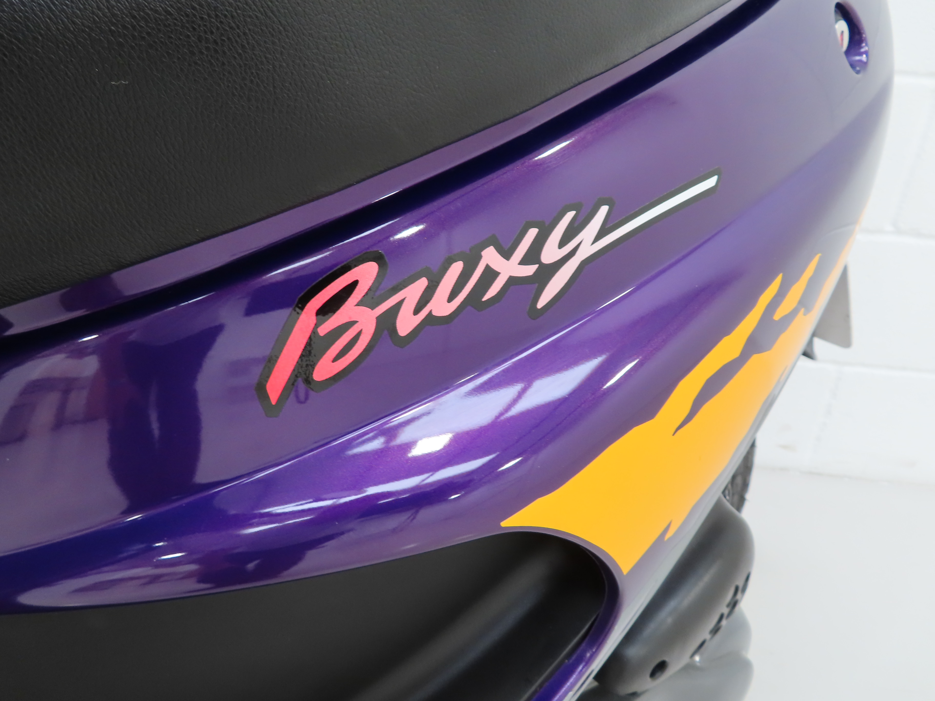 This Buxy in the original colour scheme Purple, (Code VK), is virtually perfect, commensurate with a bike covering just 21 miles with only a light scratch to the headlight faring. The rugged styled trim pieces and ‘Buxy’ decals are fully intact and damage free and all clips, nuts and bolts are excellent. The footboard, faring, rubbers and switchgear are all as new, as is the seat which lifts to reveal factory stickers intact as well as the original frame number stamp. An effortlessly stylish and beautifully preserved example, perfect for café culture fashionistas, or as the brochure suggests, riding through a stream while your friends watch and clap!