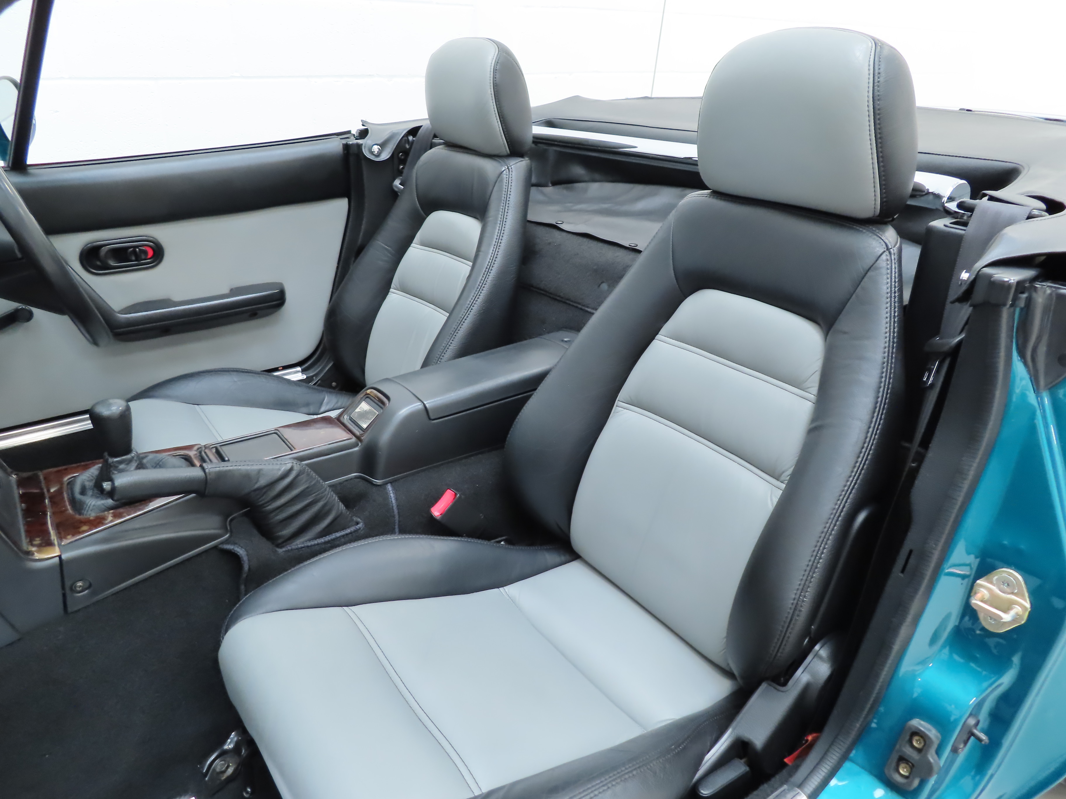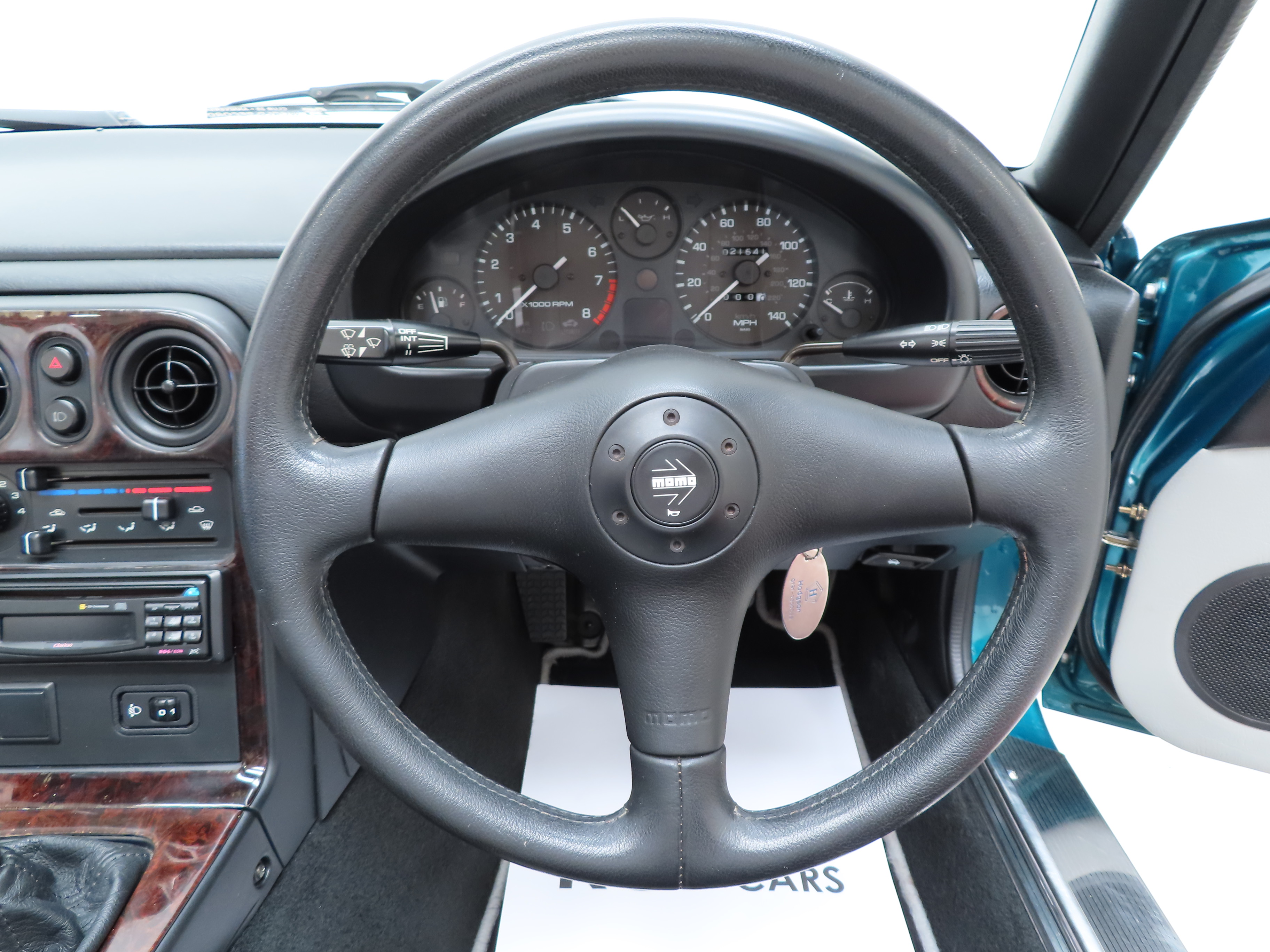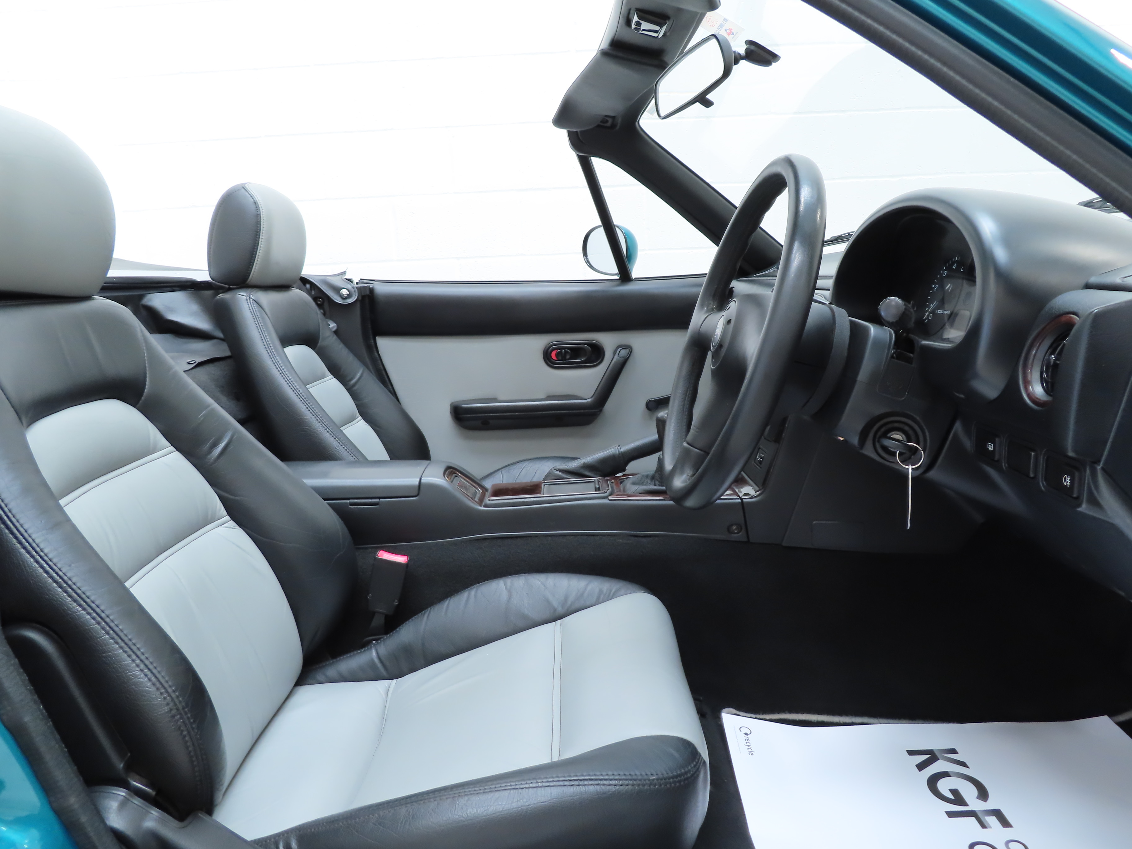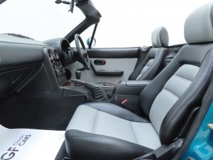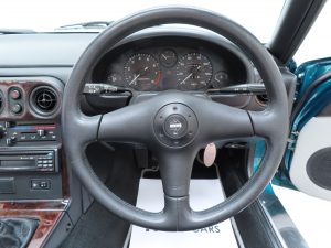 Standard and unique to the Berkeley Limited Edition is the Black and light Grey leather seat facings with matching light Grey door panels (Code NA3). Commensurate with the low 21,541 miles covered, the interior is beautifully clean and the seats retain correct shape with no damage. Again, absolutely all Berkeley Limited Edition interior features are present including the numbered plaque, (293/400), Momo leather steering wheel and carpet mat set in excellent order. The dashboard wears the original dark Burr wood trim which has discoloured slightly to the edges and further special features such as the suspension brace bar and stainless-steel scuff plates are present with some markings. A marvellous special edition MX-5 interior.