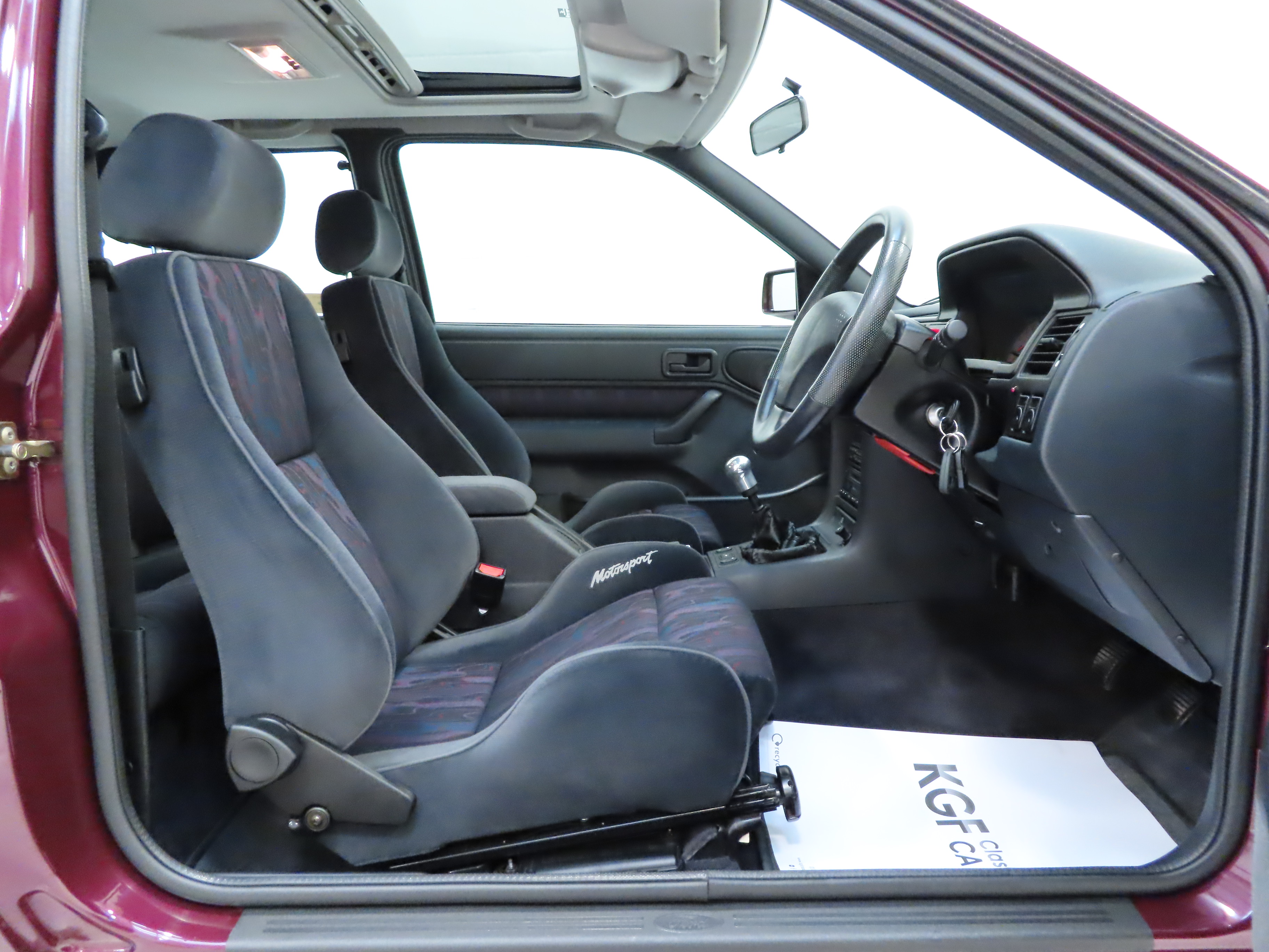 Body colour front bumper with black lower extension, front airdam, louvred bonnet air intakes, wing air extraction grilles, integral driving lights and fog lights, driver airbag, padded armrest with cassette storage, oil pressure gauge, turbo gauge, voltmeter, quartz digital clock with ambient temperature, electro-luminescent dials, Ford 2006 RDS radio/cassette, electrically operated and heated door mirrors, ‘Quickclear’ heated windscreen, heated washer jets, map pockets, rear centre armrest, rear head restraints, electric sunroof, electric windows, carpeted door bins. Monte Carlo equipment; OZ Racing alloy wheels, Monte silver decals, Recaro seats with motorsport logo, Recaro emblem on seat backrest, unique steering wheel, alloy gearknob with matching alloy handbrake button, numbered dash badge. Factory Options; CD Player Model 2040. Dealer accessories; Tailored Ford over mats.