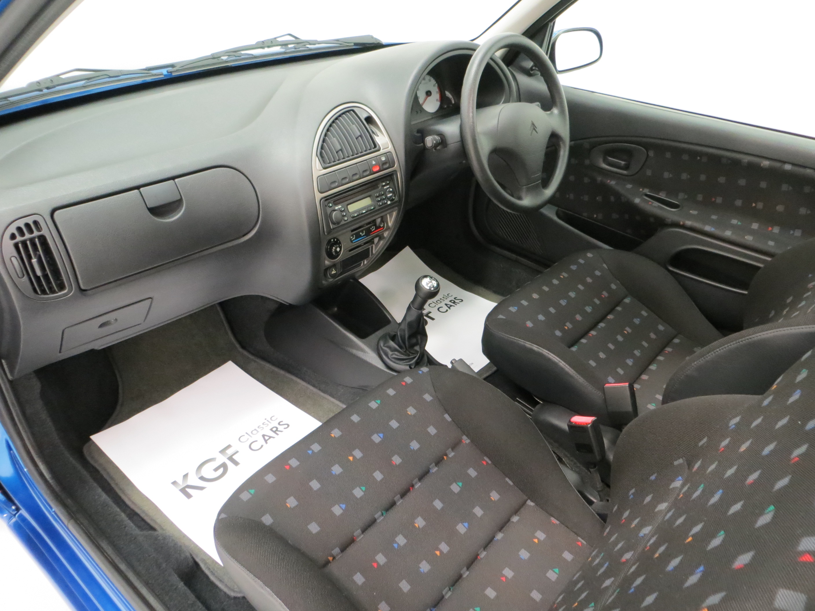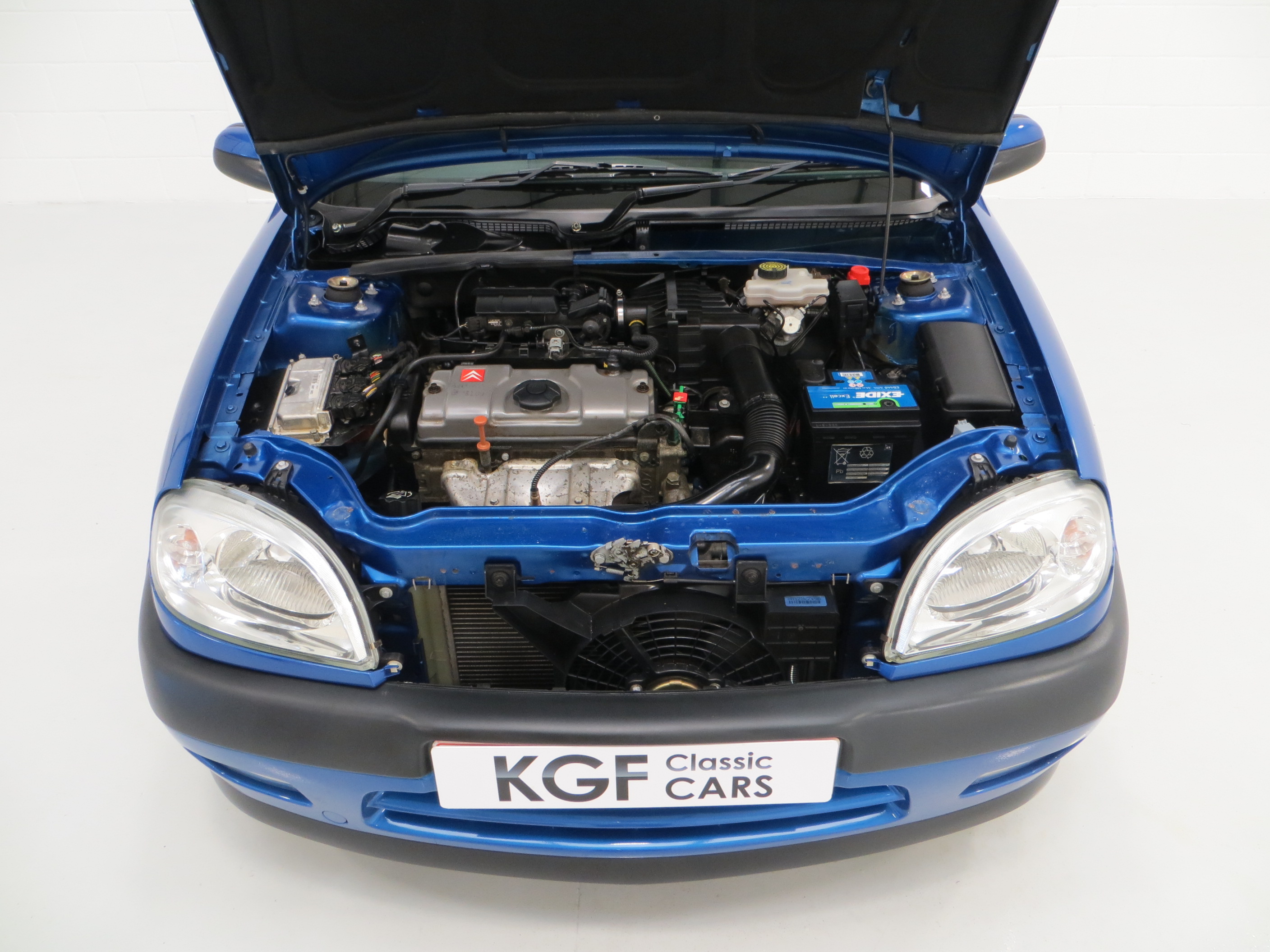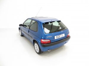 This outstanding VTR Hot Hatch is finished in factory optional and desirable Poseidon Blue Metallic, (Code KMH). Having covered just 29,938 miles from new this garaged and pampered example is simple stunning. The paint boasts a deep lustrous shine and incredibly, the lightweight factory panels and trim sections are undamaged, (the unladen weight is only 935kg!). There is a tiny rub to each door mirror edge and light distortion to the nearside rear lower plastic trim, utterly insignificant. Supplying Citroen main dealer number plates and Citroen rear screen sticker remain fitted. An unmolested marvel and near impossible to find in factory standard specification.