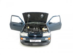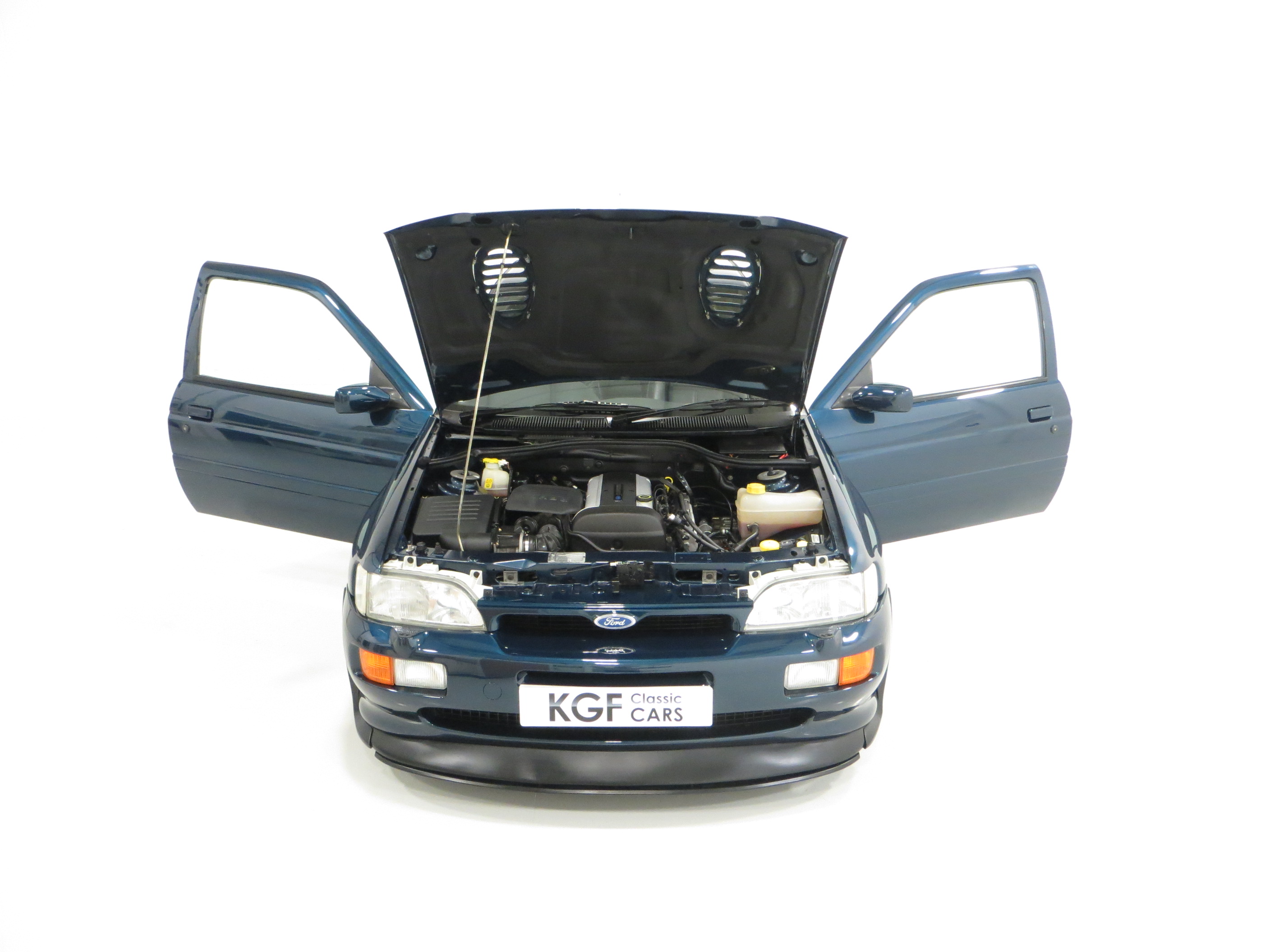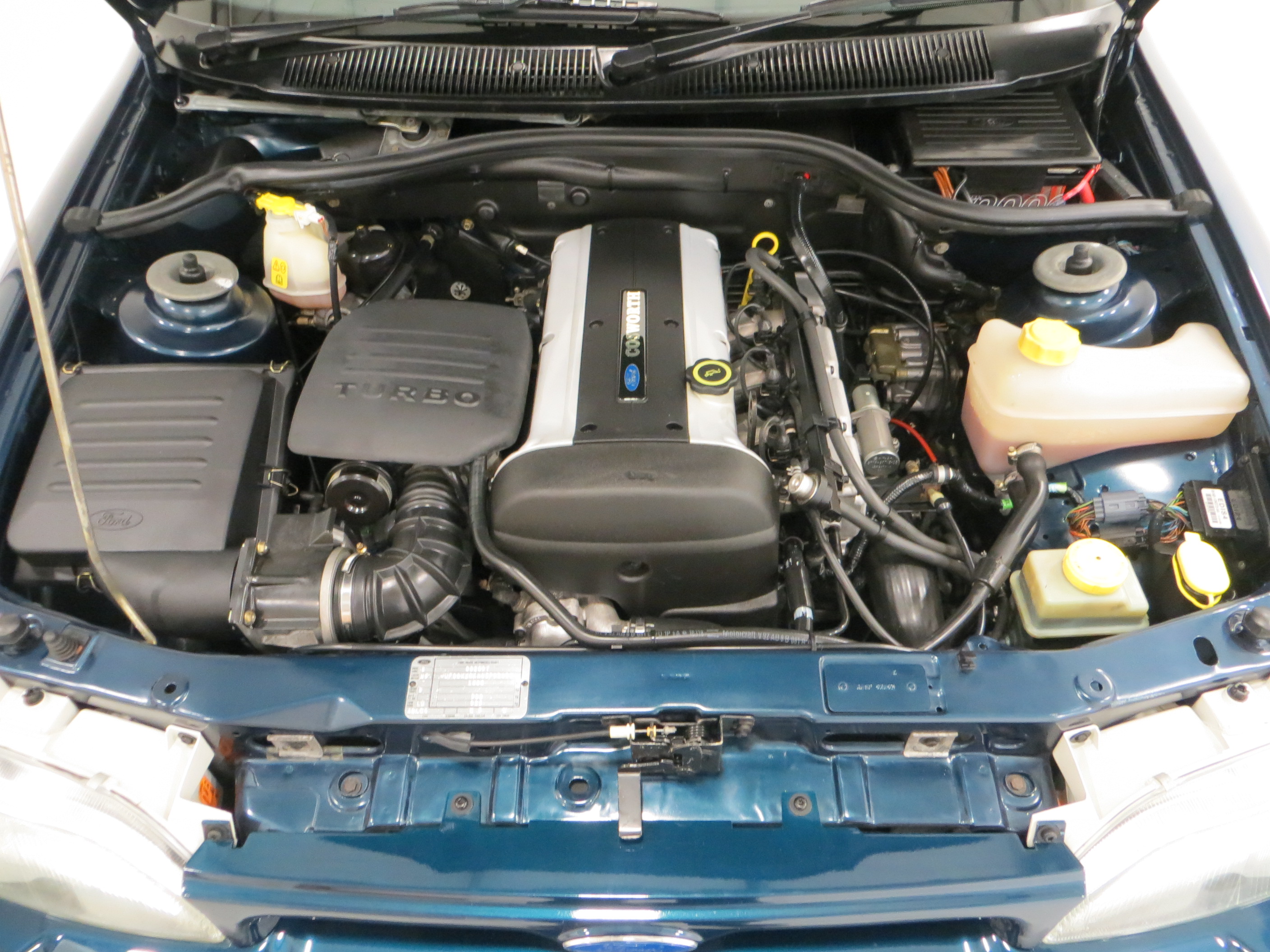 Body colour front bumper with black lower extension, front air dam, louvred bonnet air intakes, wing air extraction grilles, integral driving lights and fog lights, driver airbag, central double locking, padded armrest with cassette storage, oil pressure gauge, turbo gauge, voltmeter, quartz digital clock with ambient temperature, white sports dials, Ford 2007 RDS radio/cassette. Factory Options; Luxury Model comprising of electrically operated and heated door mirrors, ‘Quickclear’ heated windscreen, heated washer jets, three-spoke leather covered steering wheel, rear centre armrest, rear head restraints, electric sunroof, electric windows, carpeted door bins.